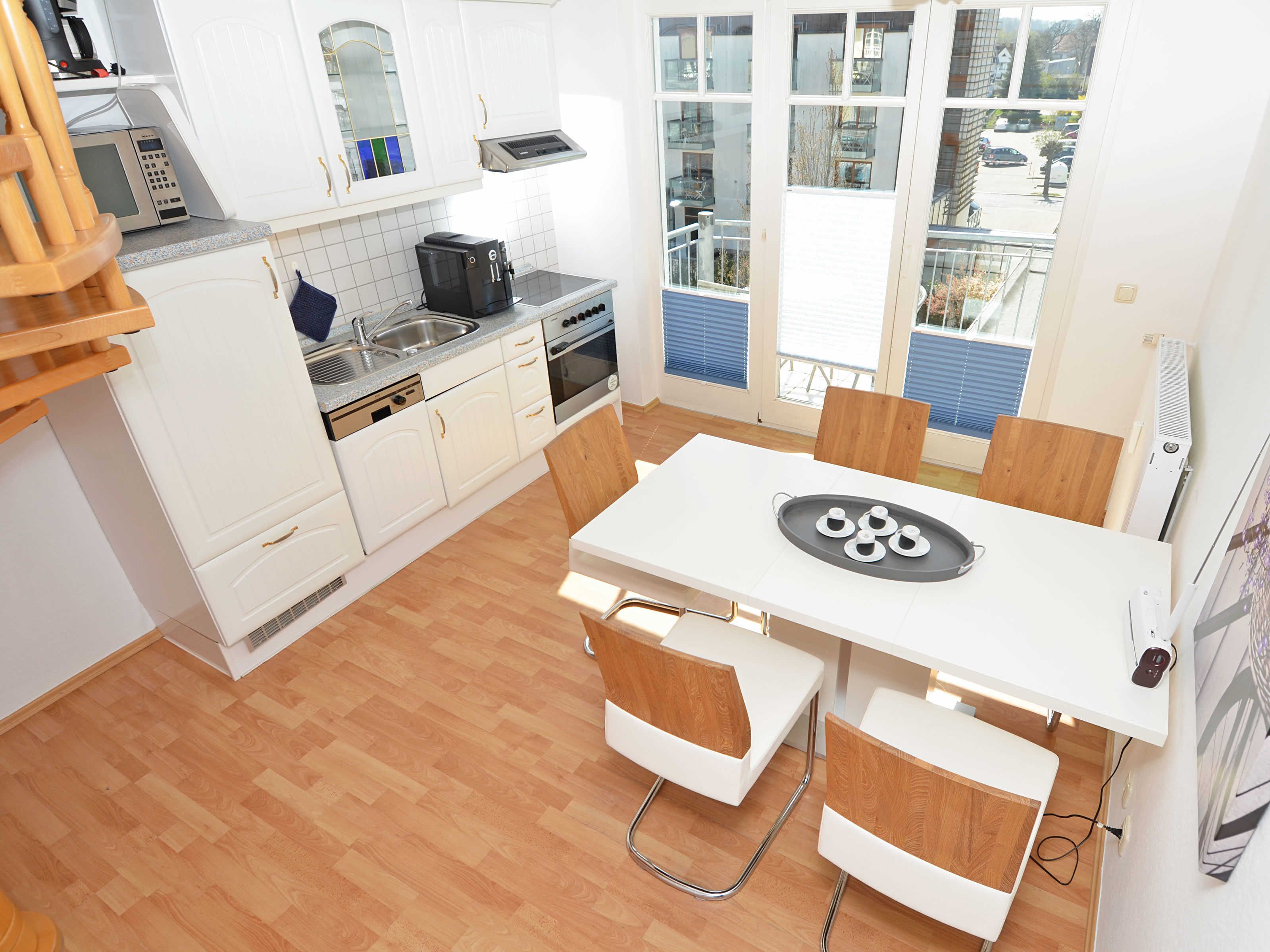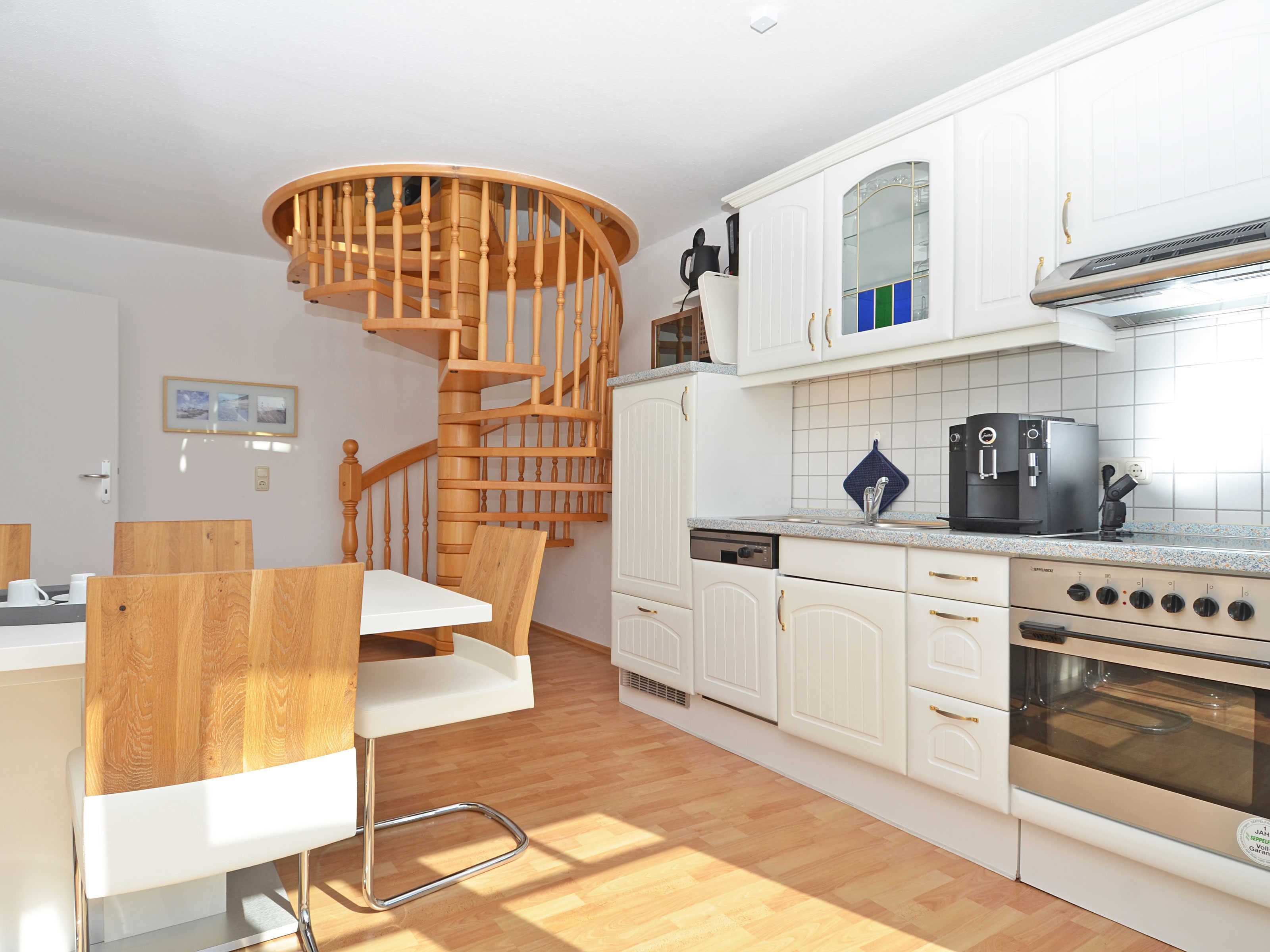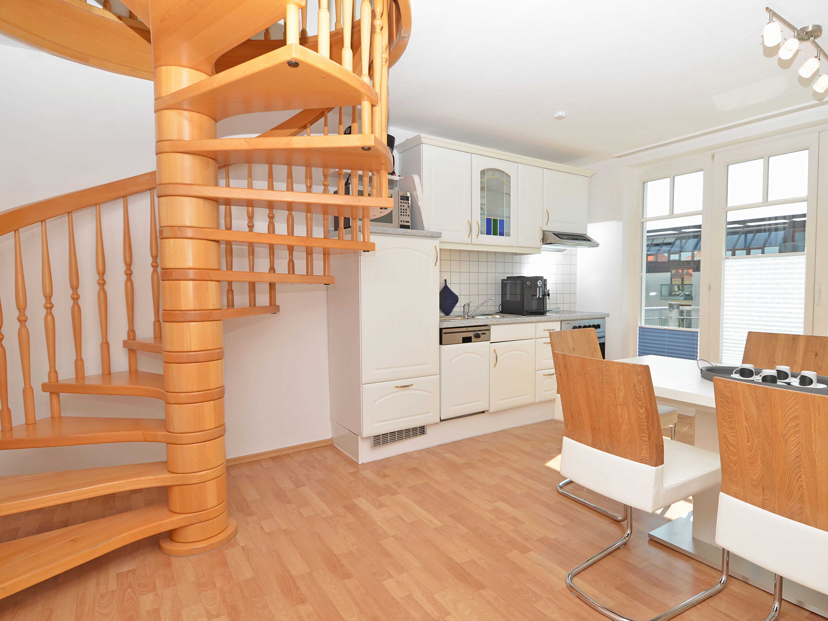 Im unteren Bereich des Appartements erwartet Sie der moderne Koch- und Essbereich. Die harmonisch integrierte Küchenzeile ist mit einem Kühlschrank mit Gefrierfach, einem 4-Zonen-Cerankochfeld, einem Backofen, einer Geschirrspülmaschine, einer Mikrowelle, Wasserkocher, Toaster und diversem Kleininventar ausgestattet. Aus dem Jura-Kaffeevollautomaten (inkl. Kaffee satt!) können Sie jederzeit frische Kaffeespezialitäten genießen gerne auch auf dem angrenzenden Balkon zur Südseite!