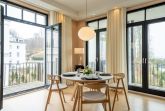 Das 111 m² große Appartement liegt im dritten Stock der Villa Philine und ist auch über einen Fahrstuhl zu erreichen. Vom Eingangsbereich aus betreten Sie den großzügigen Wohnraum mit Koch-, Ess- und Relaxbereich, der Ihnen entspannte Stunden auf der bequemen freistehenden Couch oder auch anregende Gespräche am runden Esstisch ermöglicht. An kühleren Tagen sorgt das prasselnde Feuer des Kaminofens für behagliche Stimmung.
