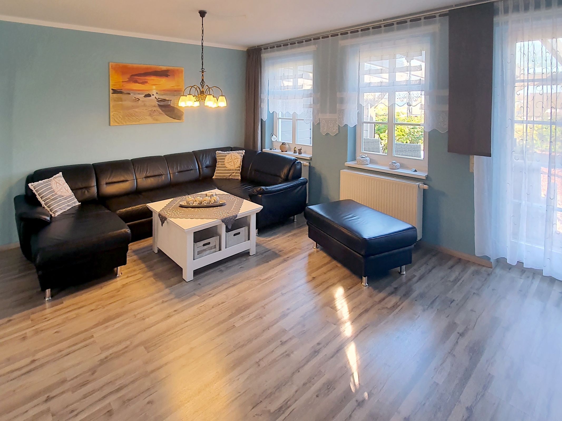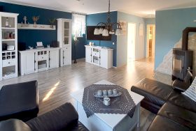 Im Erdgeschoss verfügt das angenehm helle Haus über ein großzügiges Wohnzimmer, das mit einem Couchtisch, einer gemütlichen Couchecke mit einem Kaminofen, einem großformatigen Flachbild-TV sowie einer Stereoanlage mit CD-Player ausgestattet ist. W-LAN ist im gesamten Haus verfügbar. Kaminholz befindet sich im Schuppen (Kasse des Vertrauens) bzw. kann im örtlichen Einzelhandel erworben werden.