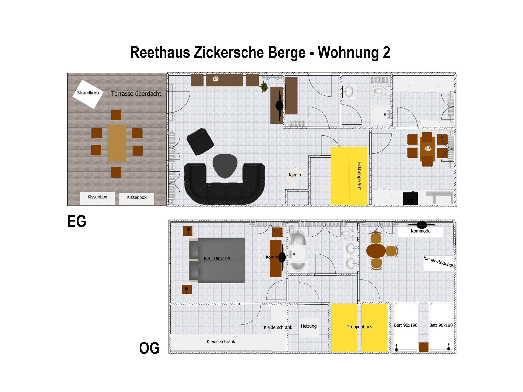 Im Obergeschoss finden Sie ein zweites Badezimmer, ausgestattet mit einer Bade-/Duschwanne, WC, Doppelwaschbecken und Haartrockner sowie zwei Schlafzimmer. Eines der Schlafzimmer unter gemütlichen Dachschrägen gewährt Ihnen einen direkten Blick auf den Bodden und ist mit einem komfortablen Doppelbett, einem Flachbild-TV mit DVD-Player incl. einer Auswahl an DVDs sowie einem großzügigen begehbaren Kleiderschrank nebst Safe für Ihre Wersachen ausgestattet.