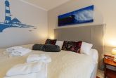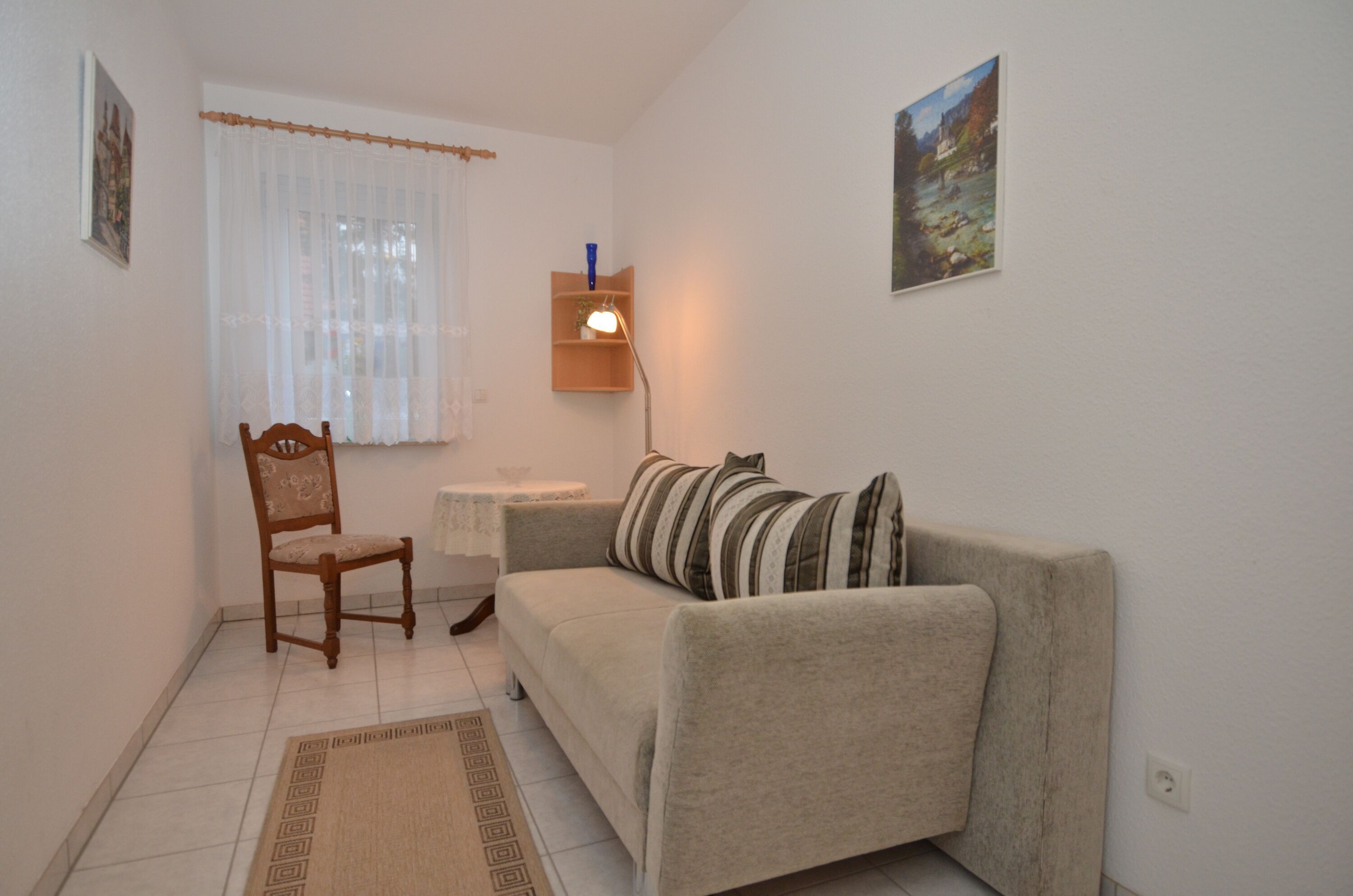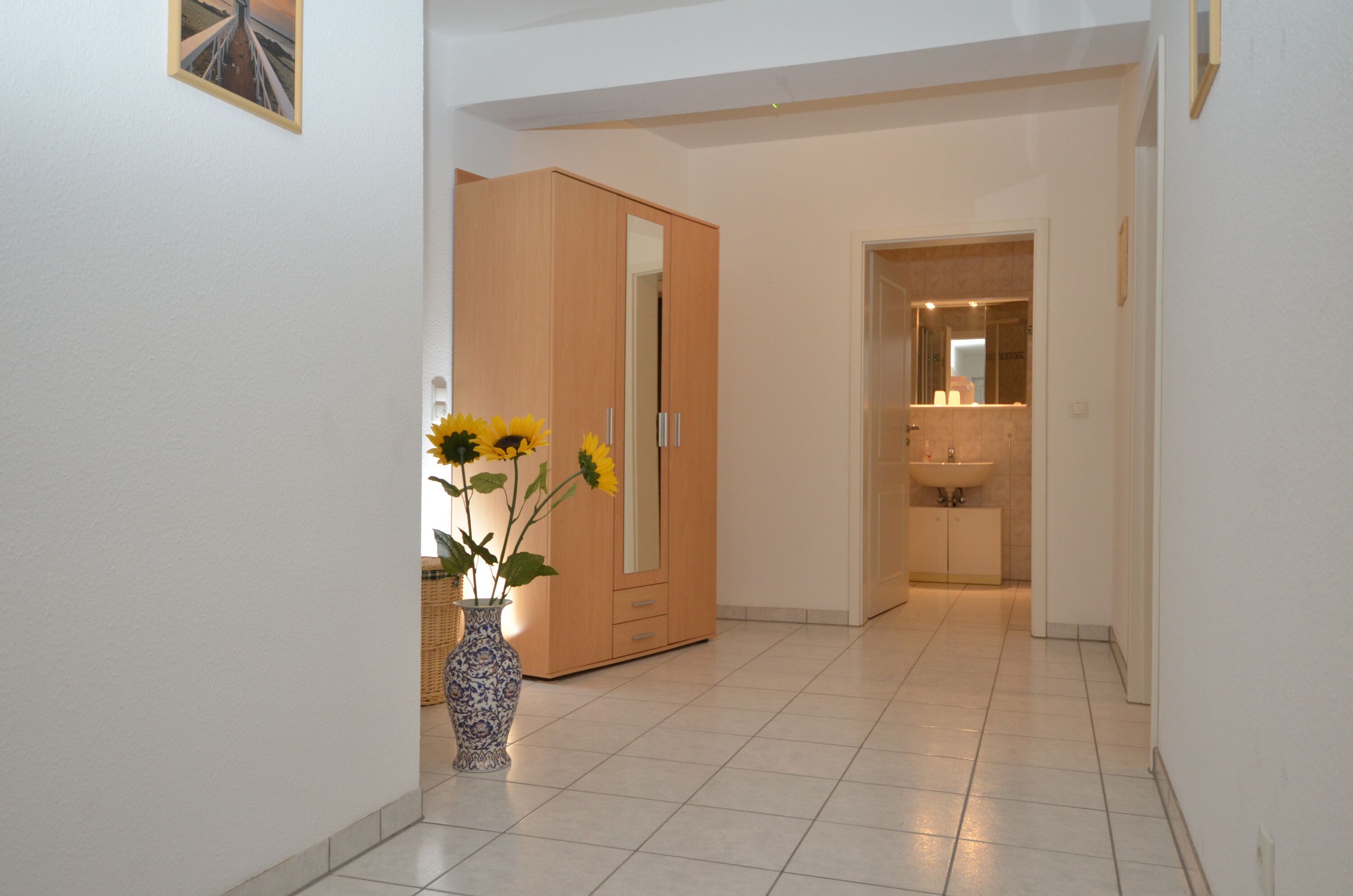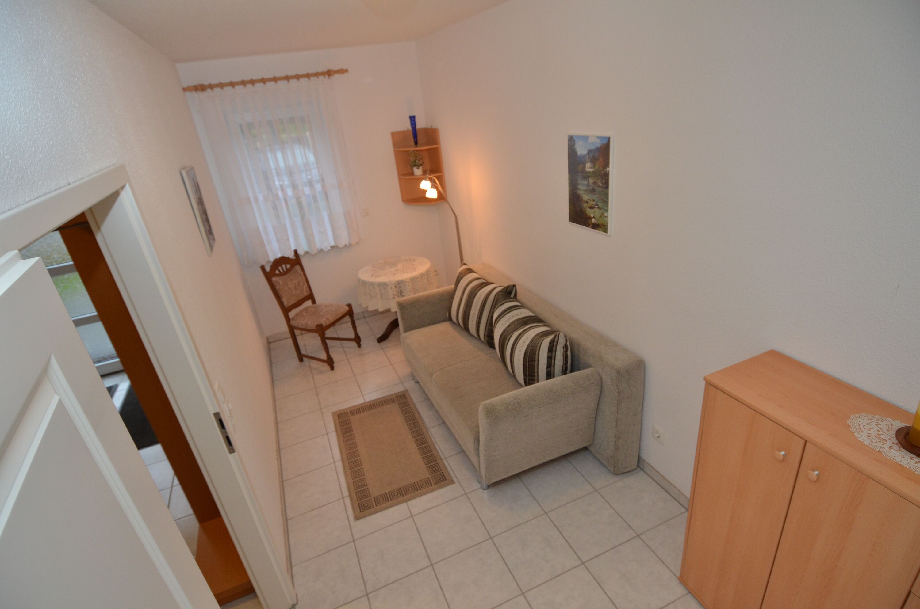 Über den Flur gelangen Sie zum zweiten Schlafzimmer des Appartements mit einer ausklappbaren Schlafcouch für eine Person und einer Kommode. Alle Böden des Appartements sind gefliest.