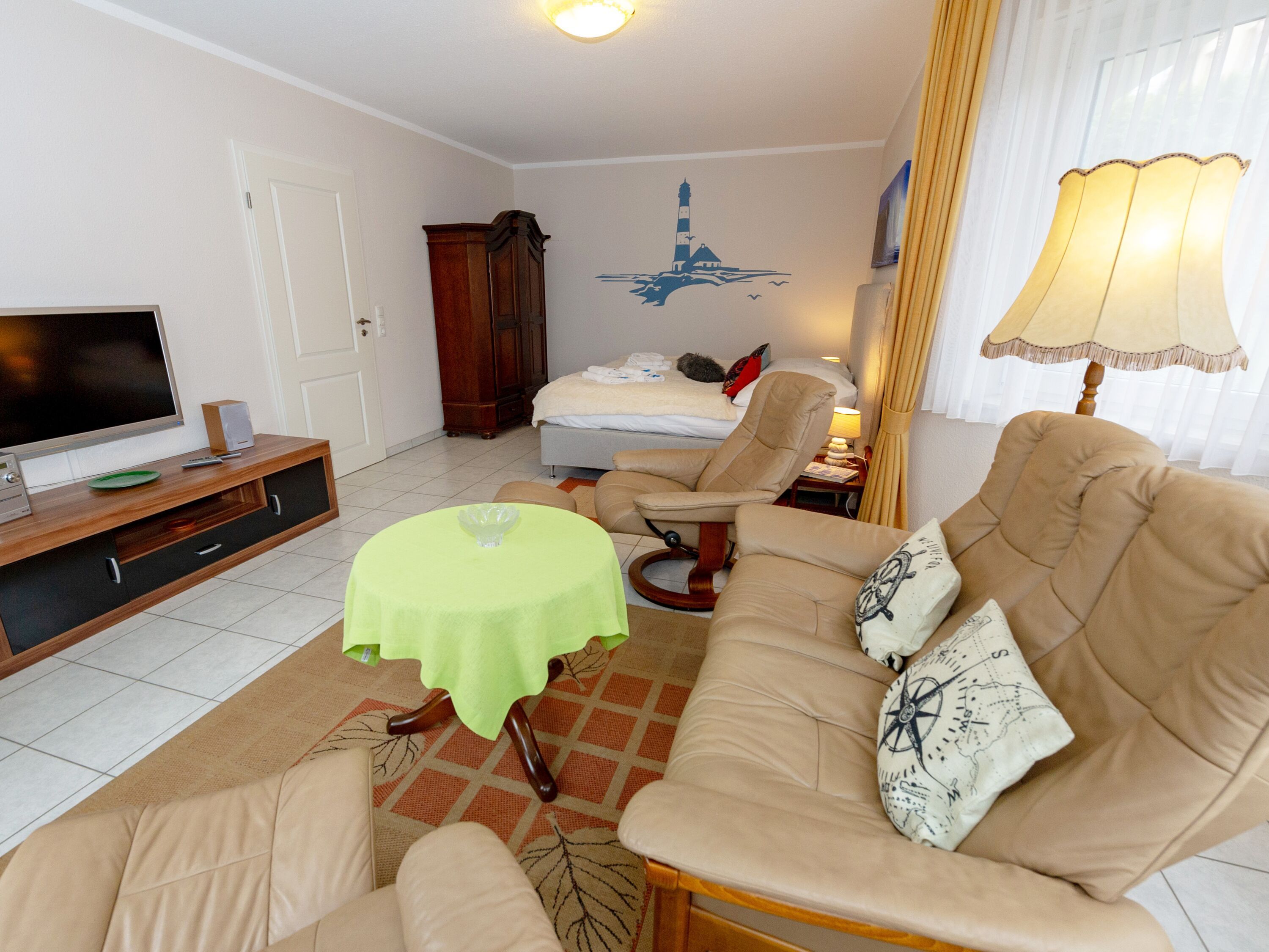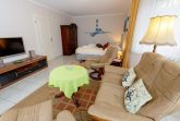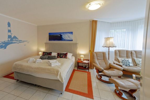 Die Wohnung 2 im Erdgeschoss des Einfamilienhauses präsentiert sich als ein gemütlich eingerichtetes 2-Raum-Appartement mit ca. 70m² Wohnfläche. Das große Erkerzimmer beherbergt auf großzügigen 24m² einen kombinierten Wohn- und Schlafbereich. Im Schlafbereich befinden sich ein komfortables Doppelbett und ein Kleiderschrank mit genügend Stauraum für Ihre Urlaubsgarderobe.