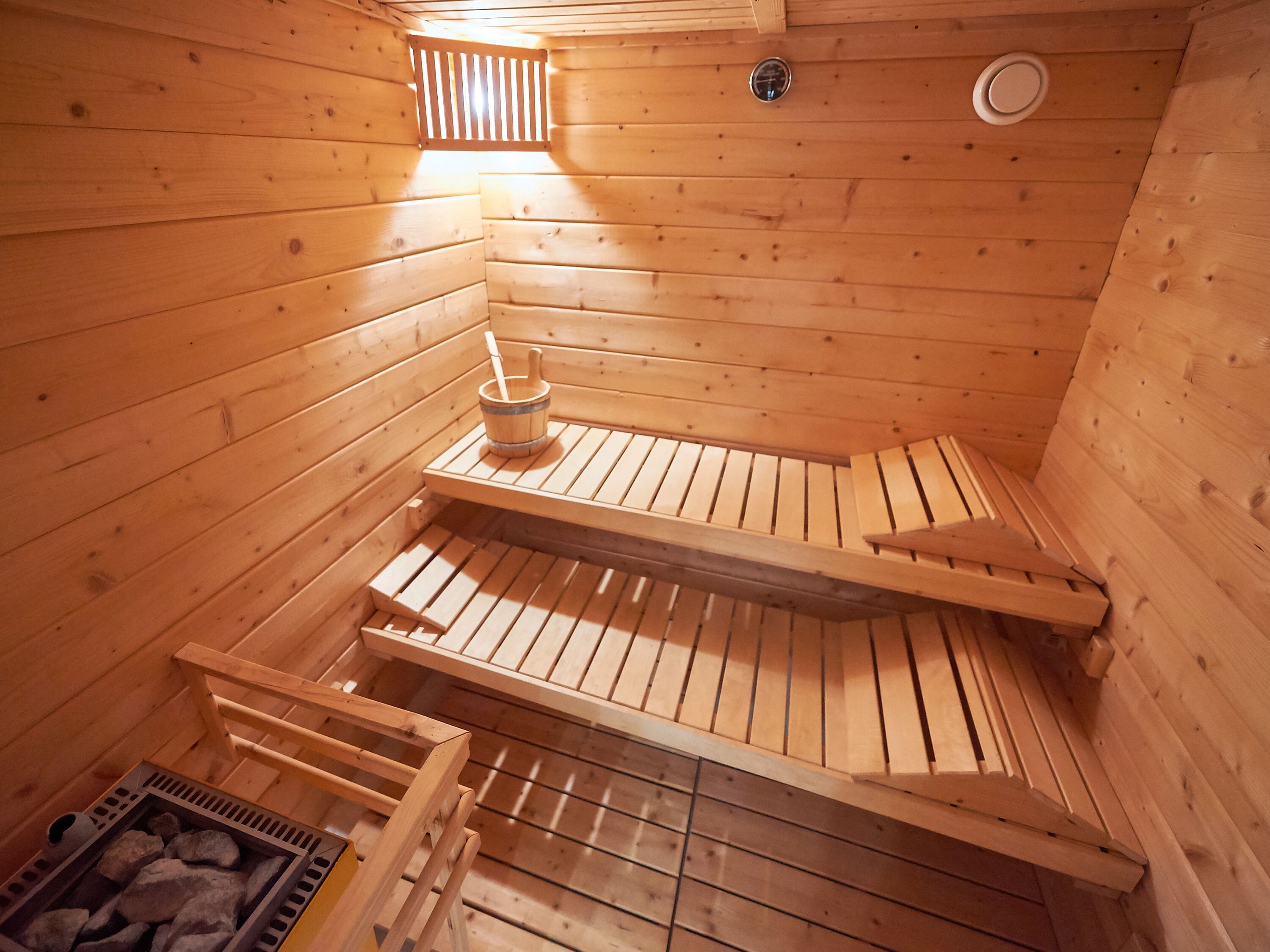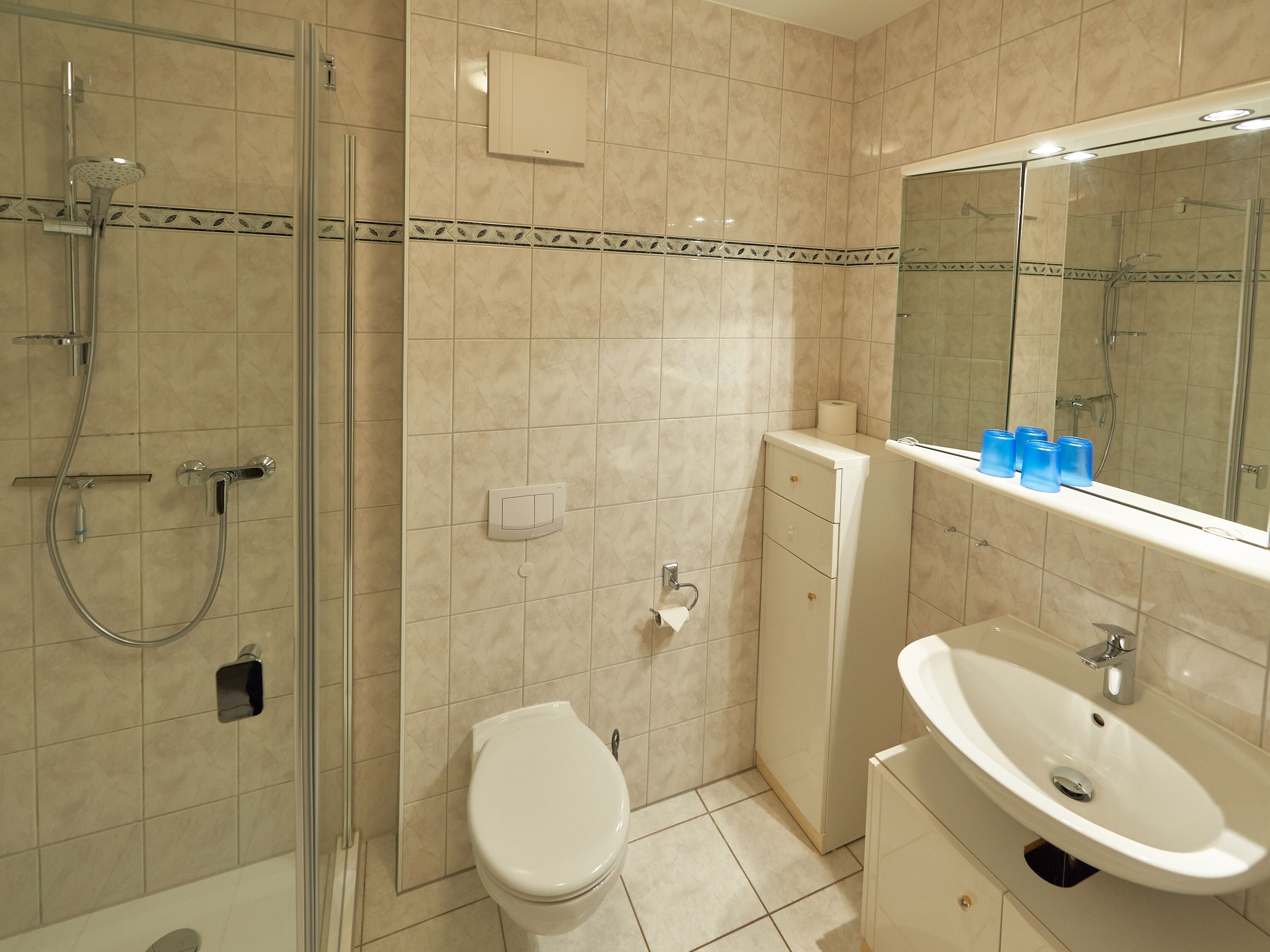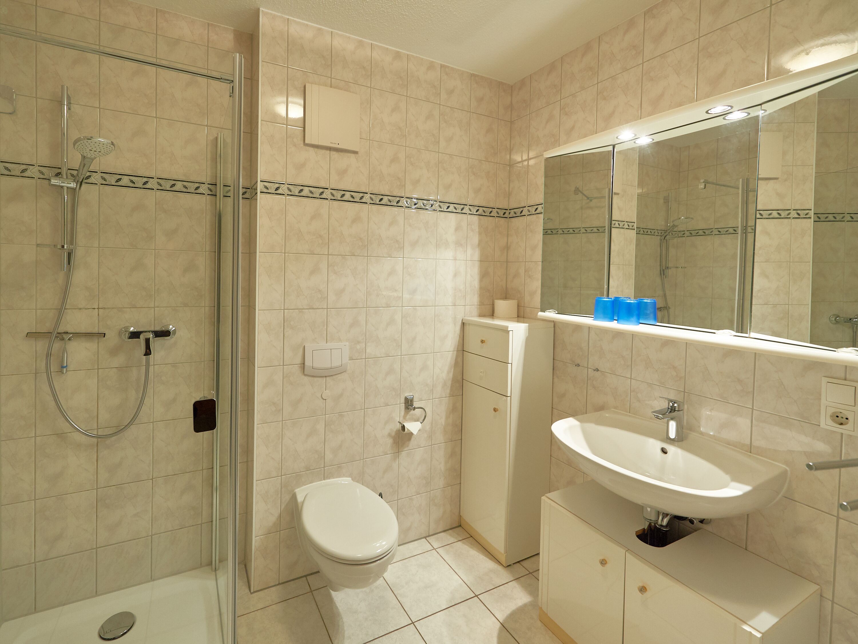Das Badezimmer ist mit einer ebenerdigen Dusche, WC und Waschbecken eingerichtet. Daneben befindet sich Ihre ganz private Finnische Sauna, die Sie ganz nach Belieben nutzen können.