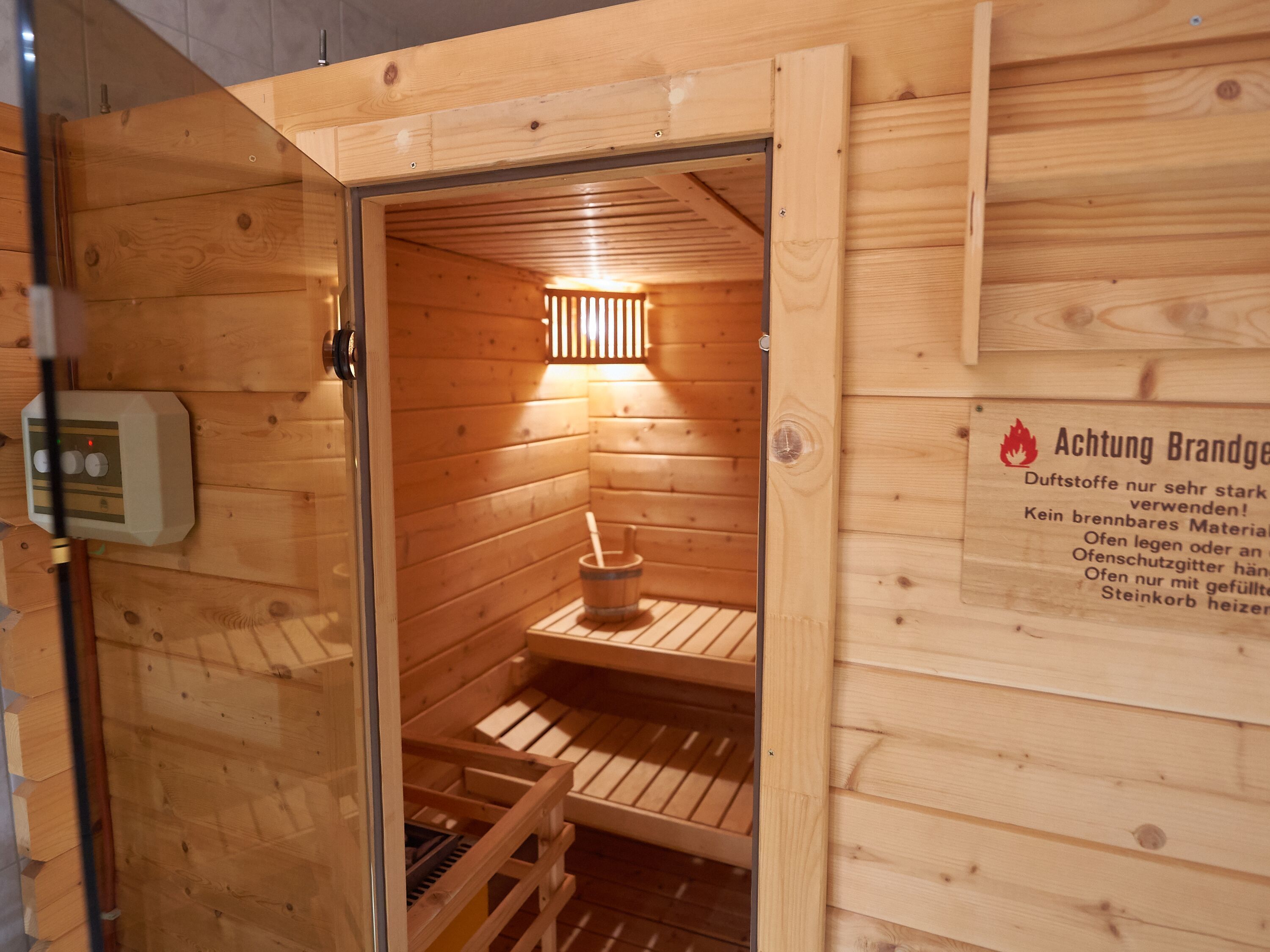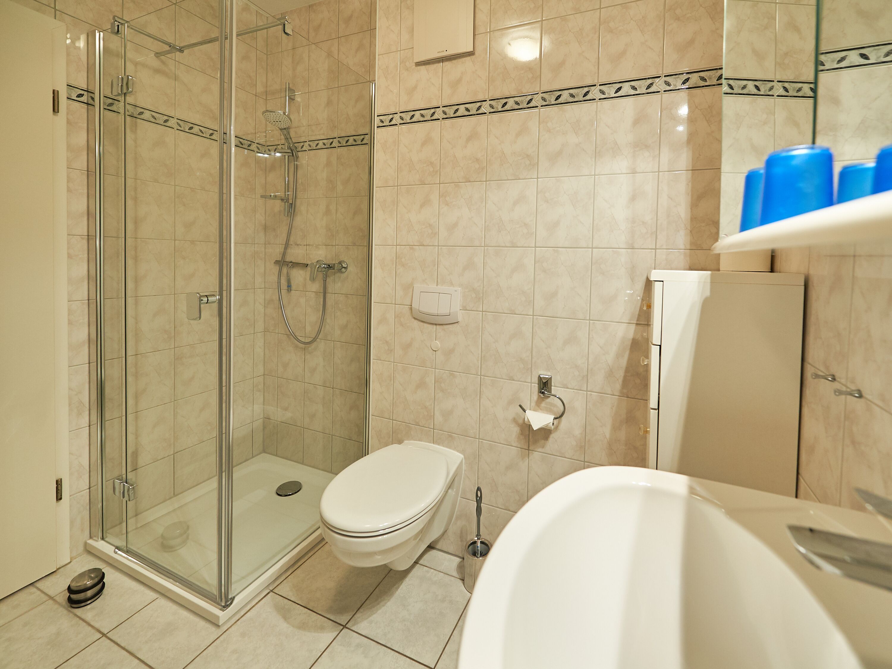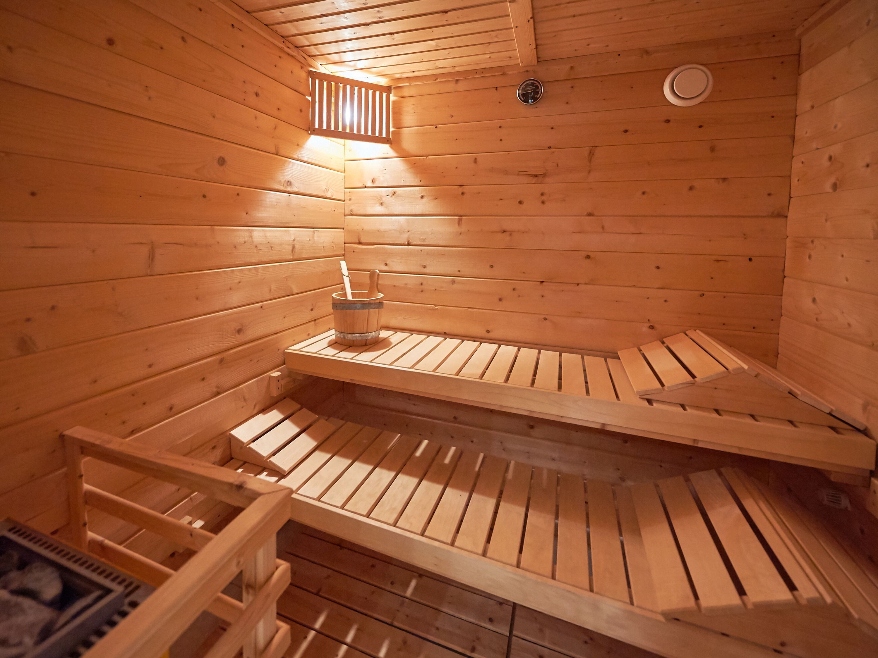 Das Badezimmer ist mit einer ebenerdigen Dusche, WC und Waschbecken eingerichtet. Daneben befindet sich Ihre ganz private Finnische Sauna, die Sie ganz nach Belieben nutzen können.