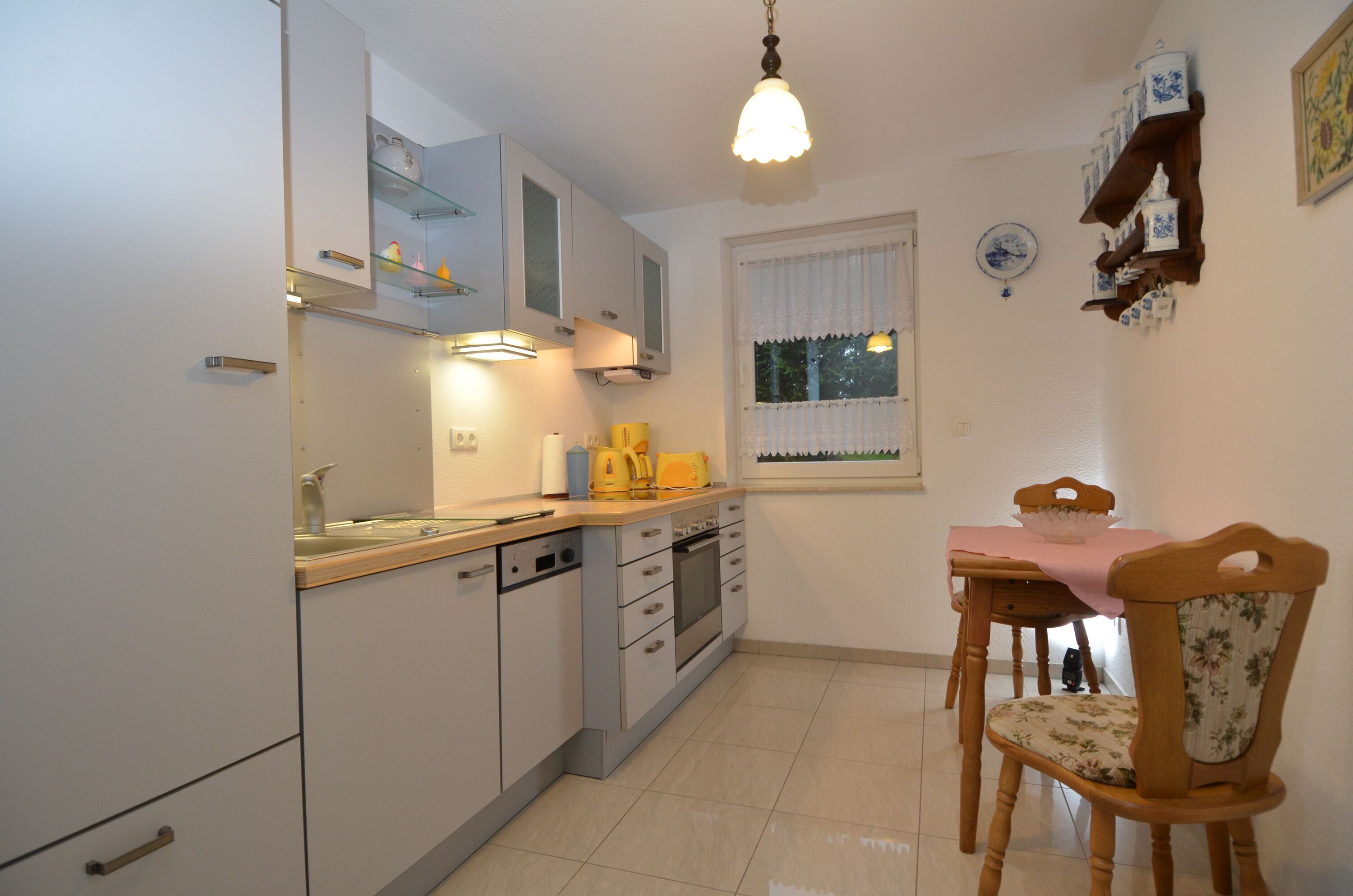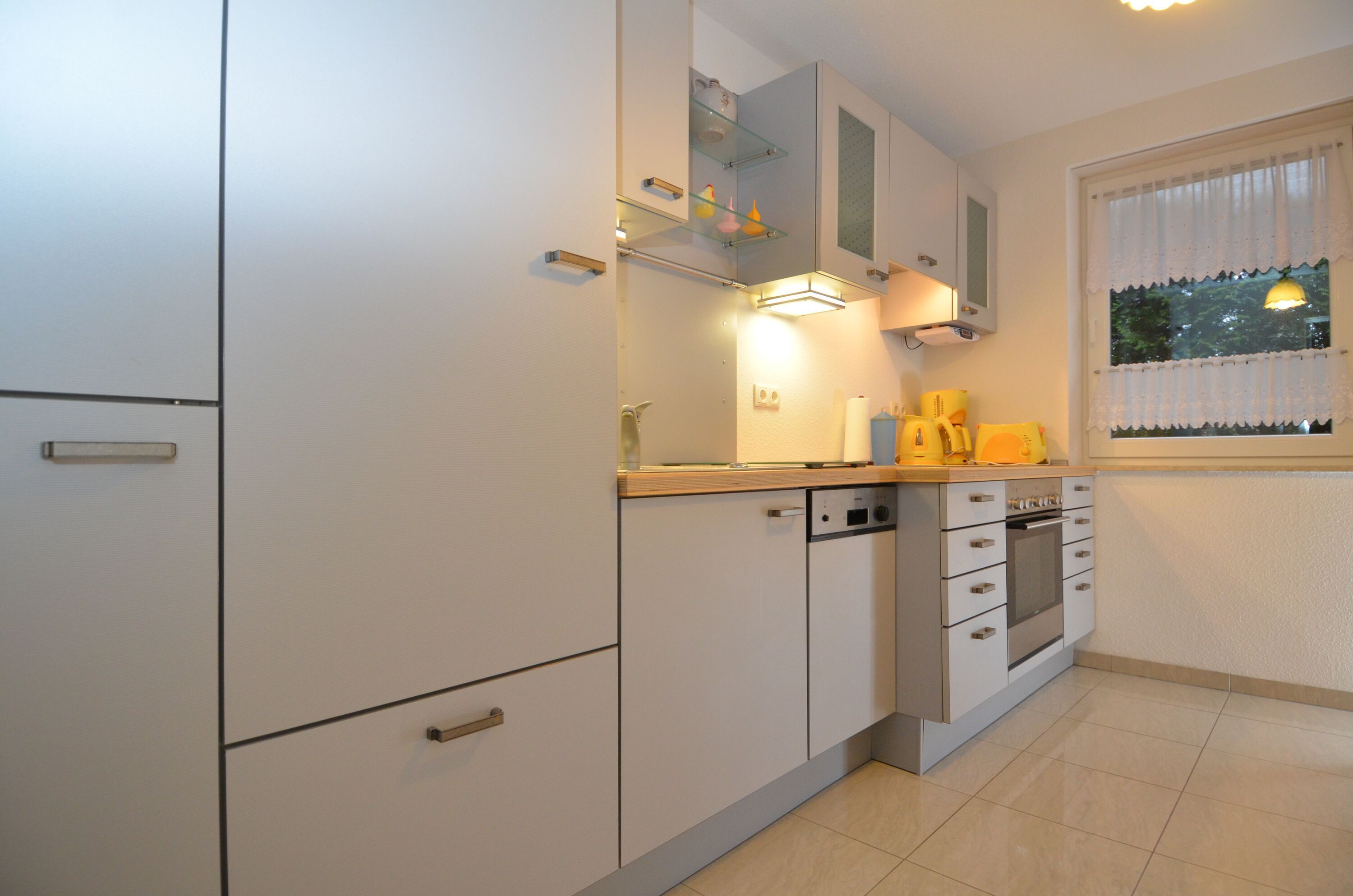 Die separate Küche ist modern eingerichtet mit einem 4-Zonen-Cerankochfeld, einem Backofen, einer Geschirrspülmaschine, einem Kühlschrank, einer Kaffeemaschine, einem Wasserkocher, einem Toaster und diversem Kleininventar, welches die gute Ausstattung komplettiert.