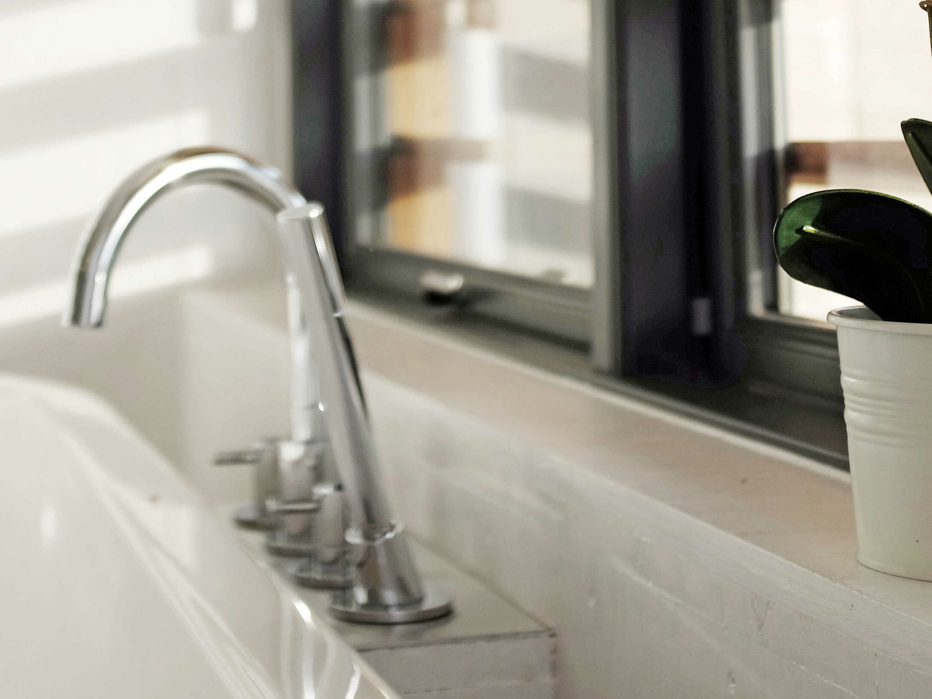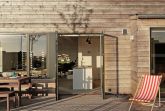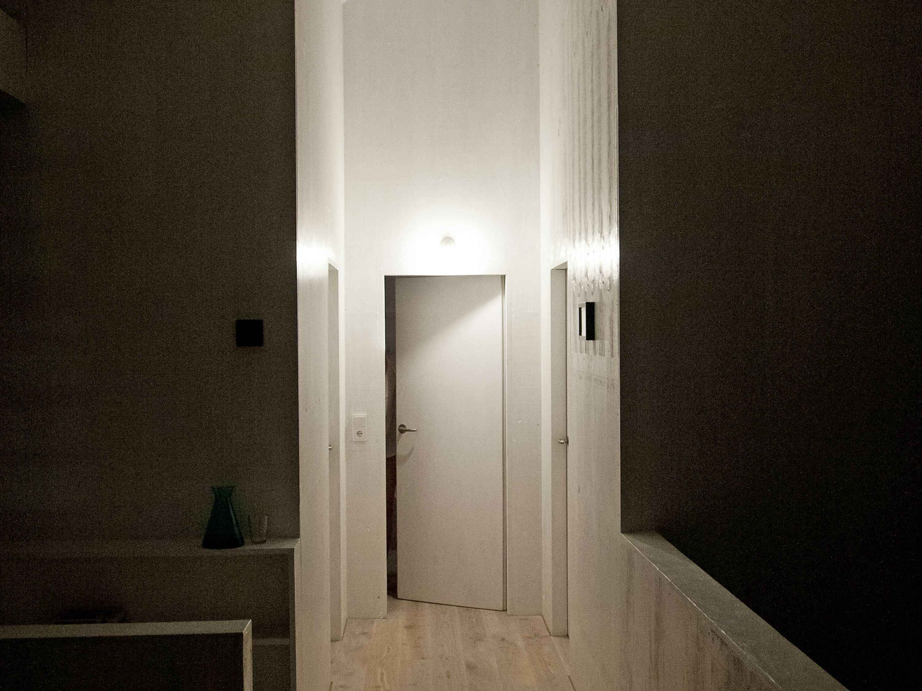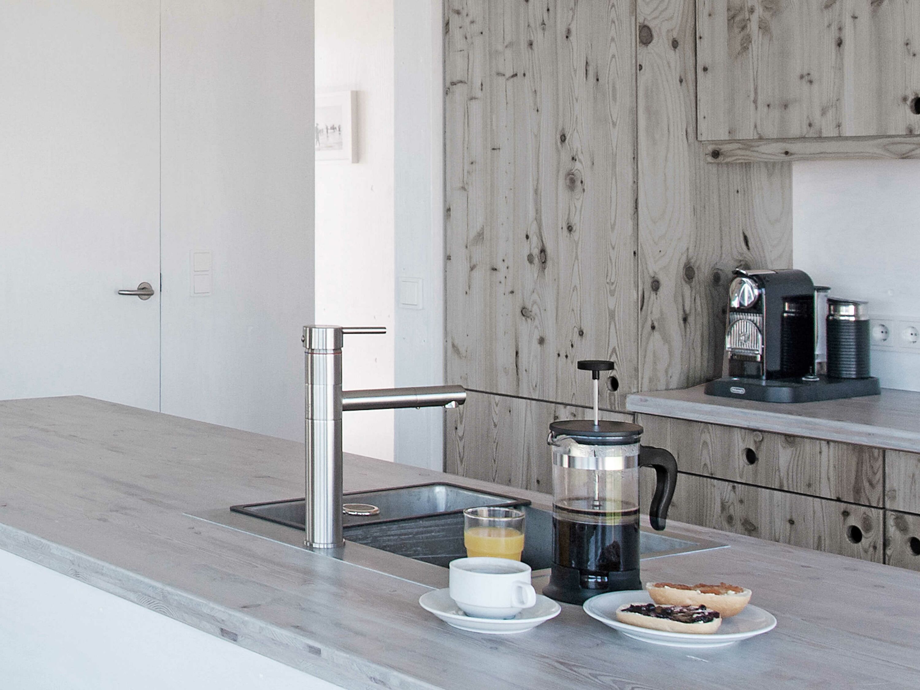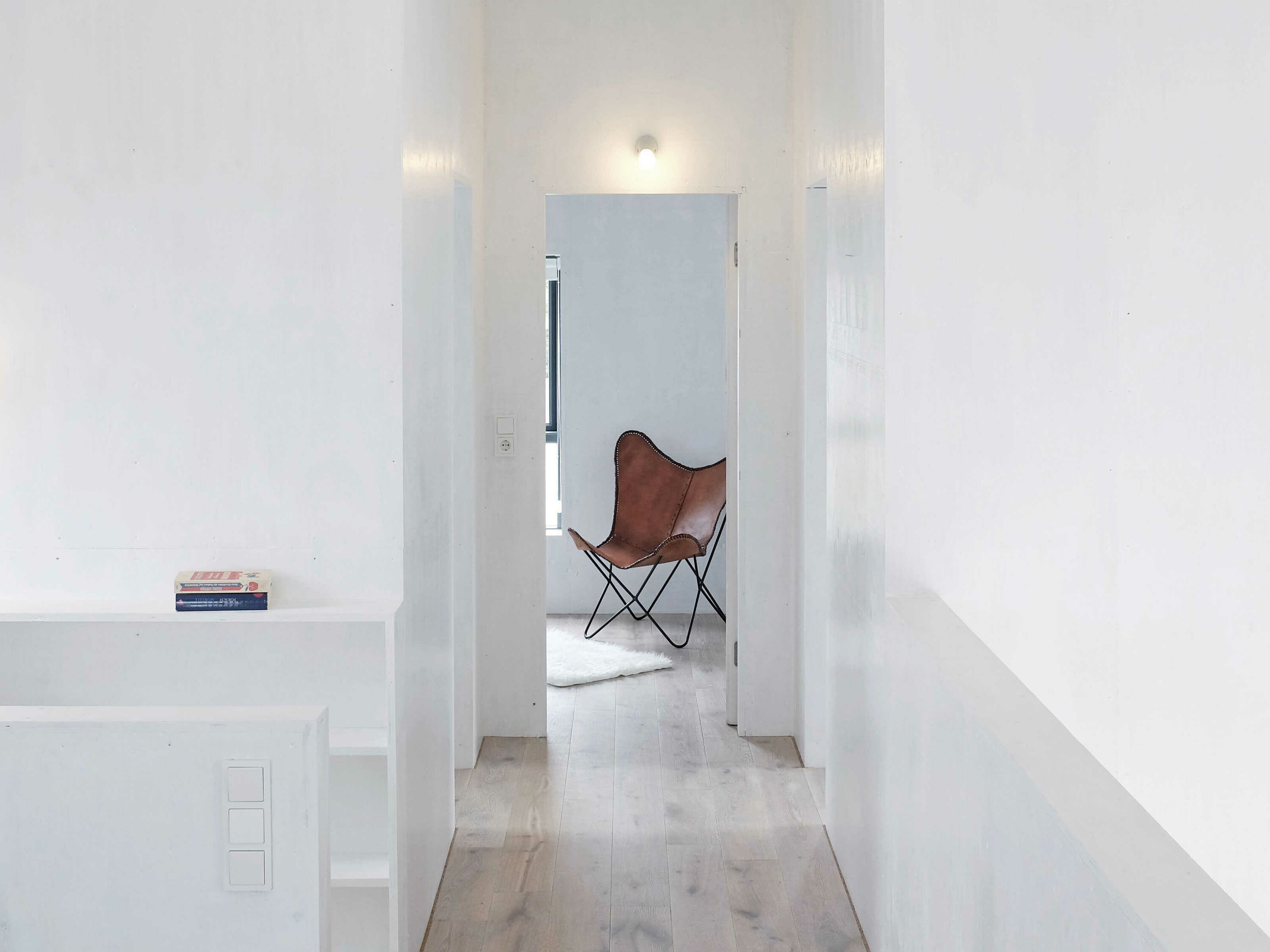 Die Reduktion auf natürliche Baustoffe und übersichtliche, funktionale Strukturen mit vielen Einbauten schaffen Klarheit und Raum. Die Wohnfläche beträgt mehr als 130 Quadratmeter, der großzügige Hauptraum, inklusive Küche und Essbereich ist von einer offenen Galerie geprägt. Die Deckenhöhe reicht hier bis auf fast acht Meter. Alle Zimmer erhalten Licht von zwei Seiten.
