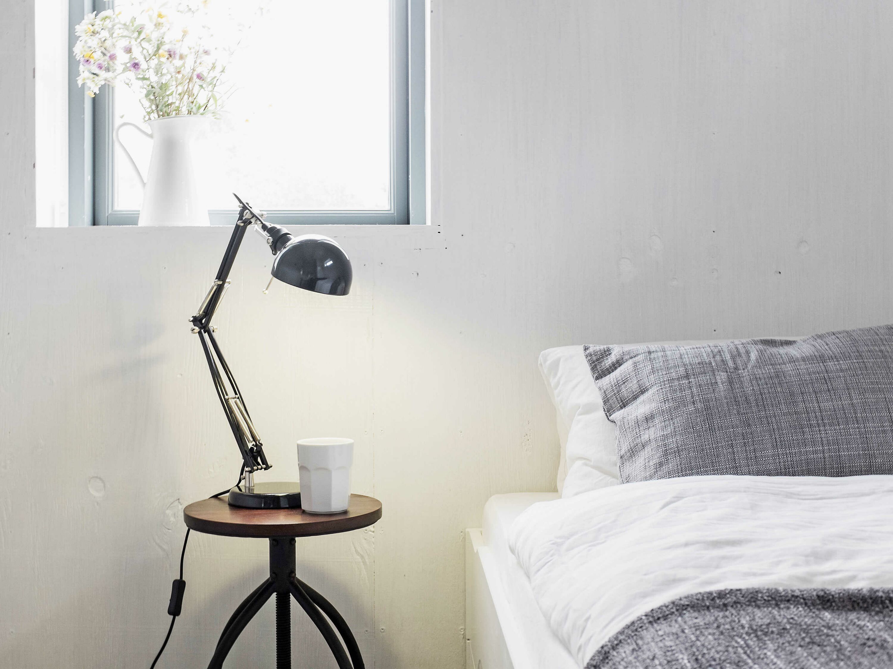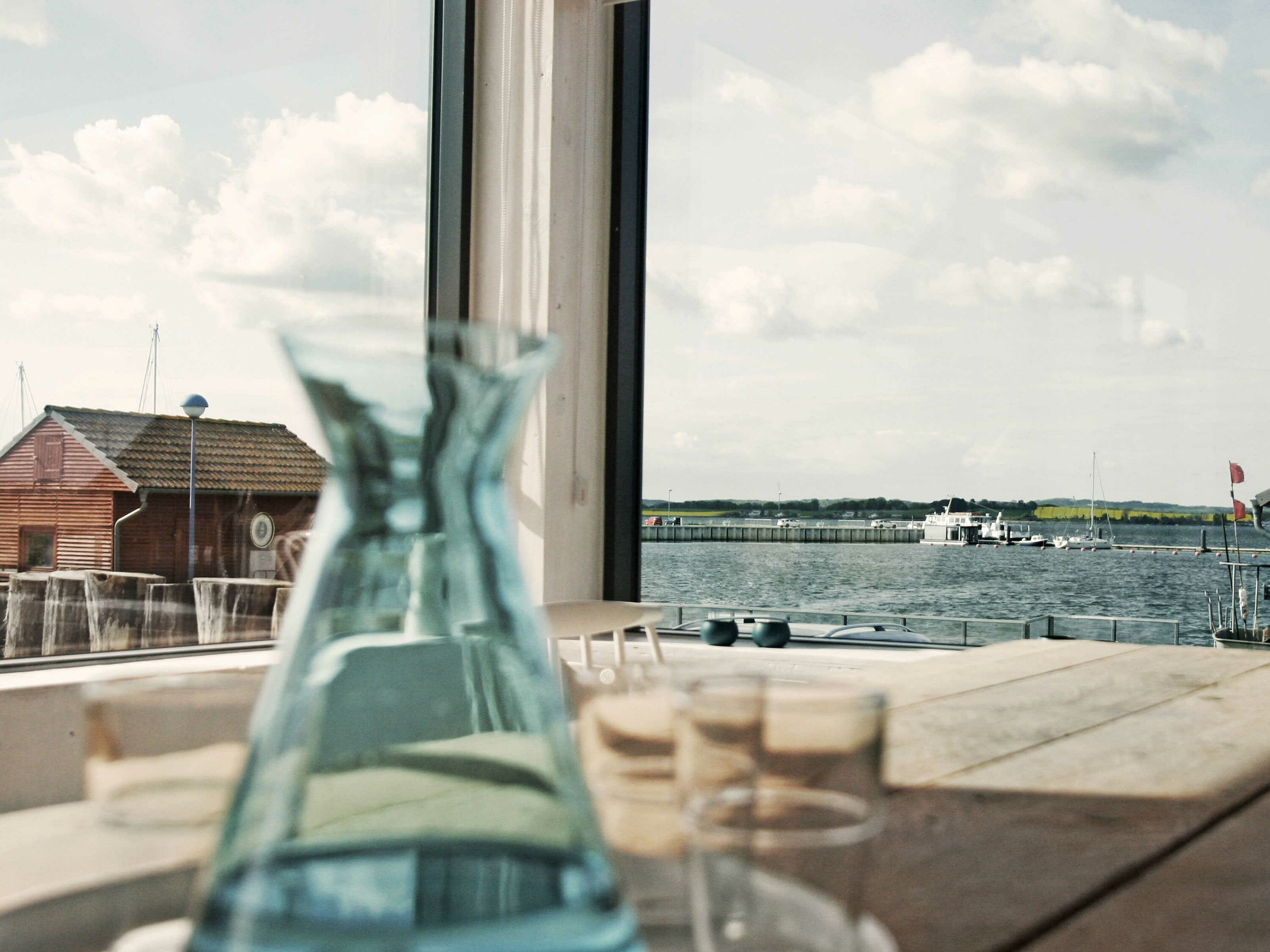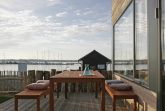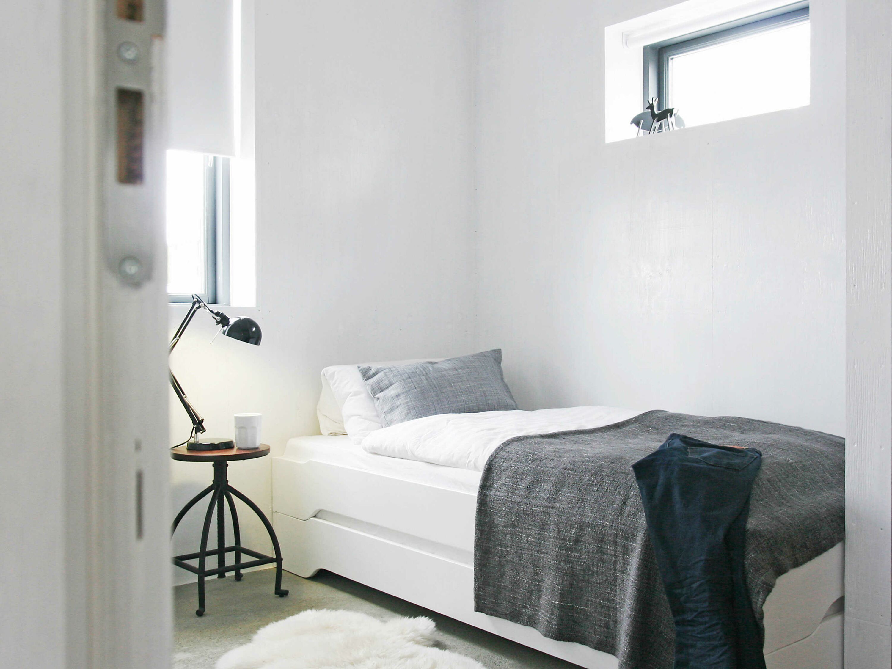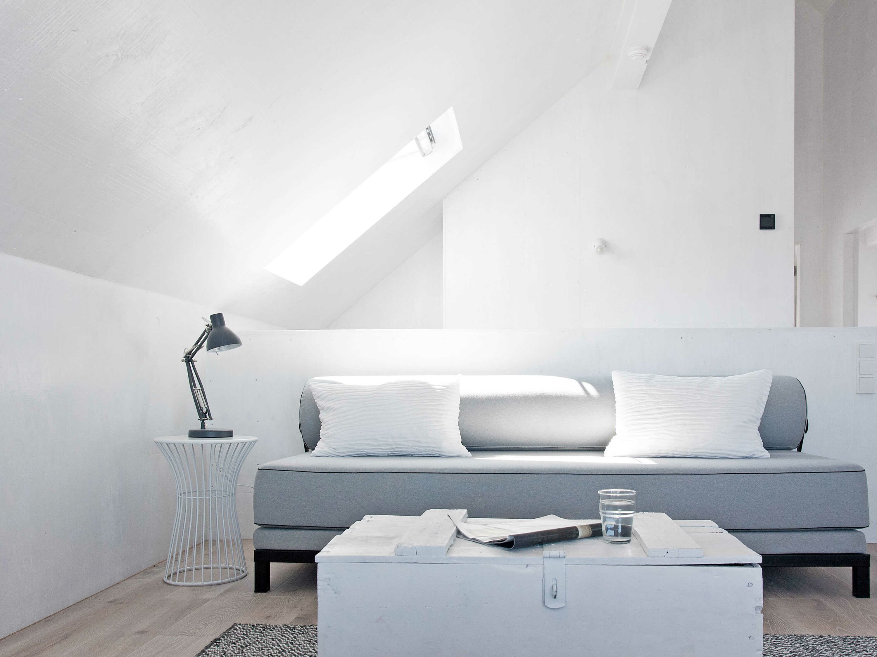 Die maßangefertigten dänischen Fenster mit großen Fronten und schlichten schiefergrauen Holzrahmen bilden einen interessanten Kontrast zu den weiß lackierten Seekieferplatten, mit denen die Innenräume verkleidet sind. Der Fußboden im Erdgeschoss besteht aus geschliffenem Sicht-Estrich, im oberen Stockwerk liegt Parkett aus gebürsteten, weiß gekalkten Eichendielen. Das gesamte Haus lässt sich über eine Fußbodenheizung angenehm temperieren und garantiert mit Kaminofen und Sauna das ganze Jahr über eine gemütliche Atmosphäre. Die Einrichtung besteht aus hochwertigen Designmöbeln, die dazu passende Farbpalette findet sich vor allem in den Tönen weiß, grau, mauve und petrol wieder.