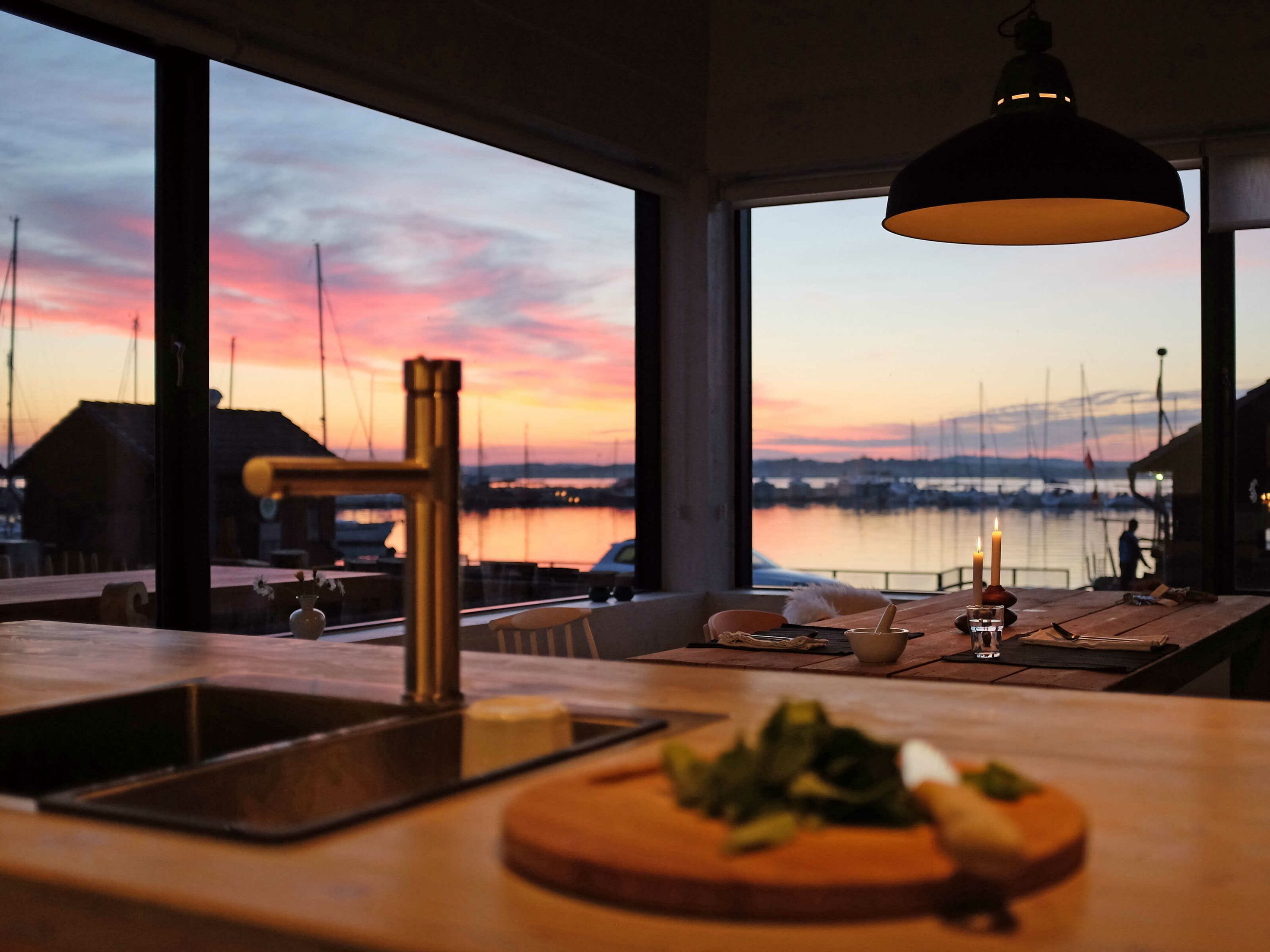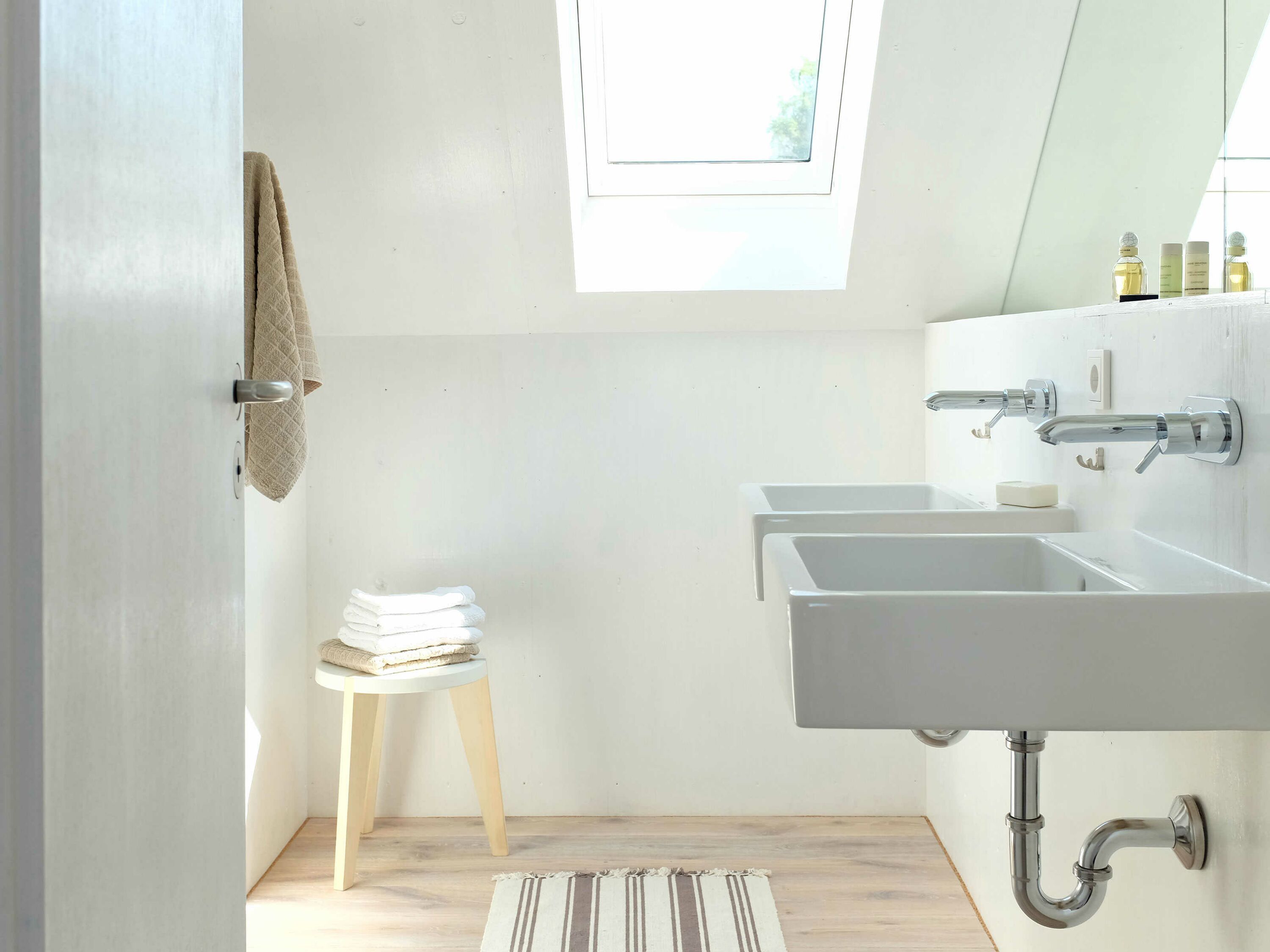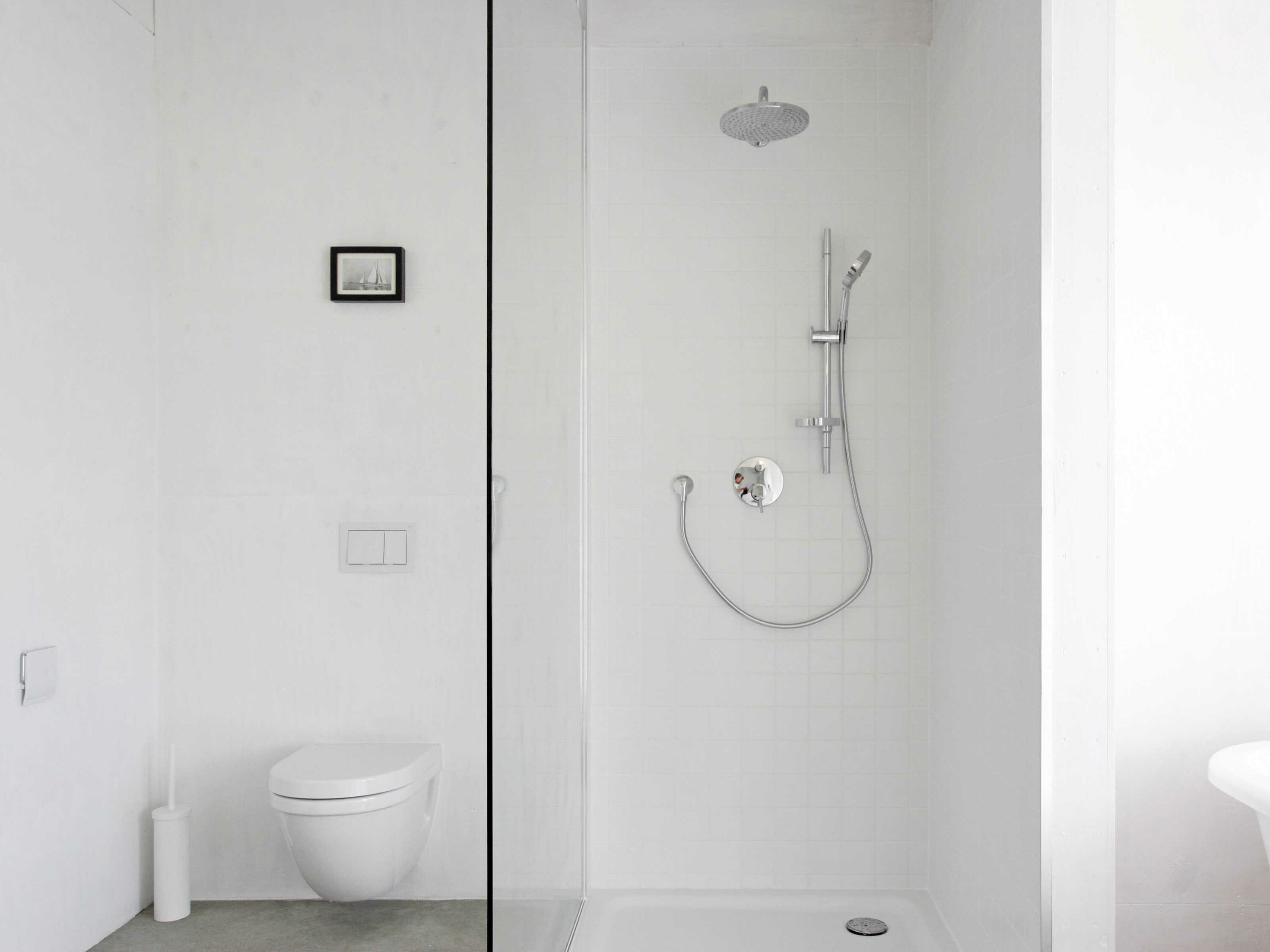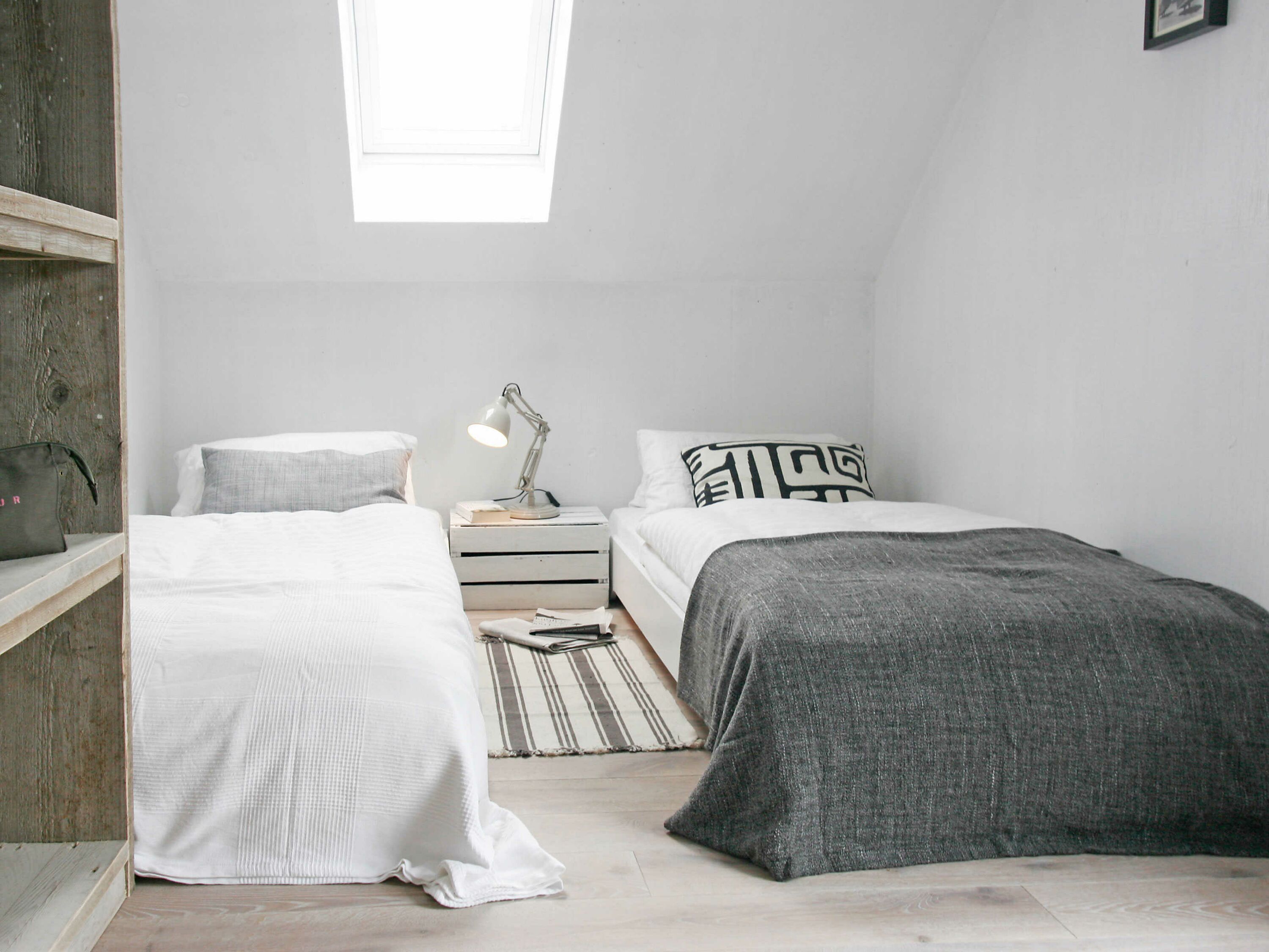Die maßangefertigten dänischen Fenster mit großen Fronten und schlichten schiefergrauen Holzrahmen bilden einen interessanten Kontrast zu den weiß lackierten Seekieferplatten, mit denen die Innenräume verkleidet sind. Der Fußboden im Erdgeschoss besteht aus geschliffenem Sicht-Estrich, im oberen Stockwerk liegt Parkett aus gebürsteten, weiß gekalkten Eichendielen. Das gesamte Haus lässt sich über eine Fußbodenheizung angenehm temperieren und garantiert mit Kaminofen und Sauna das ganze Jahr über eine gemütliche Atmosphäre. Die Einrichtung besteht aus hochwertigen Designmöbeln, die dazu passende Farbpalette findet sich vor allem in den Tönen weiß, grau, mauve und petrol wieder.