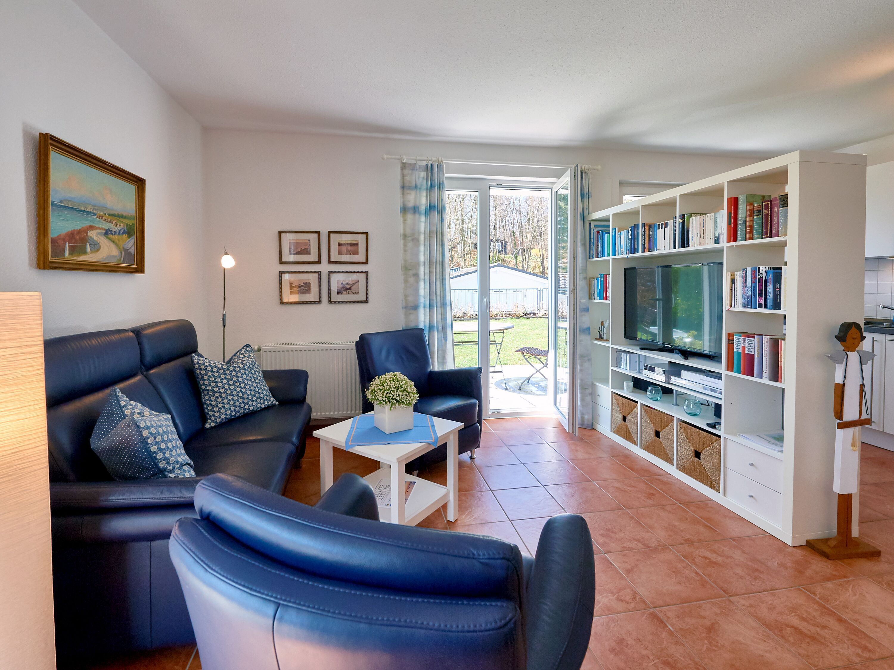 Der Wohnraum ist aufgeteilt in eine gemütliche Sitzecke aus Leder mit einem bequemen Sofa, zwei Sesseln und Couchtisch und einen Essbereich mit einem Esstisch für vier Personen sowie einer Küchenzeile. Hier befinden sich ein Kühlschrank mit Gefrierfach, Geschirrspüler, 4-Platten-Cerankochfeld, Backofen, Mikrowelle und diverse Kleingeräte, die die Ausstattung vervollständigen.