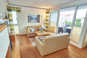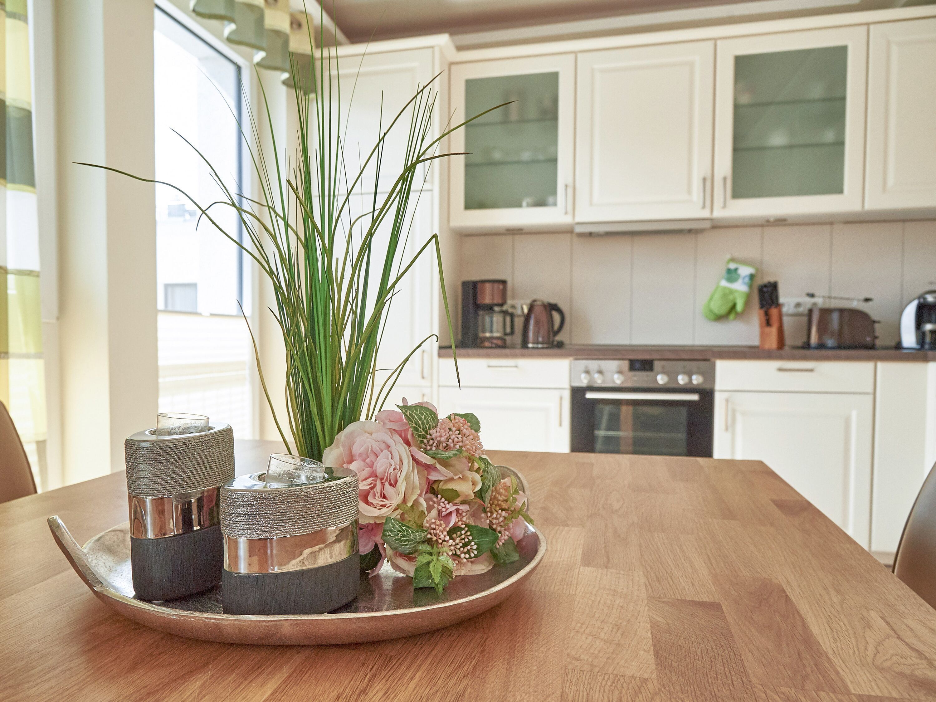 Ihre Ferienwohnung bietet Ihnen darüber hinaus den Komfort einer eigenen Waschmaschine nebst Bügeleisen und Bügelbrett, welche Sie kostenfrei benutzen können. Echtholzparkett (außer Küche), eine einzeln regulierbare Fußbodenheizung sowie die indirekte Voutenbeleuchtung unterstreichen den hochwertigen Gesamteindruck.