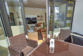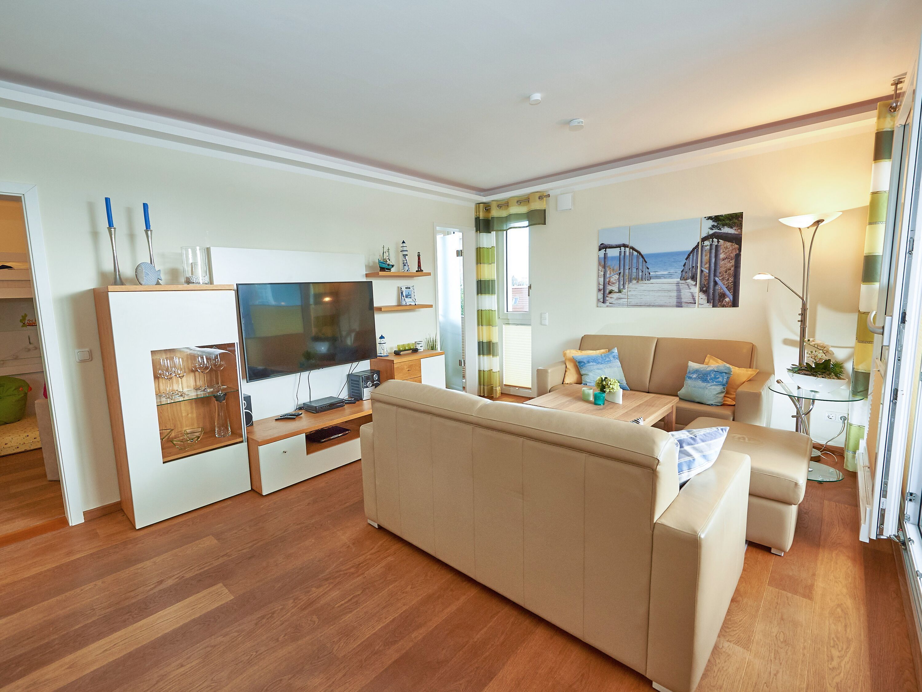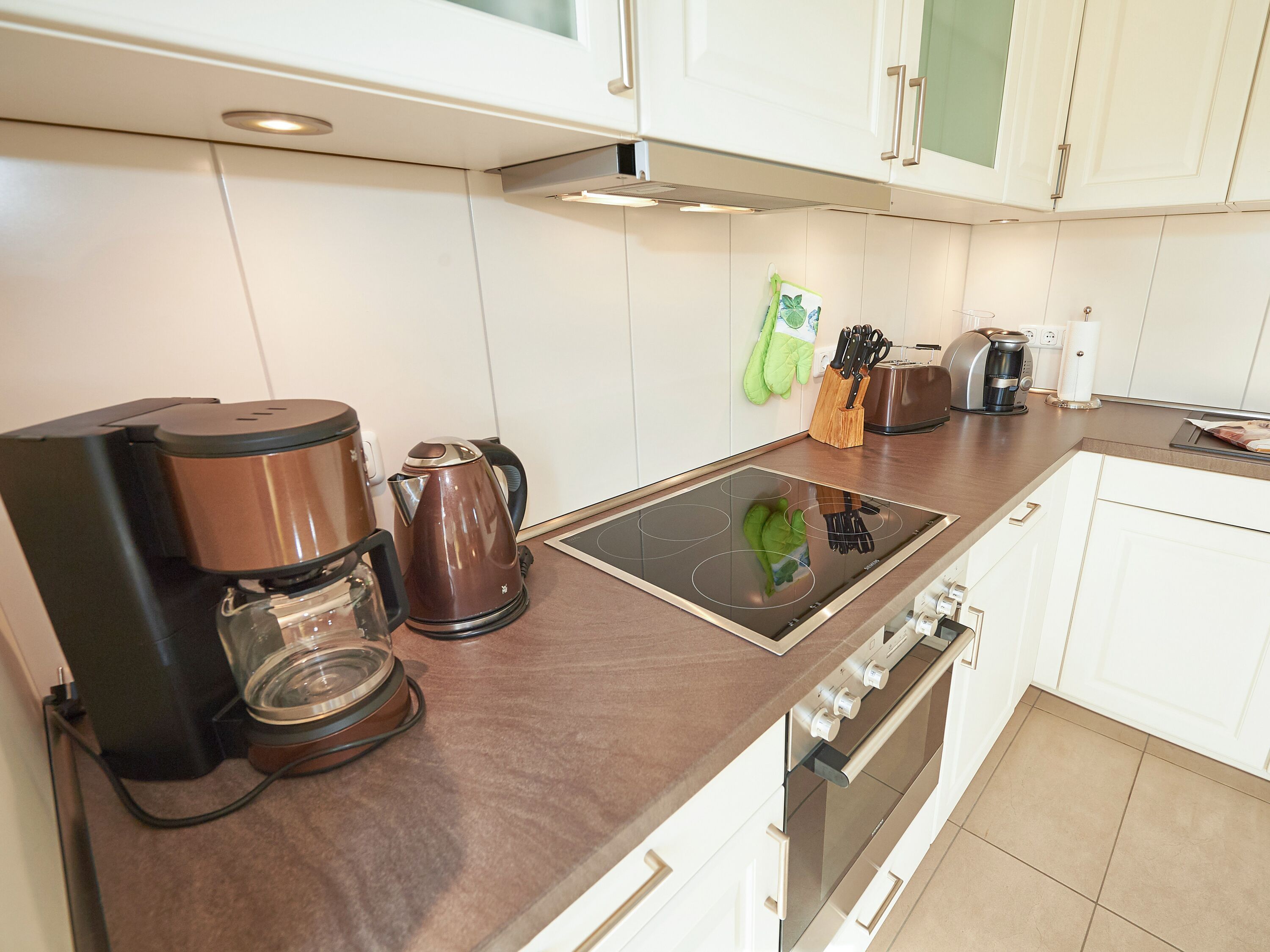 Vom Eingangsflur aus gelangen Sie in den modern ausgestatteten Wohnbereich mit zwei hellen Ledercouchen (eine davon ist eine hochwertige Schlafcouch für zwei Personen) sowie zum Essbereich mit der modernen Einbauküche. Die geflieste Küche ist mit einem Kühlschrank mit Gefrierfach, einem Backofen, einem 4-Platten-Cerankochfeld, einer Mikrowelle und einer Geschirrspülmaschine ausgestattet. Eine Tassimo-Kaffeemaschine sowie diverses Küchenaccessoires (Eierkocher, Toaster, Wasserkocher, Kaffeemaschine, usw.) lassen keinen Komfort vermissen.