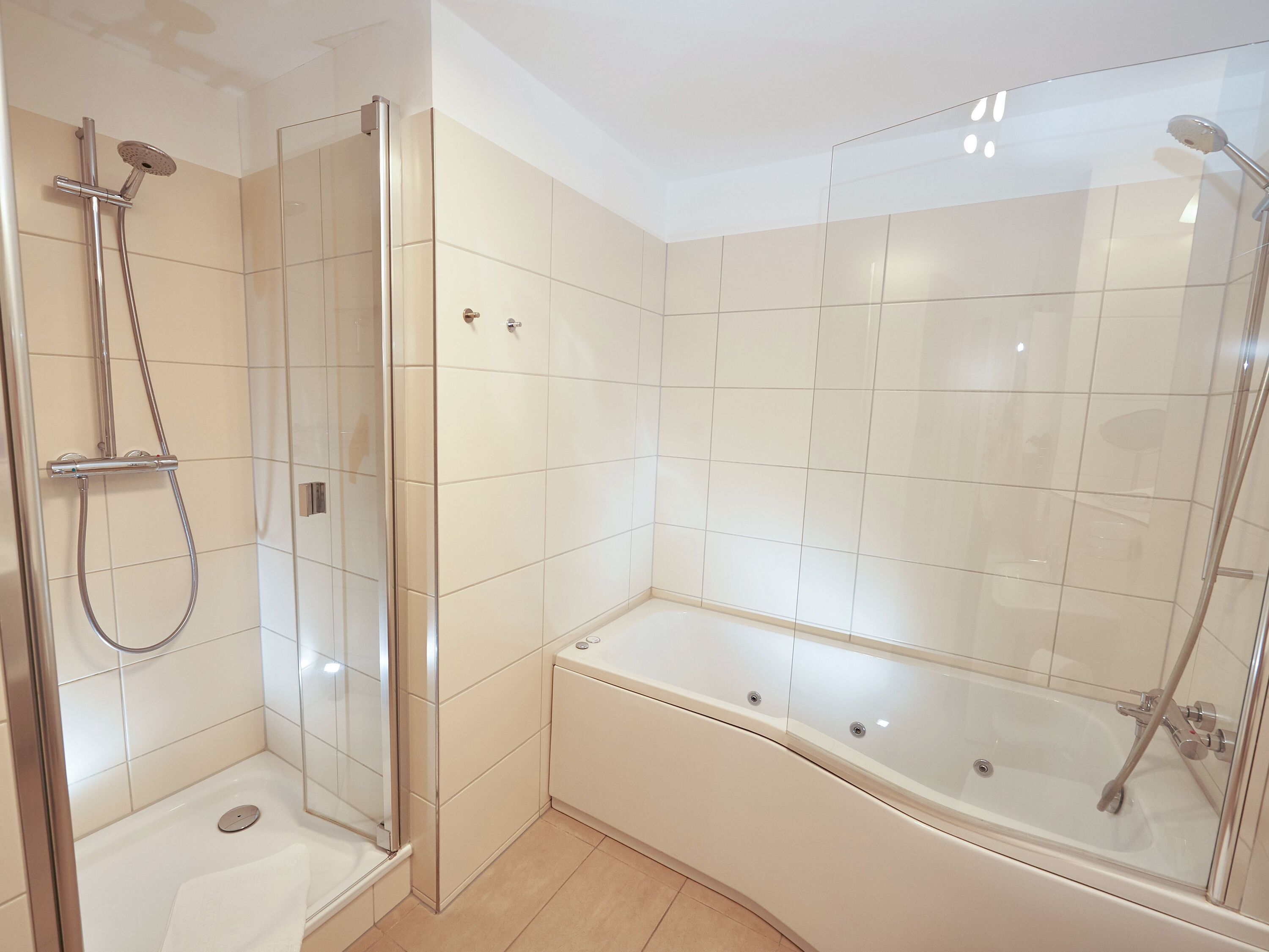 Auch das Badezimmer ist mit Dusche/WC, Badewanne, Fön und Schminkspiegel bestens ausgestattet.