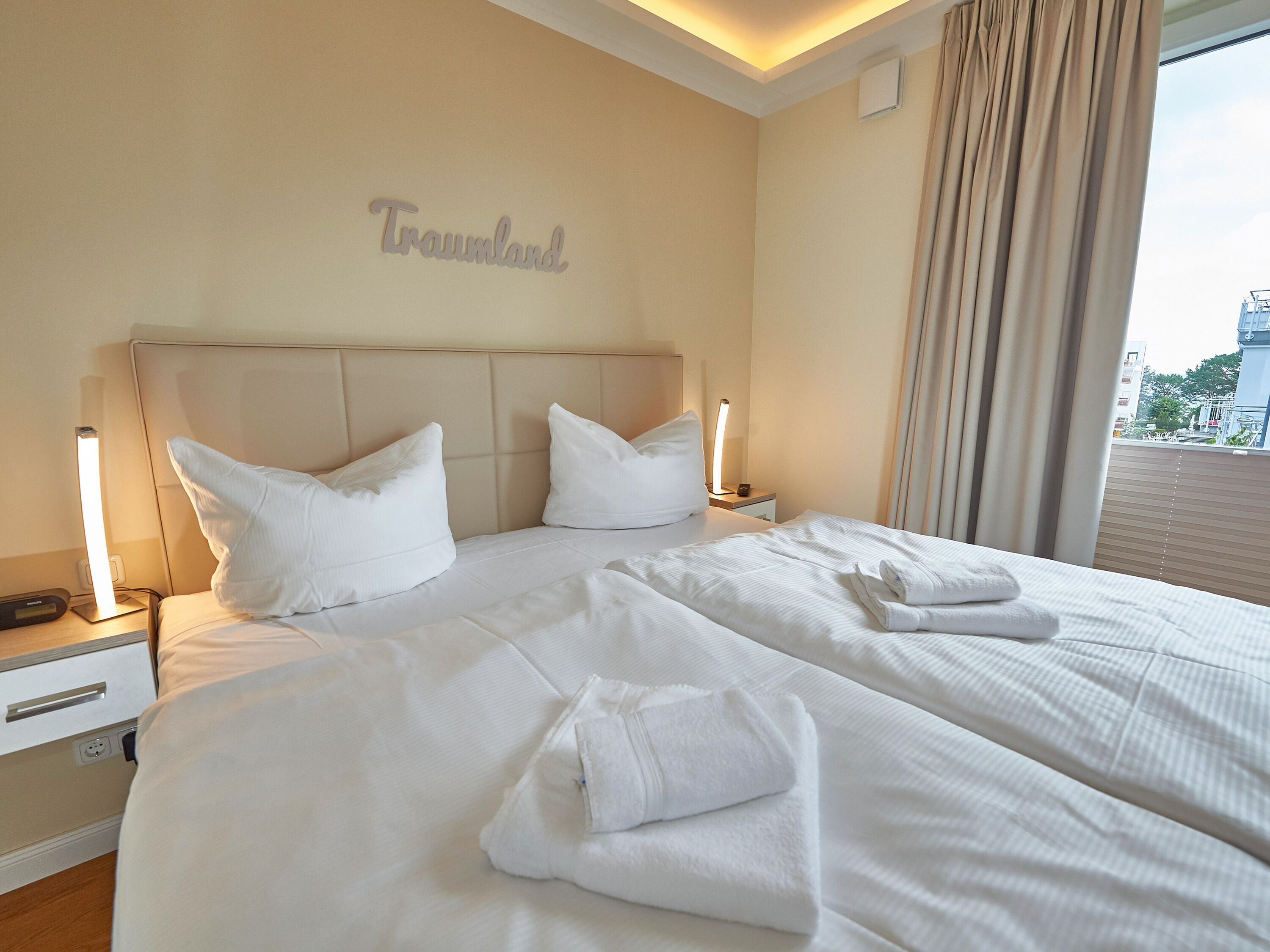 Das Schlafzimmer Ihres Urlaubsdomizils ist mit einem hochwertigen Boxspringbett (1,60 x 2,00 m) sowie einem weiteren Flachbildfernseher mit einer Diagonale von 107 cm und einem Radiowecker ausgestattet. Vom Schlafzimmer aus genießen Sie einen seitlichen Blick auf die rund 200 m entfernte Ostsee.
