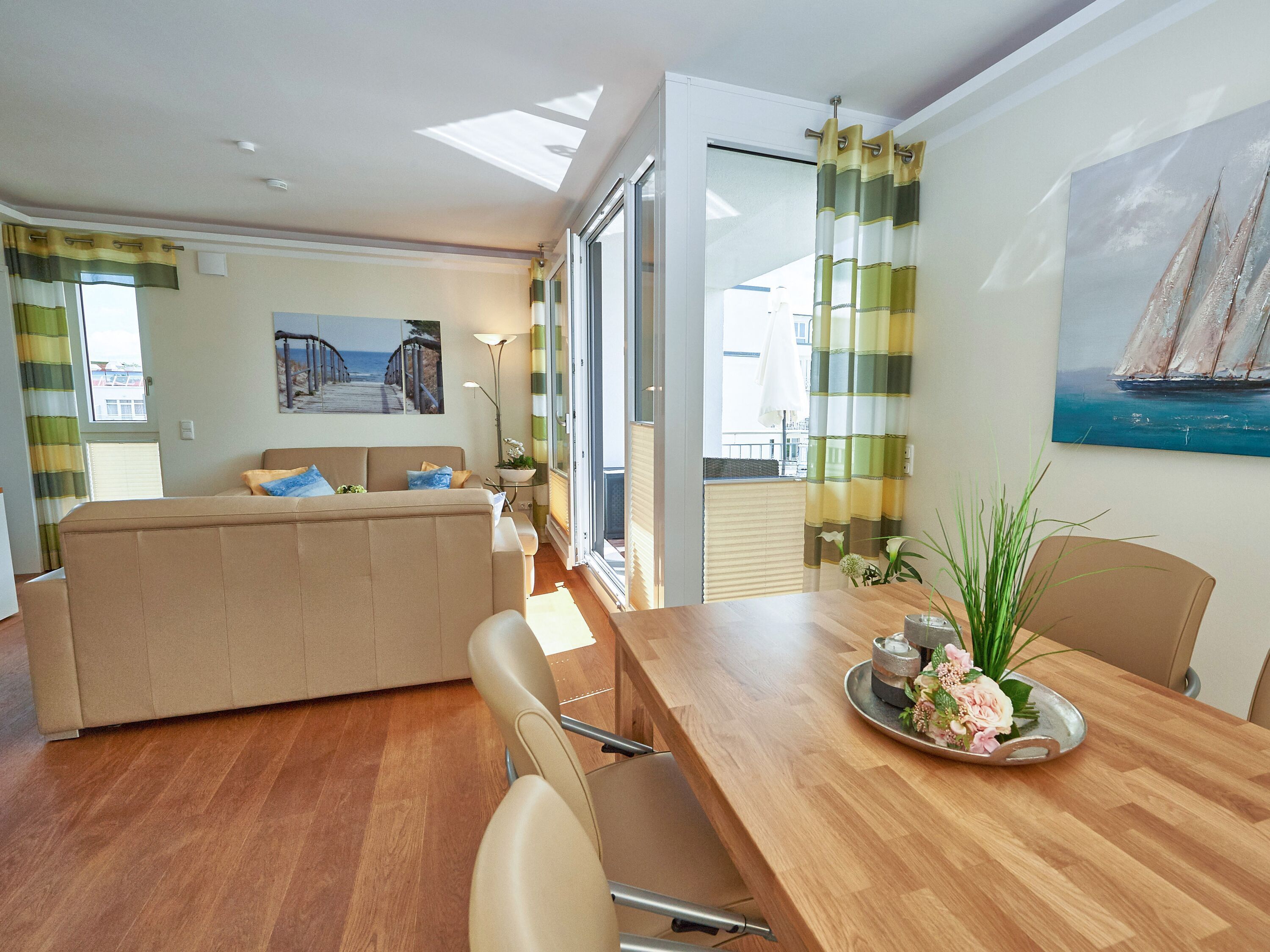Dieses rund 68 Quadratmeter große, hochwertig und geschmackvoll eingerichtete 3-Raum-Appartement erwartet Sie im 3. Obergeschoss und ist bequem mit dem Fahrstuhl zu erreichen. Vom hell und freundlich gestalteten Wohnraum können Sie direkt auf den etwa 8 m² großen möblierten Südost-Balkon gehen und in gemütlicher Atmosphäre den Tag ausklingen lassen.