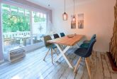 • kombiniertes Wohn-/Esszimmer mit bequemer Couchgarnitur, großem Flatscreen-TV, W-LAN, Hängesessel zum Chillen, edlem Baumkanten-Esstisch und vorgelagertem Balkon zur Morgensonne