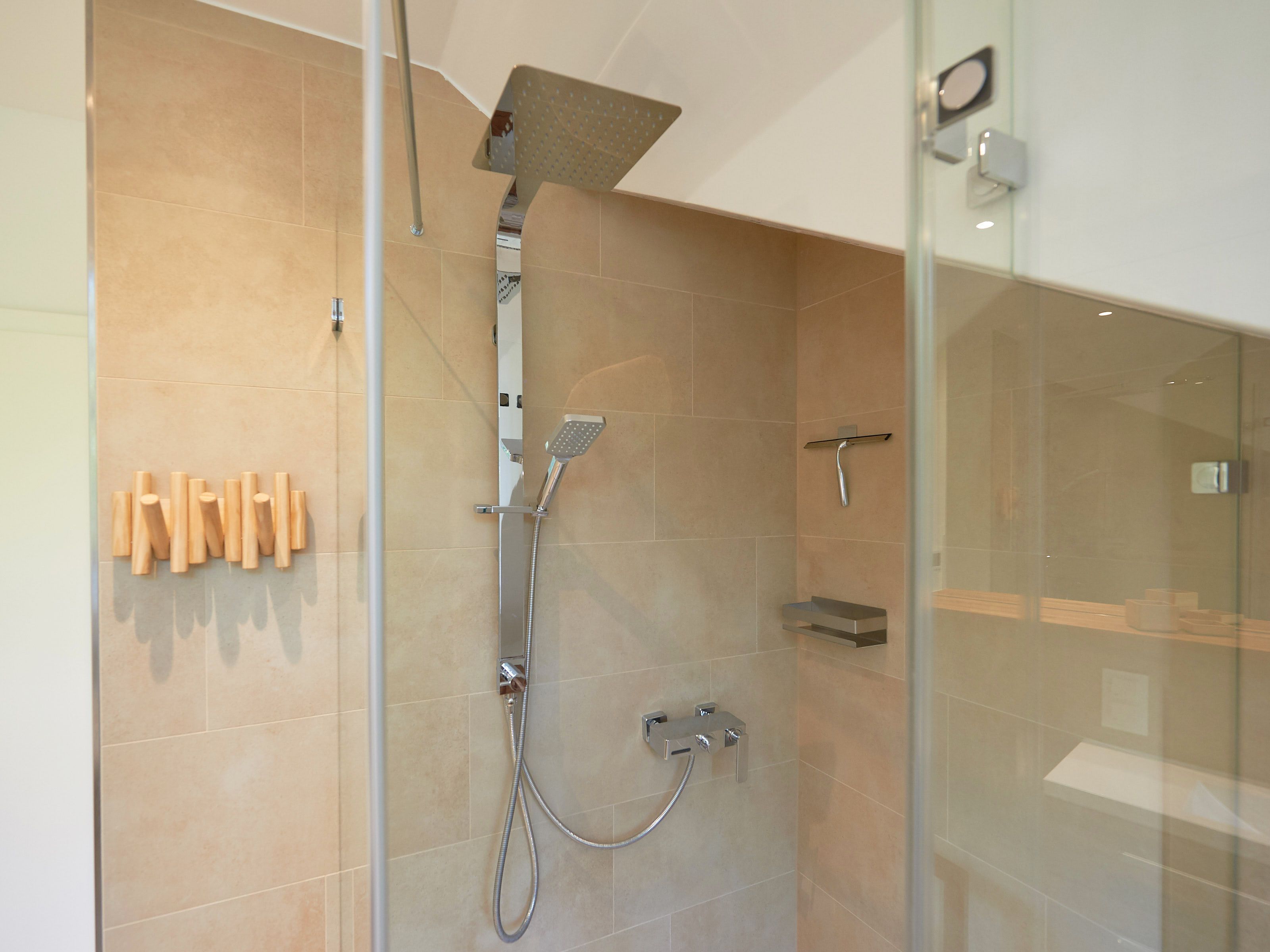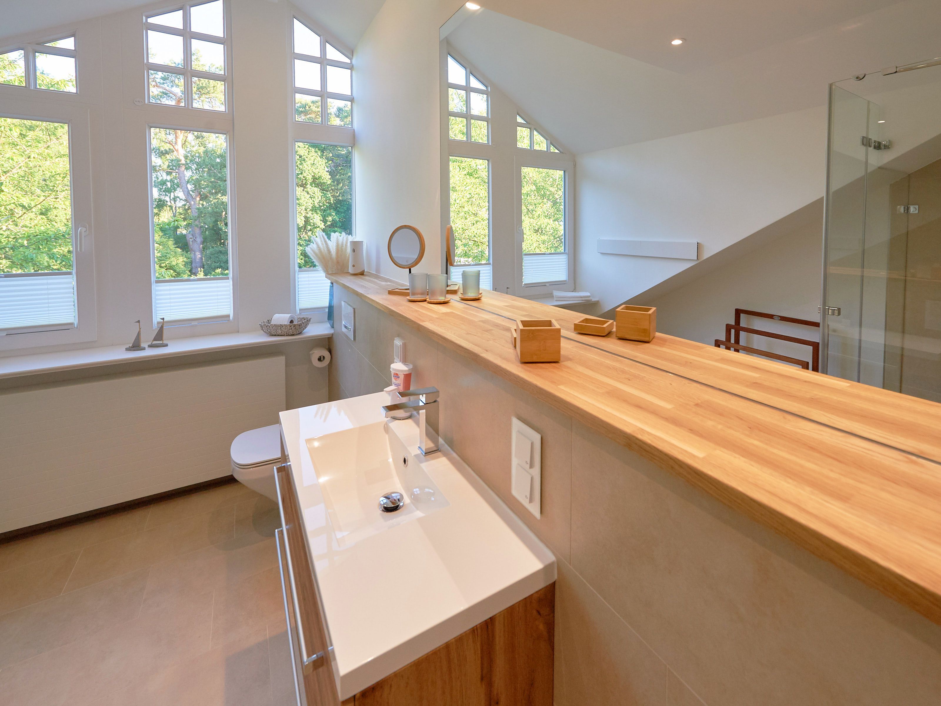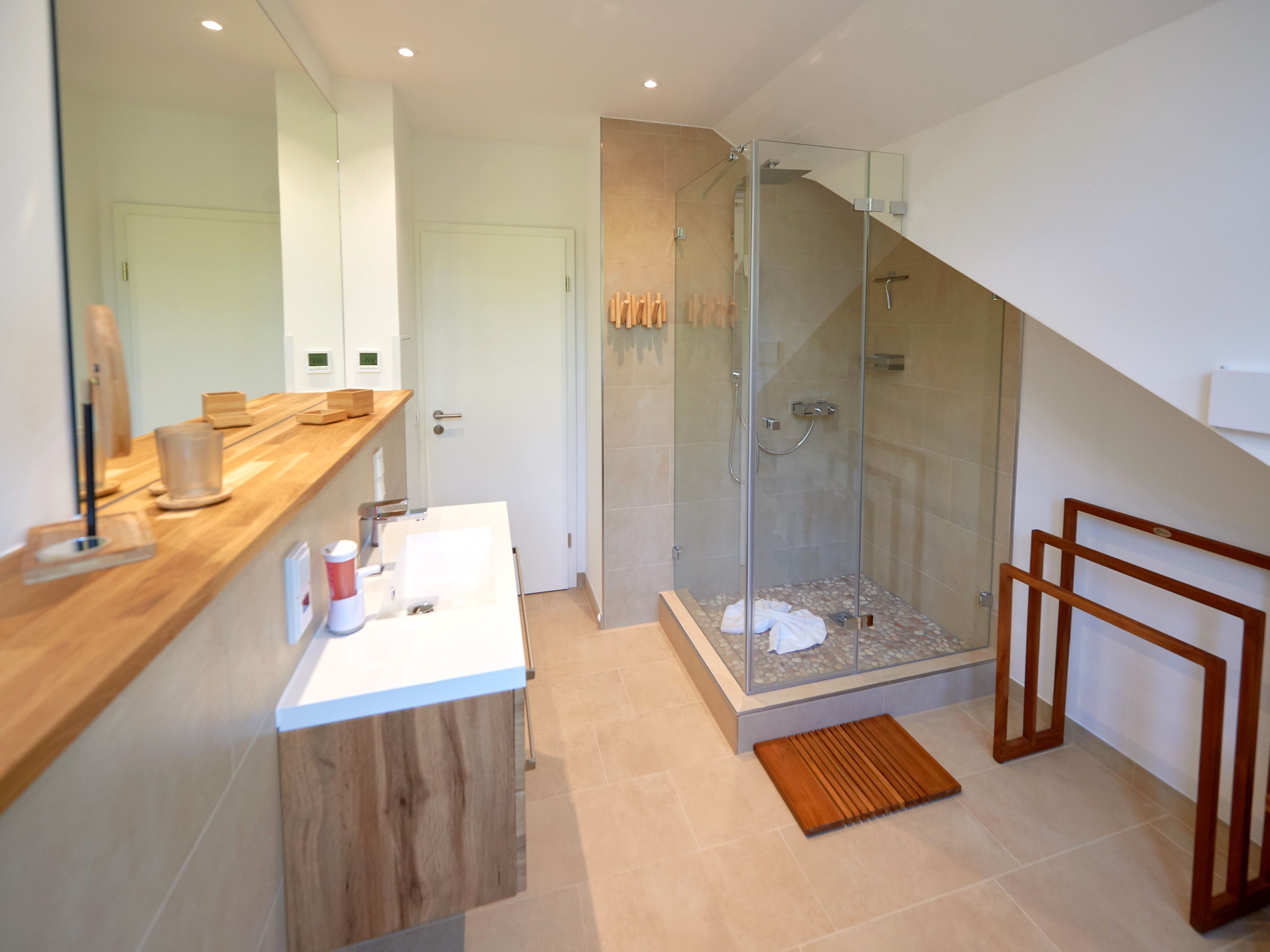 • großes Tageslicht-Bad mit bodentiefer Regenwald-Dusche, WC, Fußbodenheizung, beleuchtetem Waschtisch inkl. Kosmetikspiegel, Fön und Buetooth-Radio sowie ausreichend Haken und Ablageflächen für Ihre Utensilien