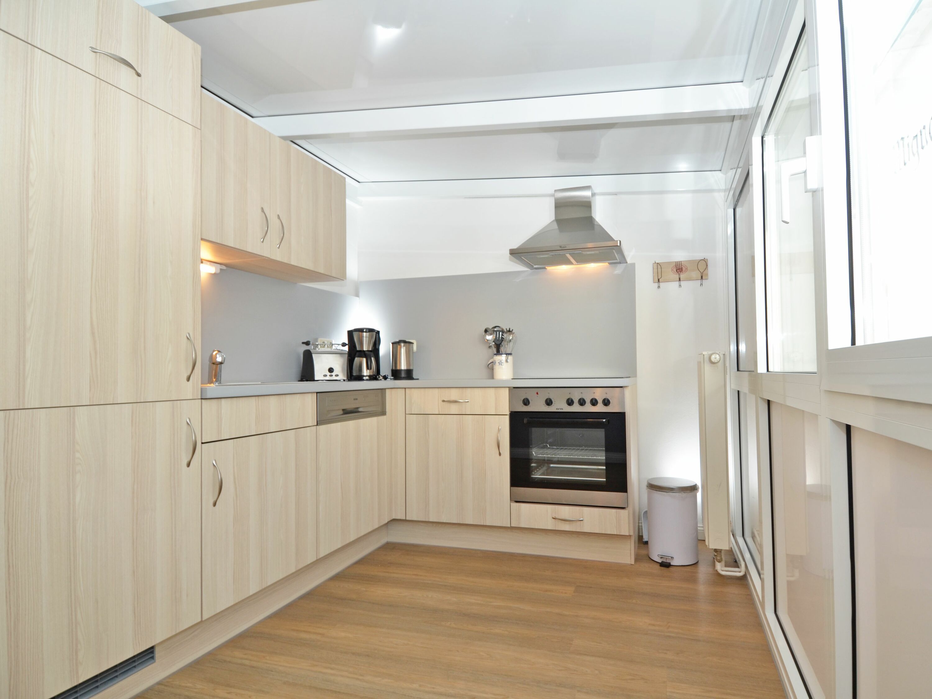 Die separate Küche verfügt über Backofen, Ceran-Kochfeld, Geschirrspüler, Mikrowelle, Toaster, Wasserkocher, Kaffeemaschine sowie diverses Kleininventar.