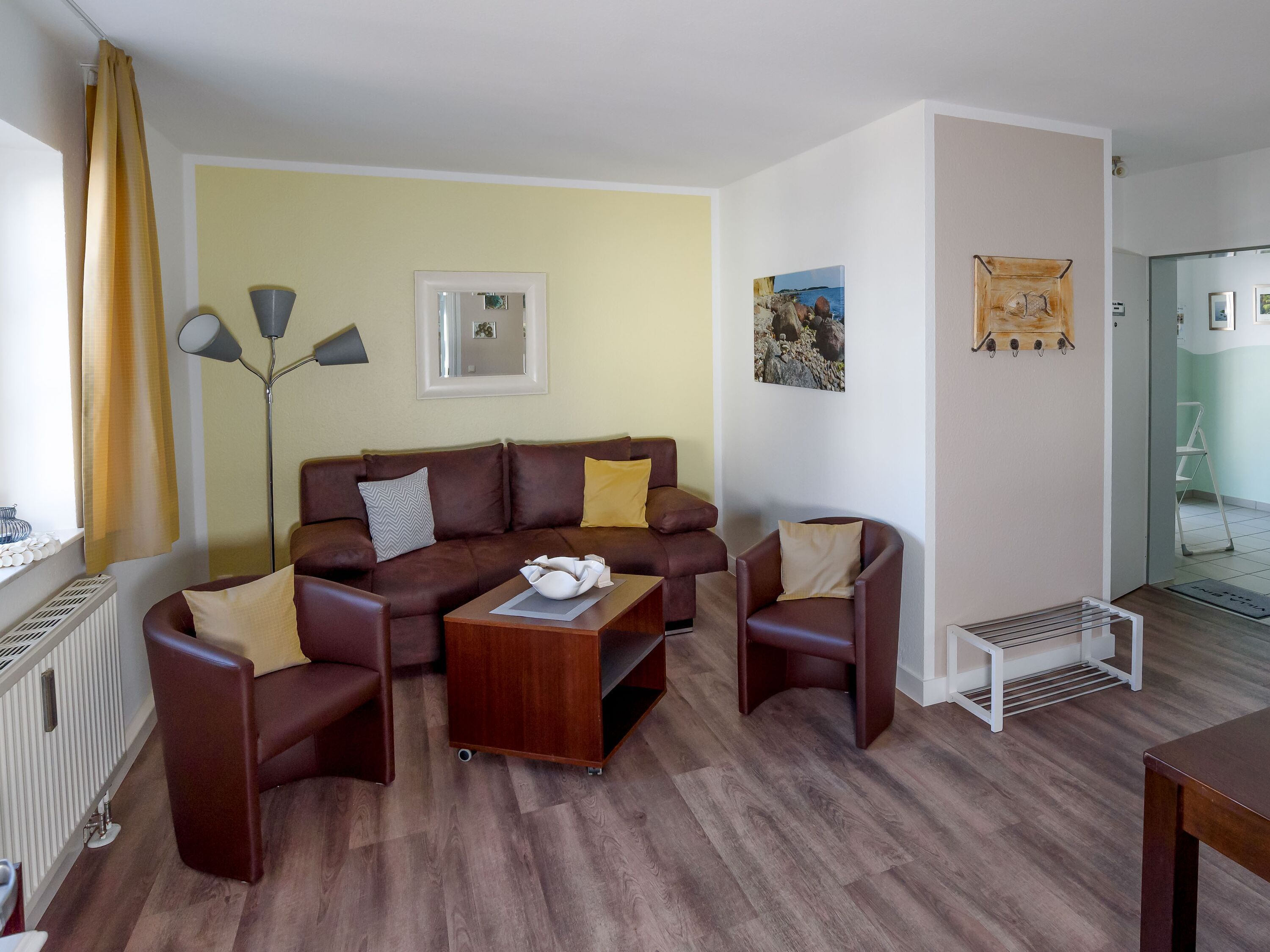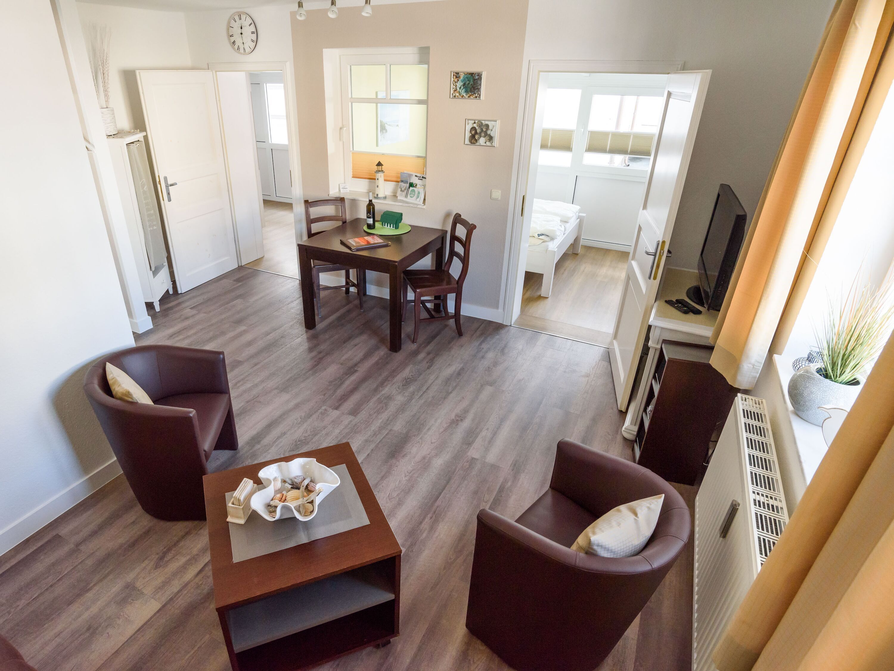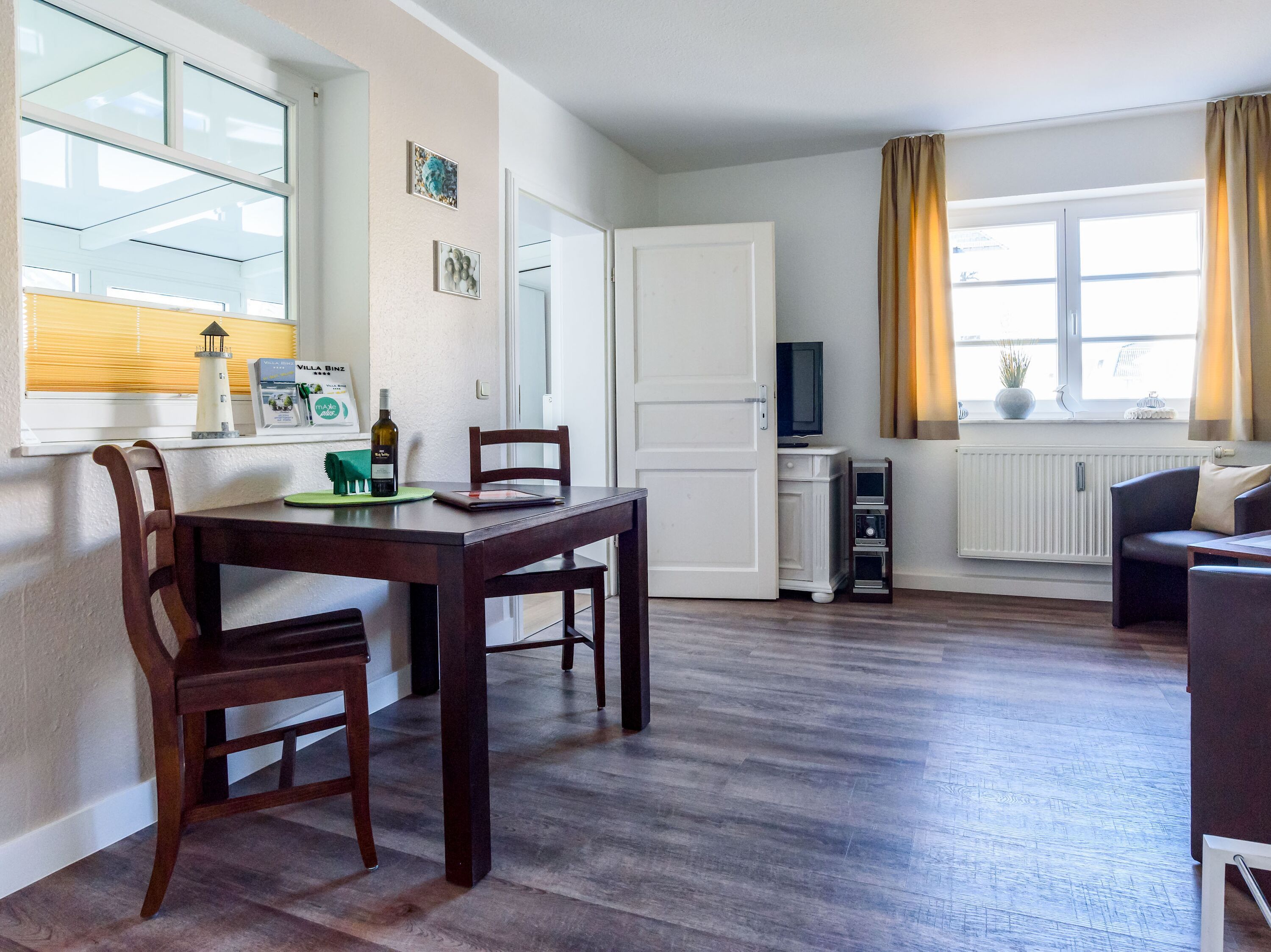 Die 2-Raum-Wohnung Muscheln und Sand im 1. Obergeschoss der Villa Binz begrüßt Sie auf 40 m² Wohnfläche. Der Wohn-/Essbereich ist mit einer Schlafcouch, einem Esstisch, einem Flachbild-Fernseher, DVD-Player und eine Musikanlage ausgestattet. W-LAN können Sie kostenfrei nutzen.
