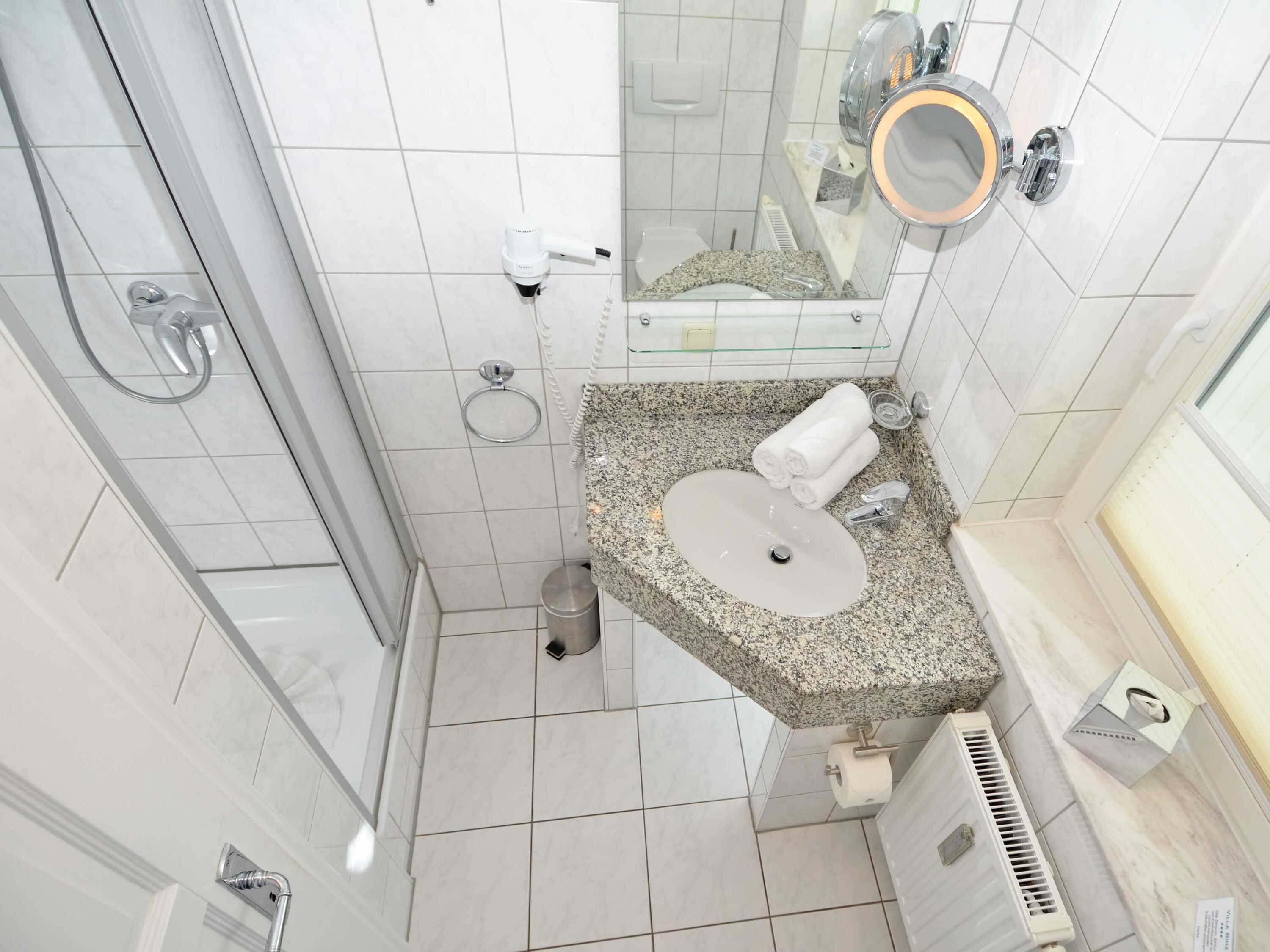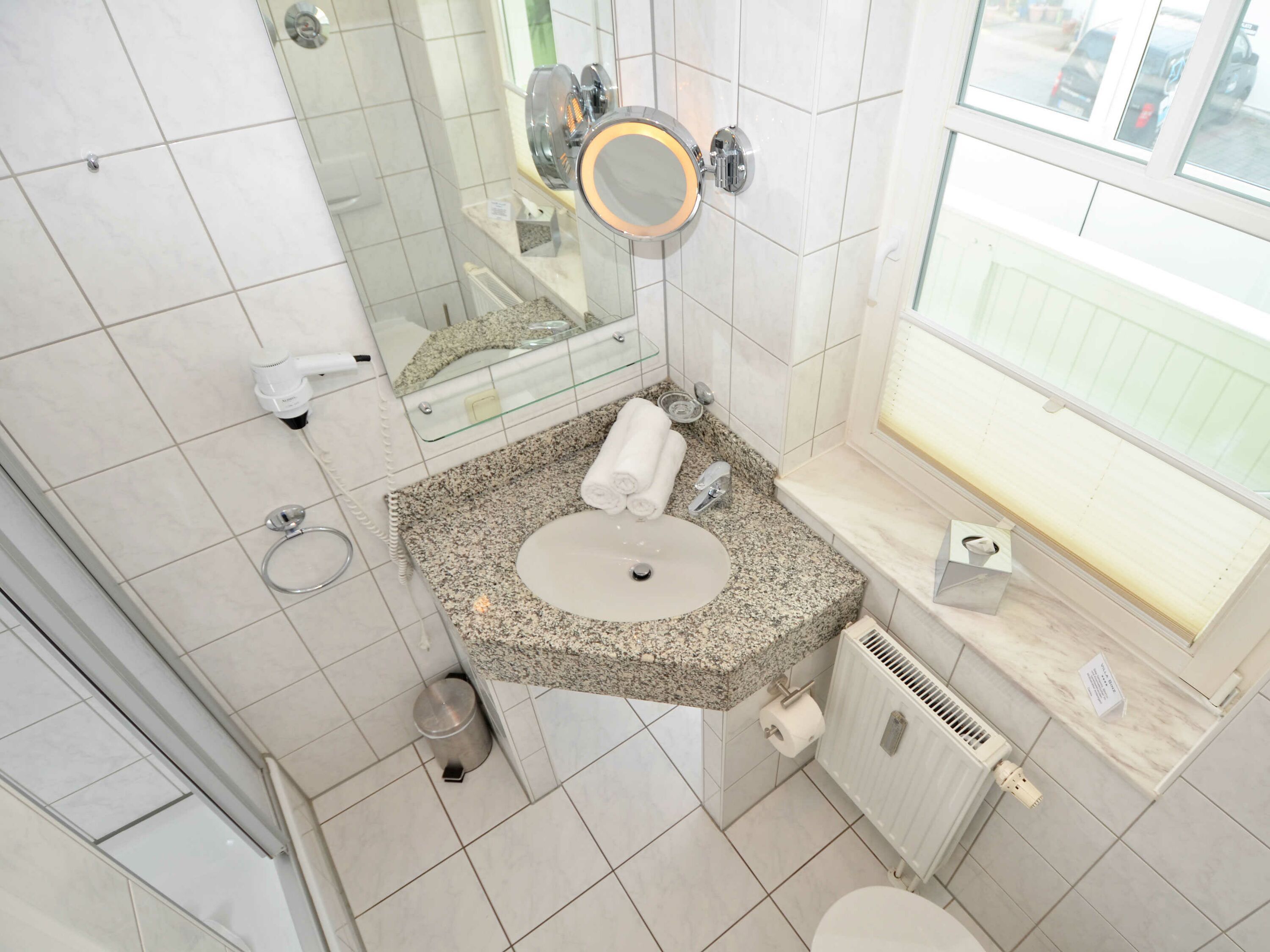 Das Appartement verfügt über ein modernes Duschbad mit WC, Fön sowie einem Granit-Waschtisch.
