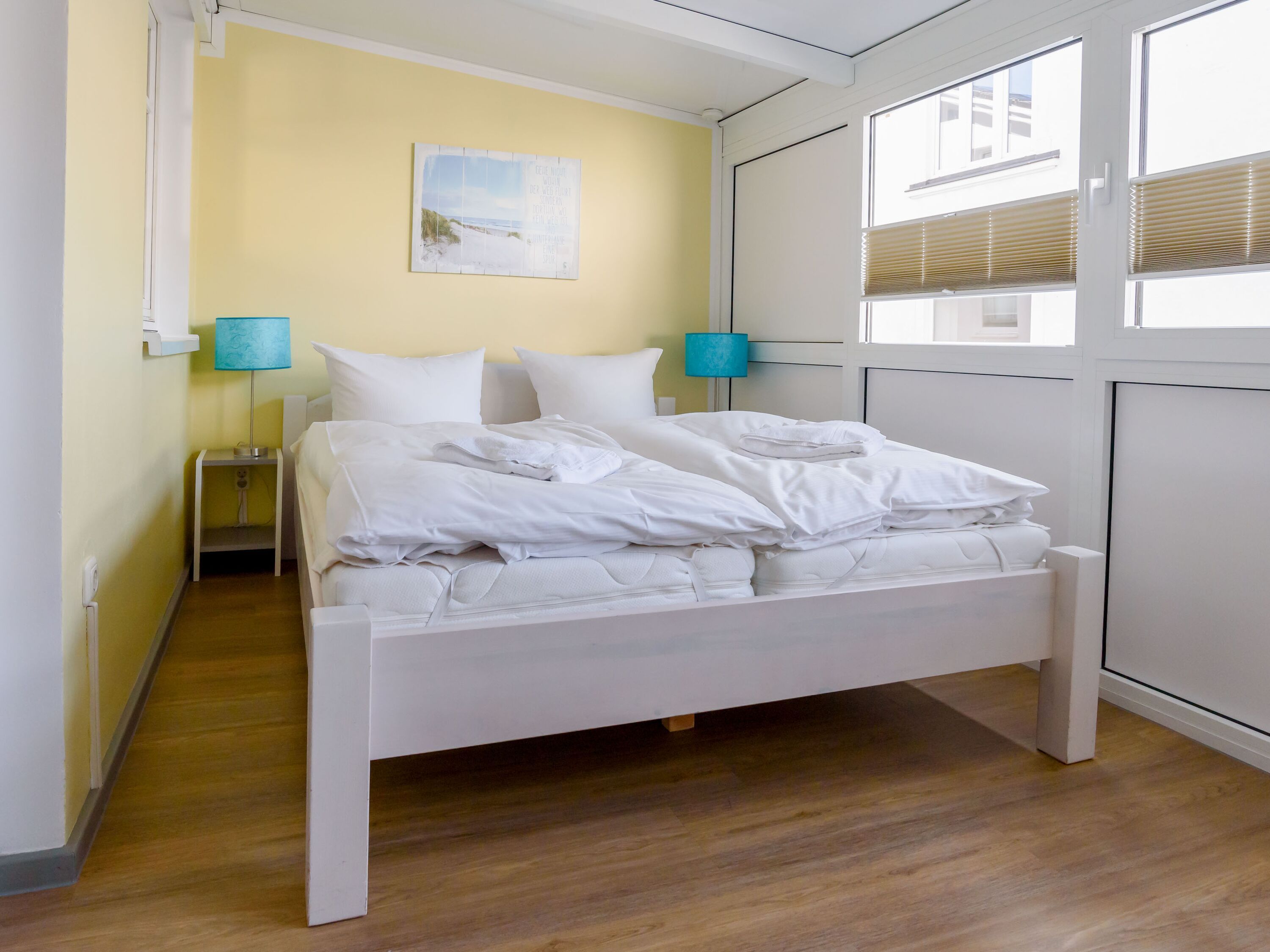Das Schlafzimmer ist mit einem Doppelbett mit hochwertigen Matratzen und einem Kleiderschrank ausgestattet.