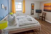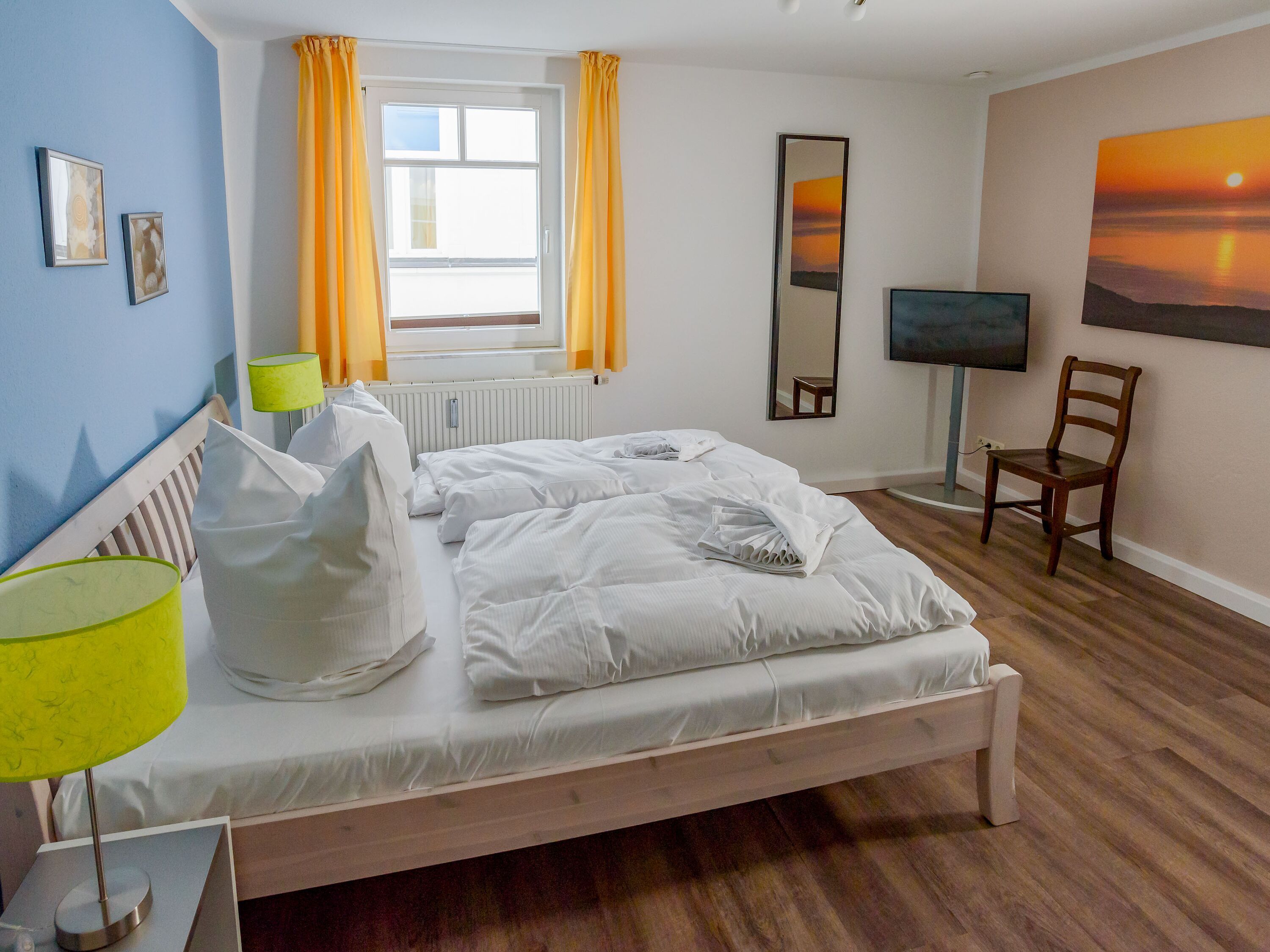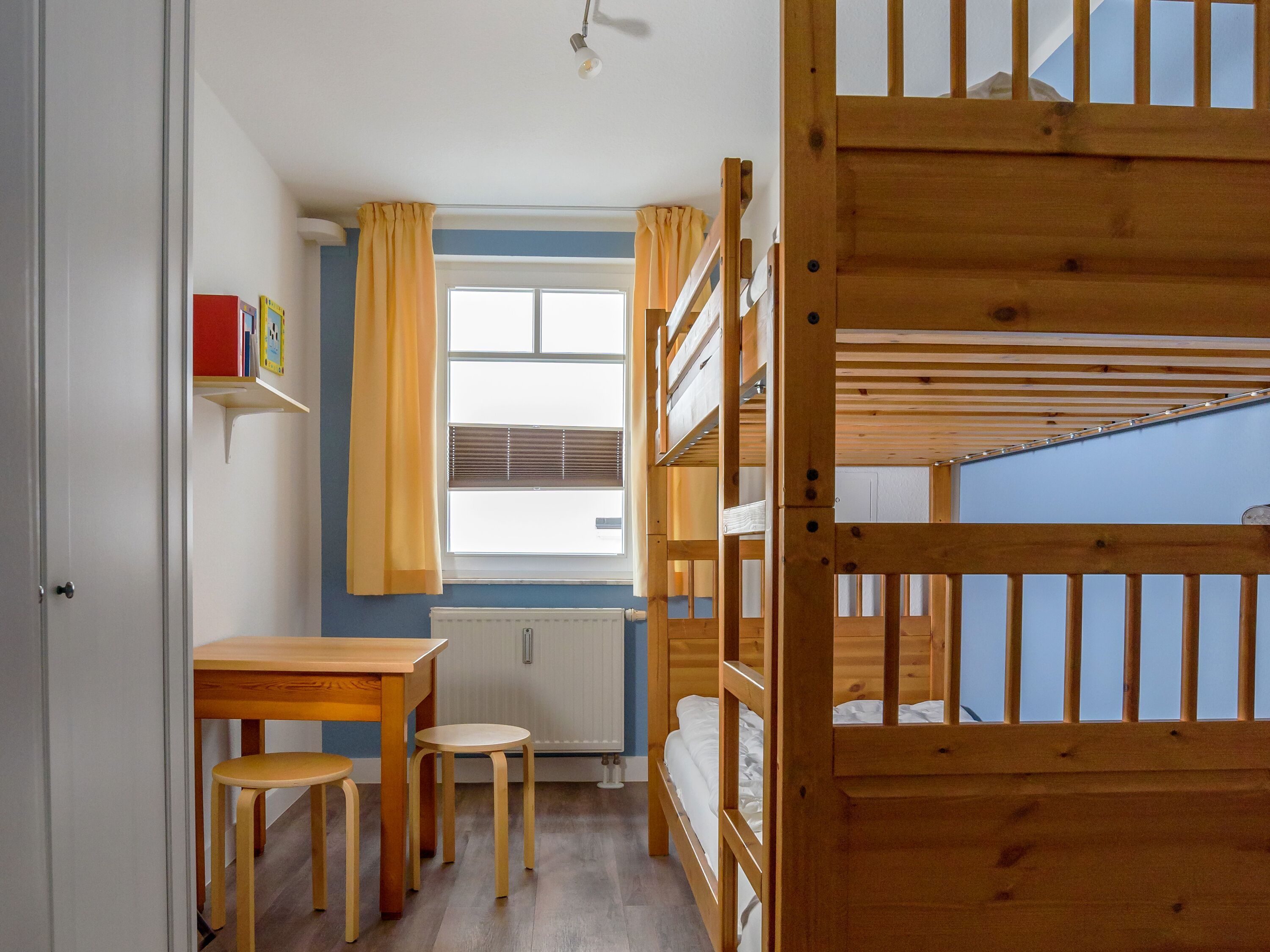 Die Wohnung verfügt über zwei Schlafzimmer mit hochwertigen Matratzen. Das größere Schlafzimmer ist mit einem Doppelbett (1,80 x 2,00 m)  sowie Kleiderschrank eingerichtet. Das kleine (Kinder-)Schlafzimmer verfügt über ein Etagenbett, einen kleinen Schrank sowie einen Schreibtisch.