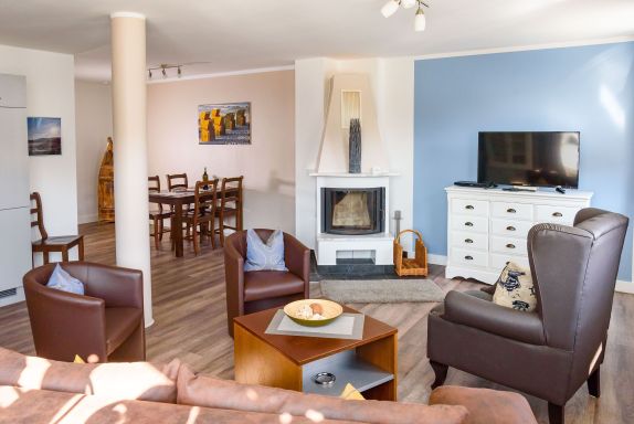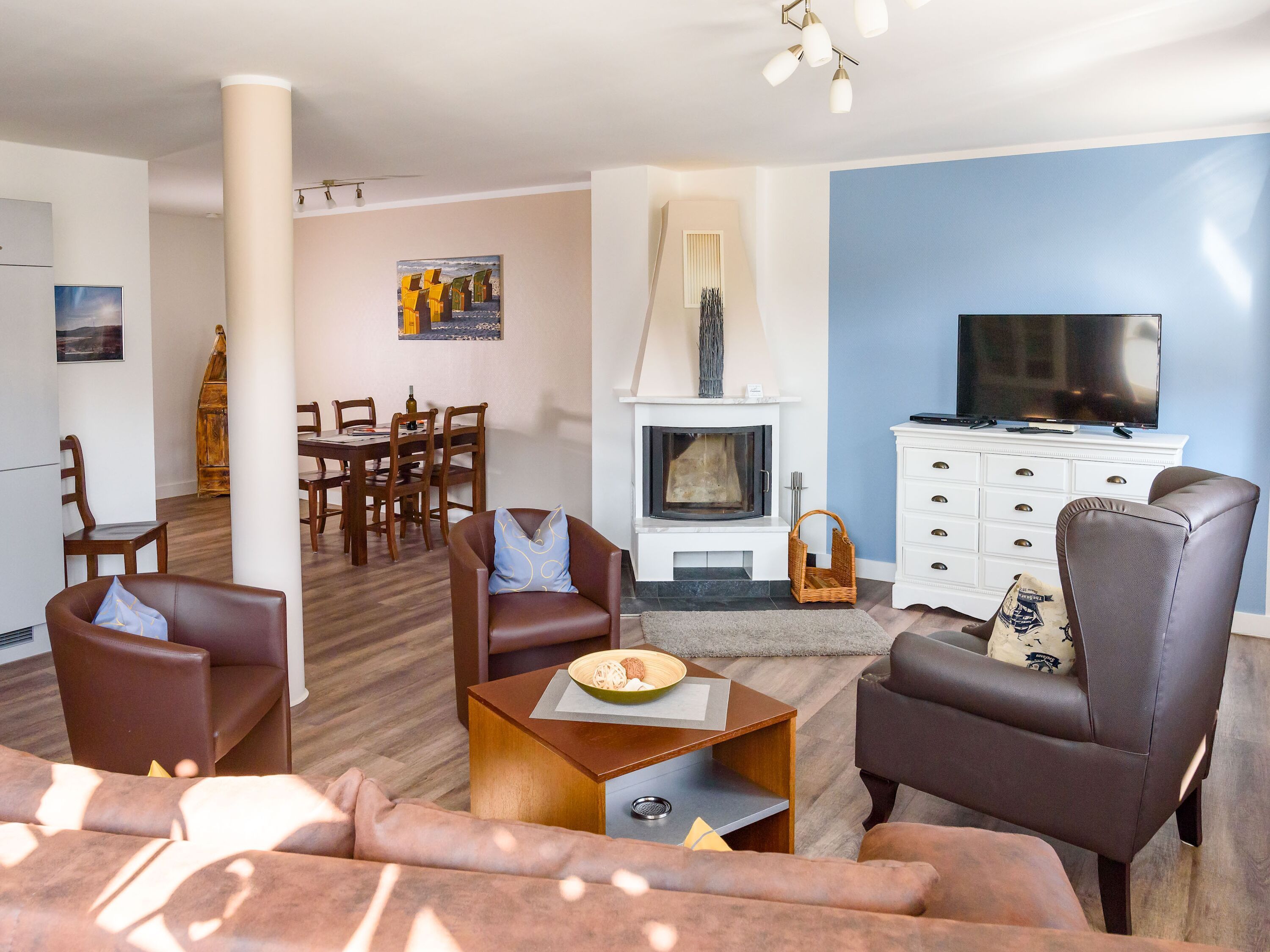 Vom Flur aus gelangen Sie in den gemütlich und modern ausgestatteten Wohn-/Essbereich. Hier finden Sie eine gemütliche (Schlaf)Couch (1,25 x 2,00m), einen Flachbild-Fernseher, DVD-Player und eine Musikanlage sowie einen Kamin für gemütliche Stunden. Von der großen Fensterfront im Wohnzimmer kann man das Treiben auf der Binzer Einkaufsmeile beobachten.