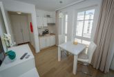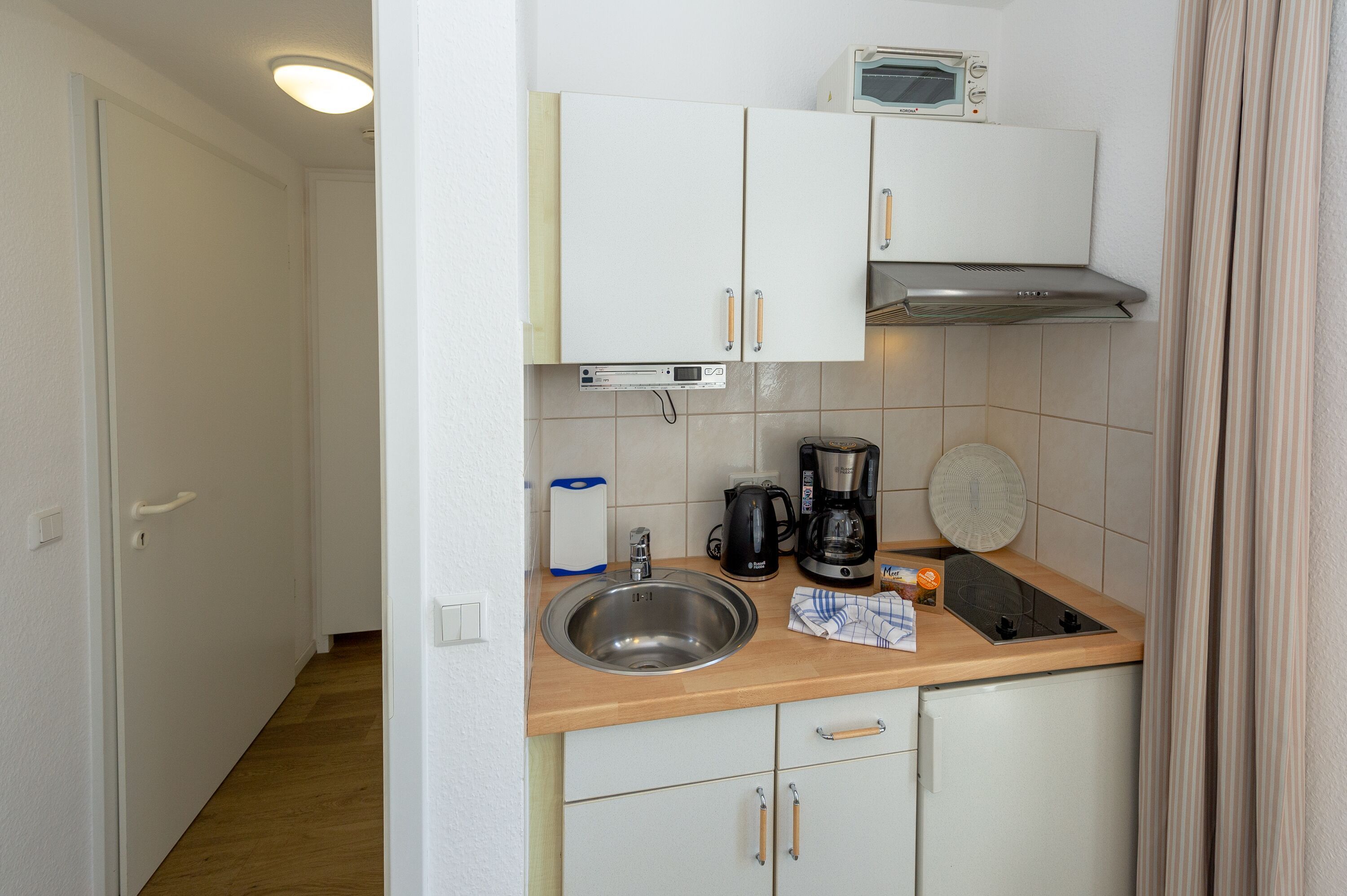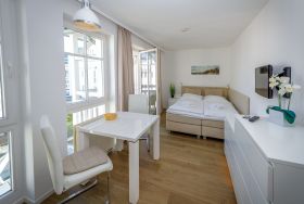 Die angenehm helle 1-Zimmer-Wohnung verfügt über einen kombinierten Wohn-/Schlafbereich mit einem kuscheligen Doppelbett (160 x 200 cm), einem Flachbild-TV, einem Radio und einer integrierten Küchenzeile.