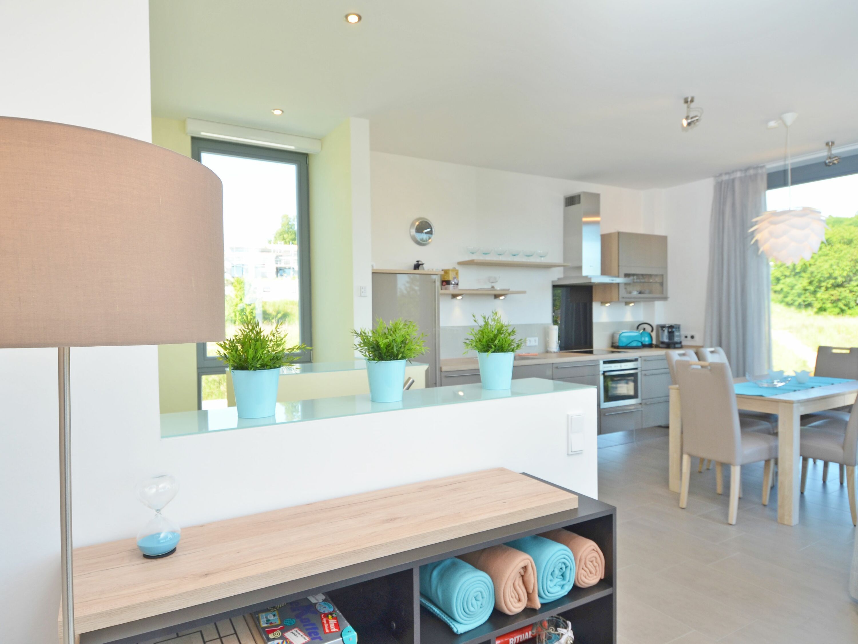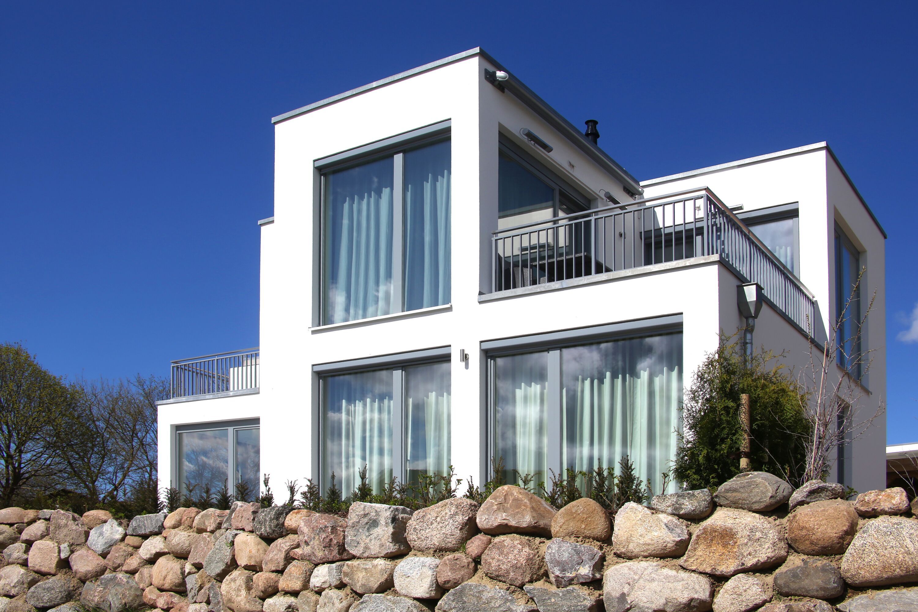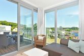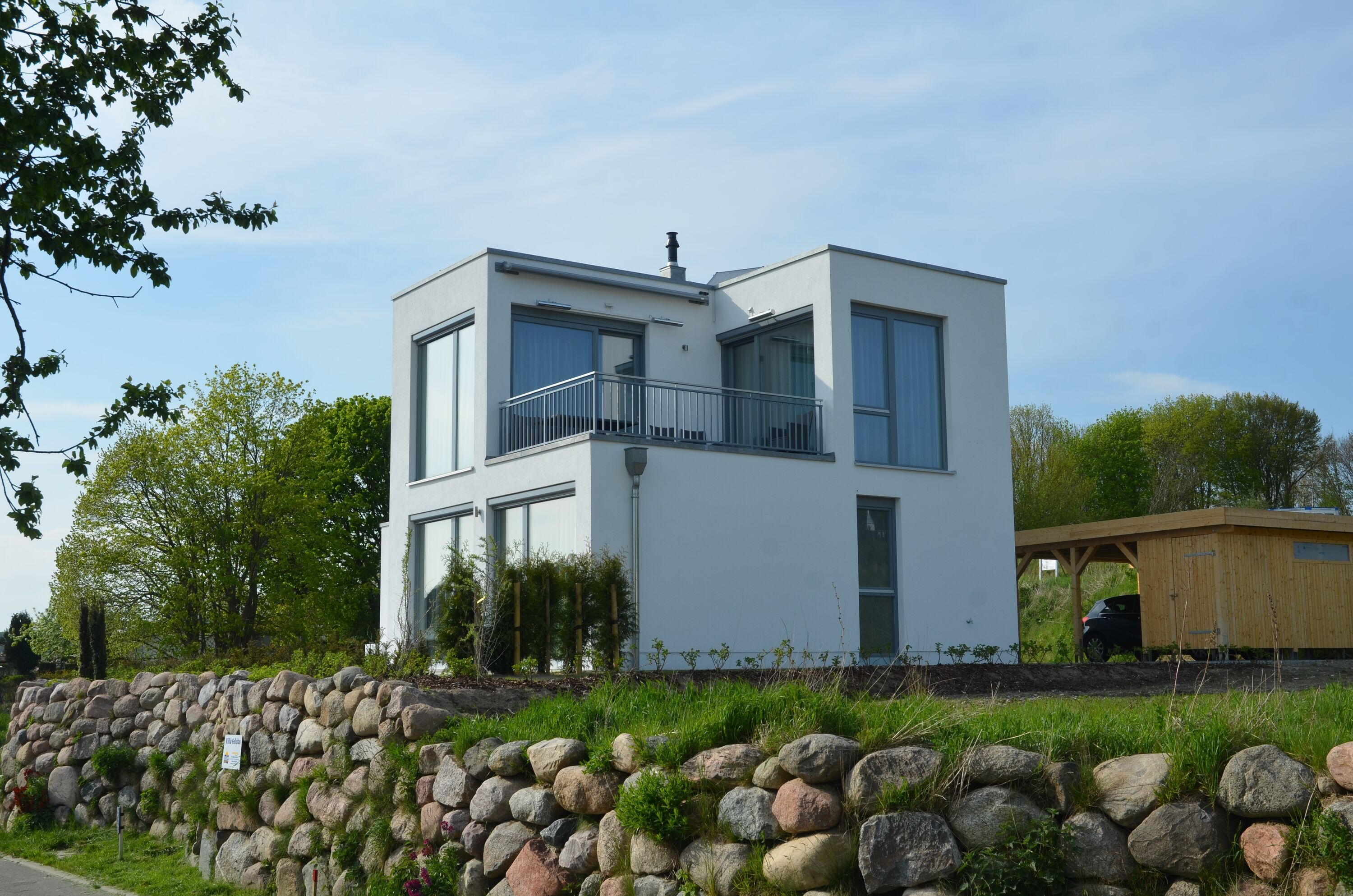 Diese moderne Doppelhaushälfte im Bauhausstil mit modernster Heizungs- und Lüftungstechnik liegt im Herzen des Ostseebades Binz und verspricht auf 80 m² Grundfläche Wohnqualität der Spitzenklasse. Die möblierte Dachterrasse und die große Terrasse mit Loungemöbeln im Erdgeschoss laden zum Relaxen ein und bieten ein besonderes Urlaubsfeeling. Die Südost-Lage ermöglicht einen wundervollen und direkten Blick auf den zukünftigen Golfplatz. Die Heizstrahler auf der Dachterrasse laden gemeinsam mit der großen Markise dazu ein, auch kalte Abende gemütlich mit einem Glas Wein an der frischen Luft ausklingen zu lassen.