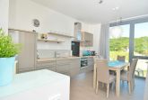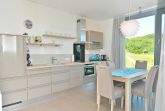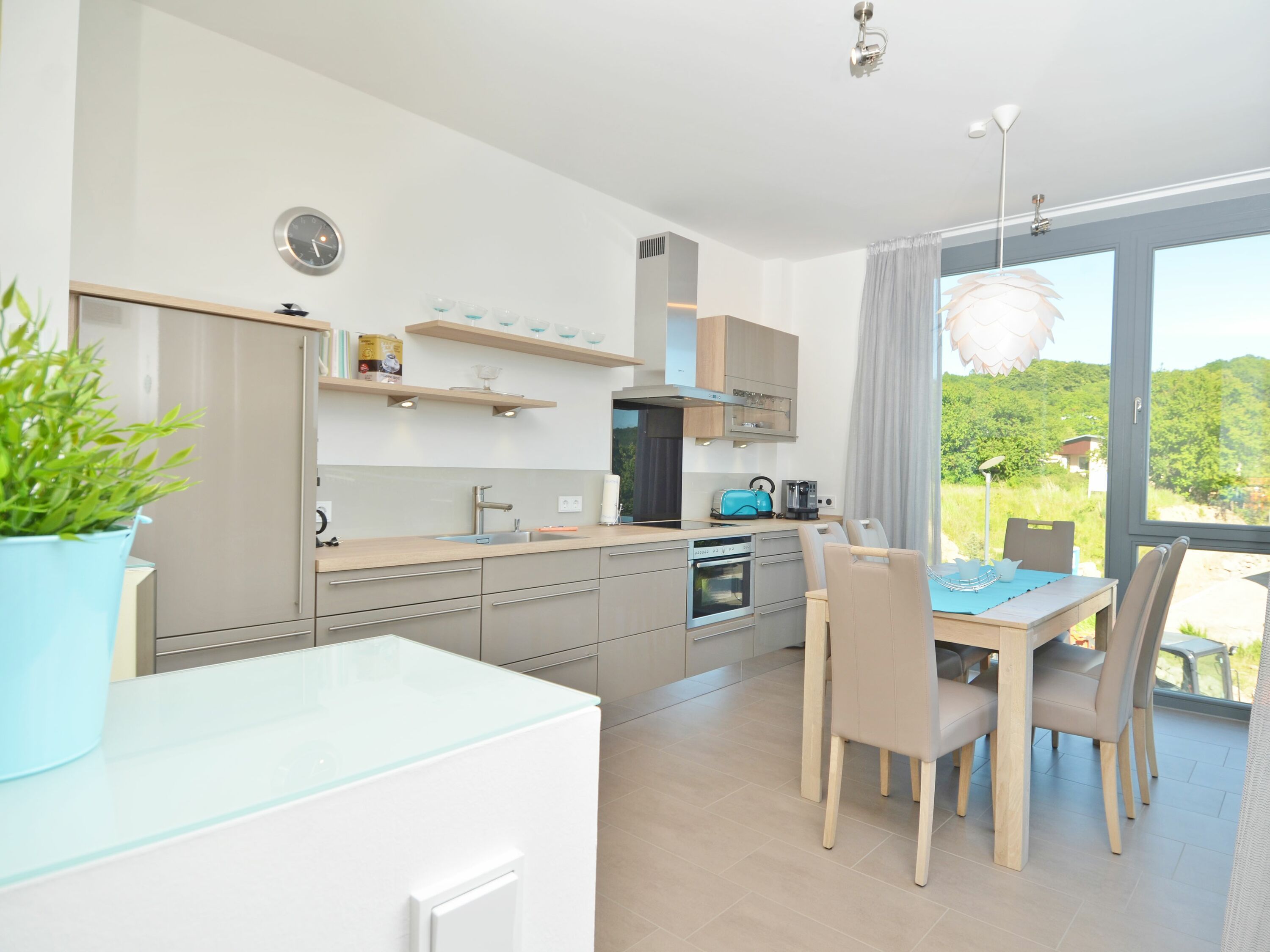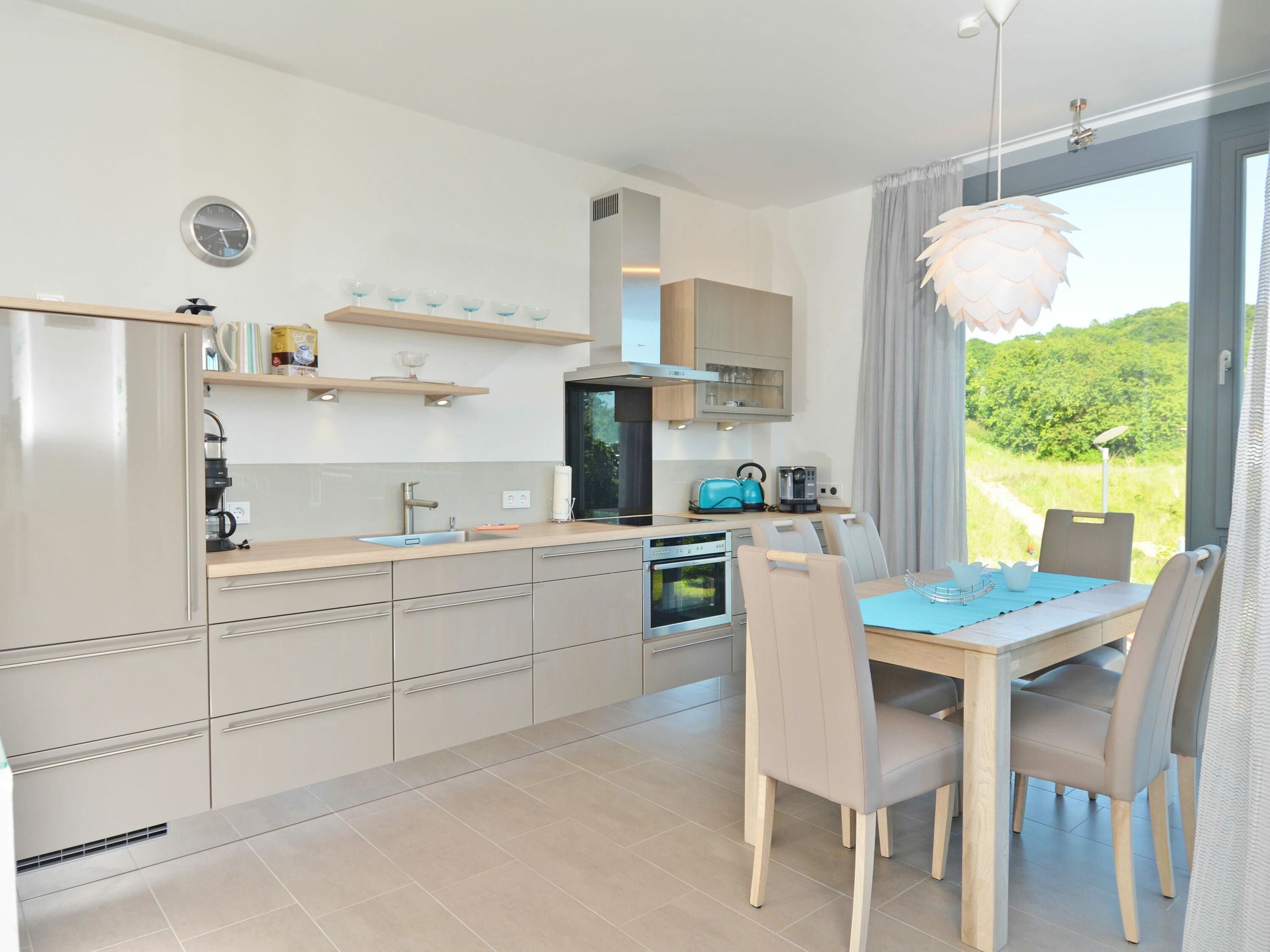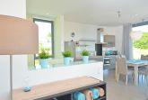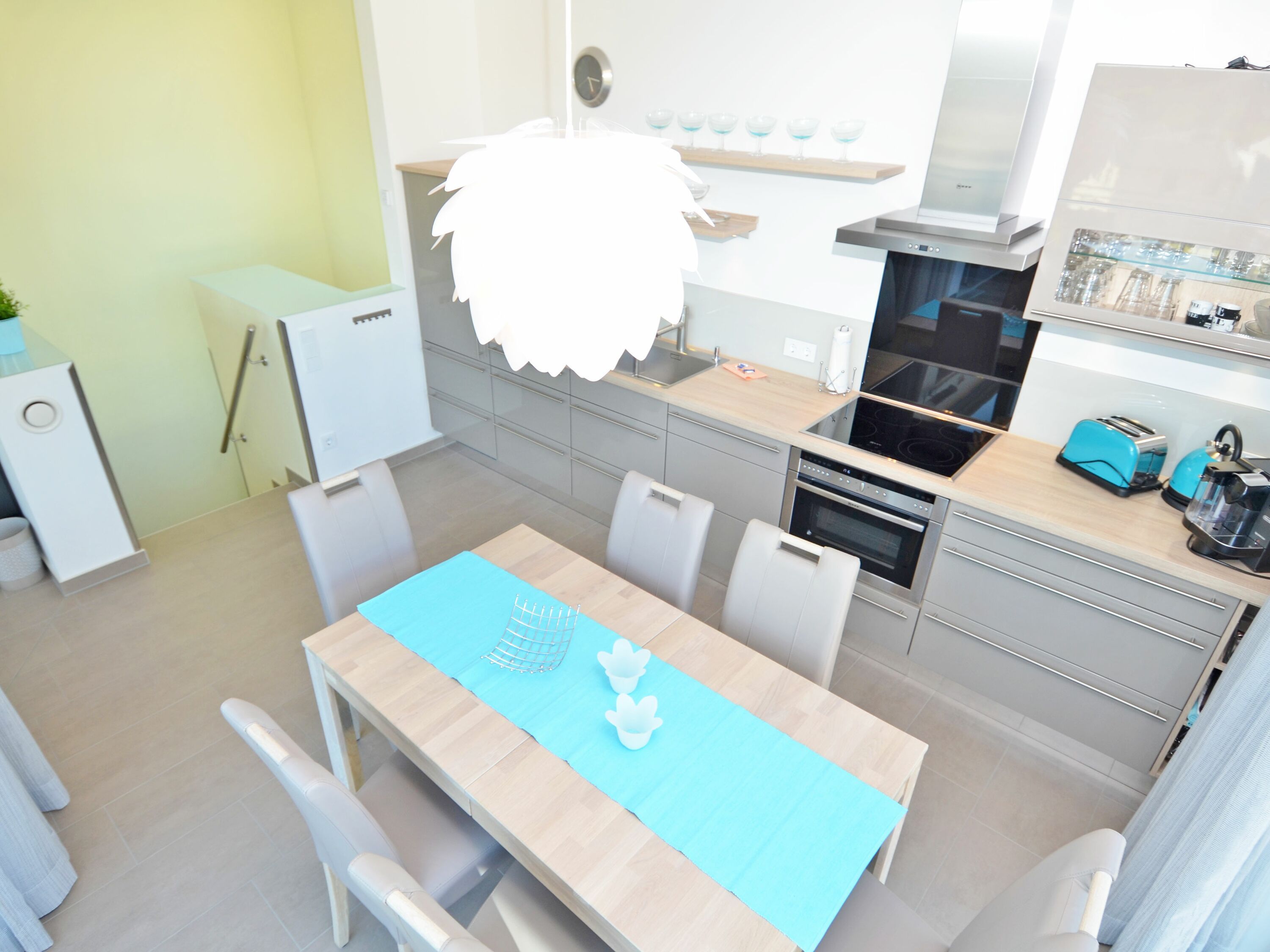 Optisch vom Wohnbereich getrennt befindet sich der Essbereich mit einem großen Esstisch für genussreiche, kulinarische Erlebnisse. Die komplett ausgestattete, harmonisch in den Raum integrierte hochwertige Einbauküche in exzellenter Ausstattung mit einem Backofen mit integrierter Mikrowelle, einem Kühlschrank mit Gefrierfach, einer Geschirrspülmaschine, einem Espresso Automaten, Kaffeemaschine, Toaster, Wasserkocher und diversem Kleininventar lassen keine Wünsche offen.