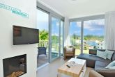 Im modern ausgestatteten lichtdurchfluteten großen Wohnzimmer mit integrierter Küchenzeile erwarten Sie eine gemütliche Sitzecke sowie ein Flachbild-TV mit Kabelfernsehen. Ein Gas-Kamin macht kuschelige Stunden vor dem prasselnden Kaminfeuer für Sie möglich.
