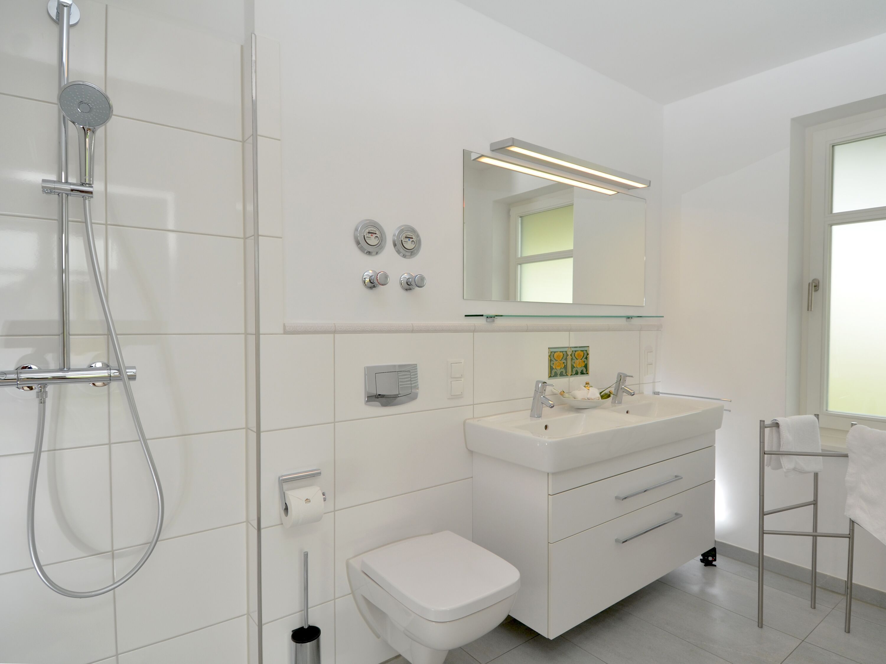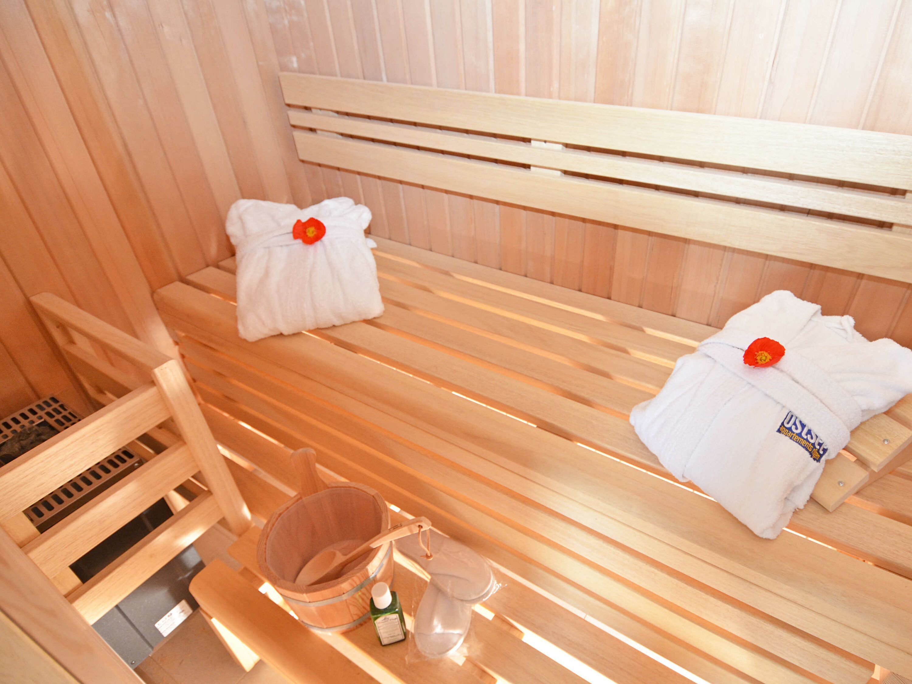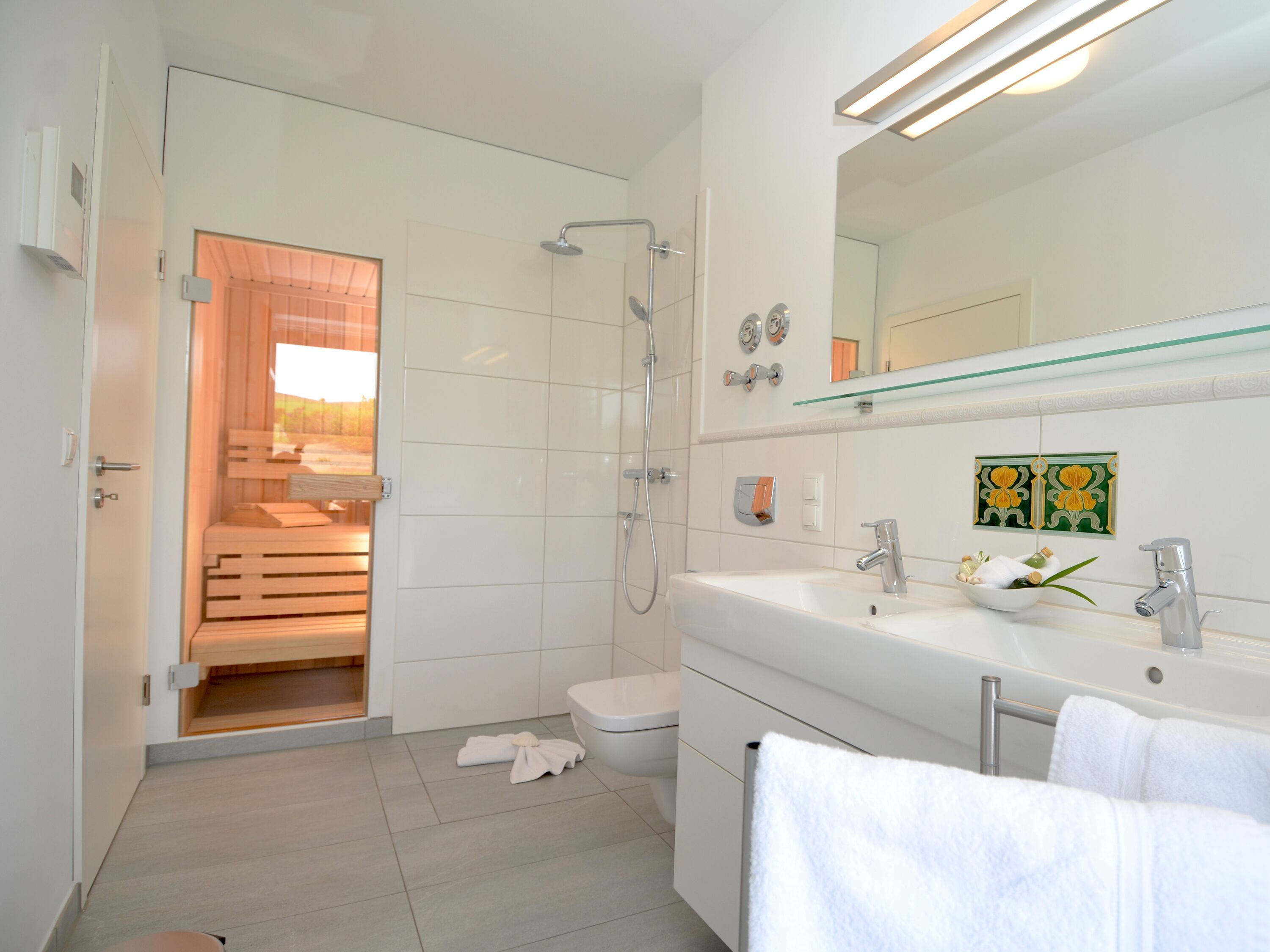 Im Badezimmer mit Tageslicht gibt es neben einem Doppelwaschbecken eine bodentiefe Dusche, ein WC und sogar eine eigene Sauna zum Relaxen.