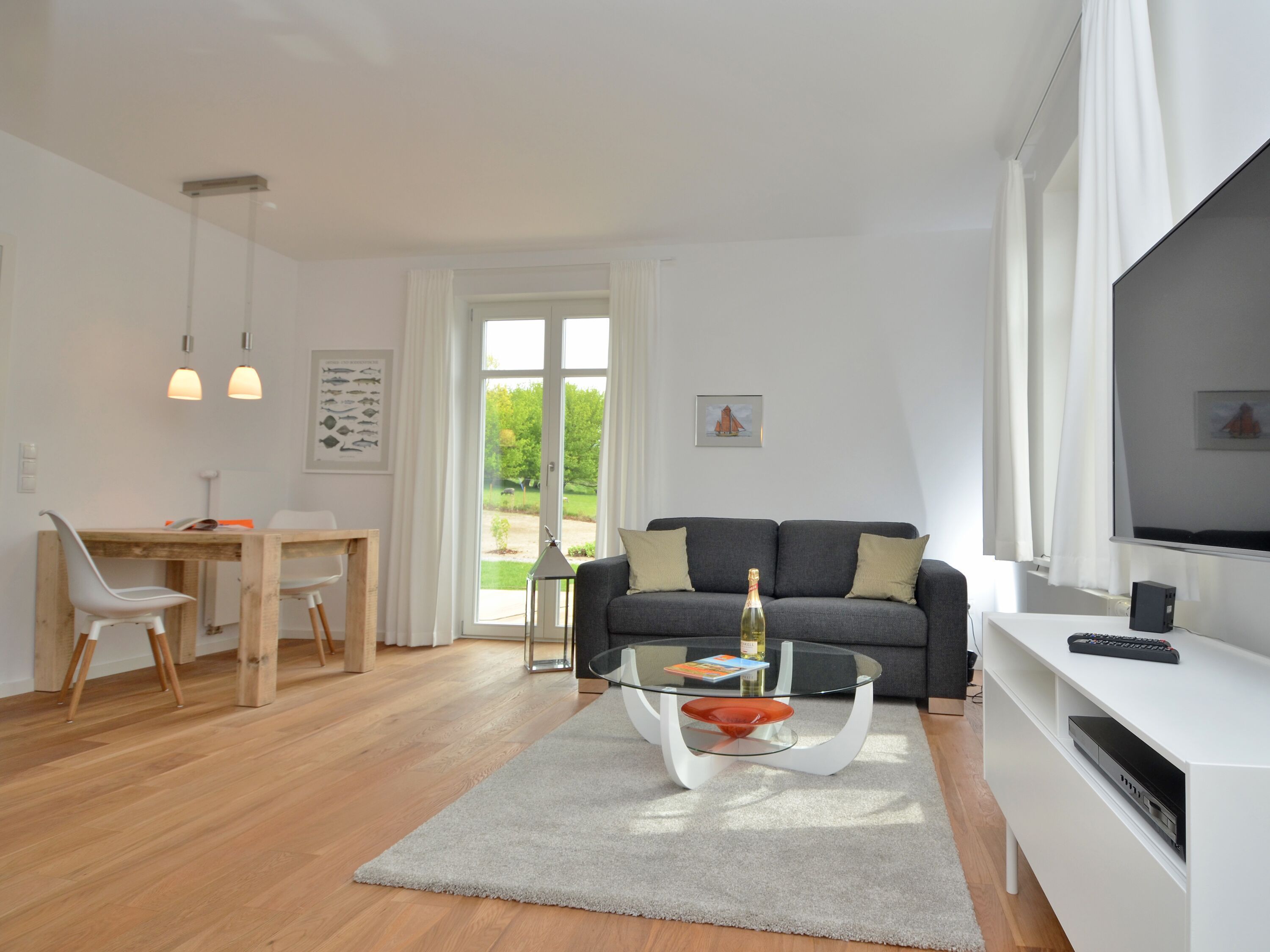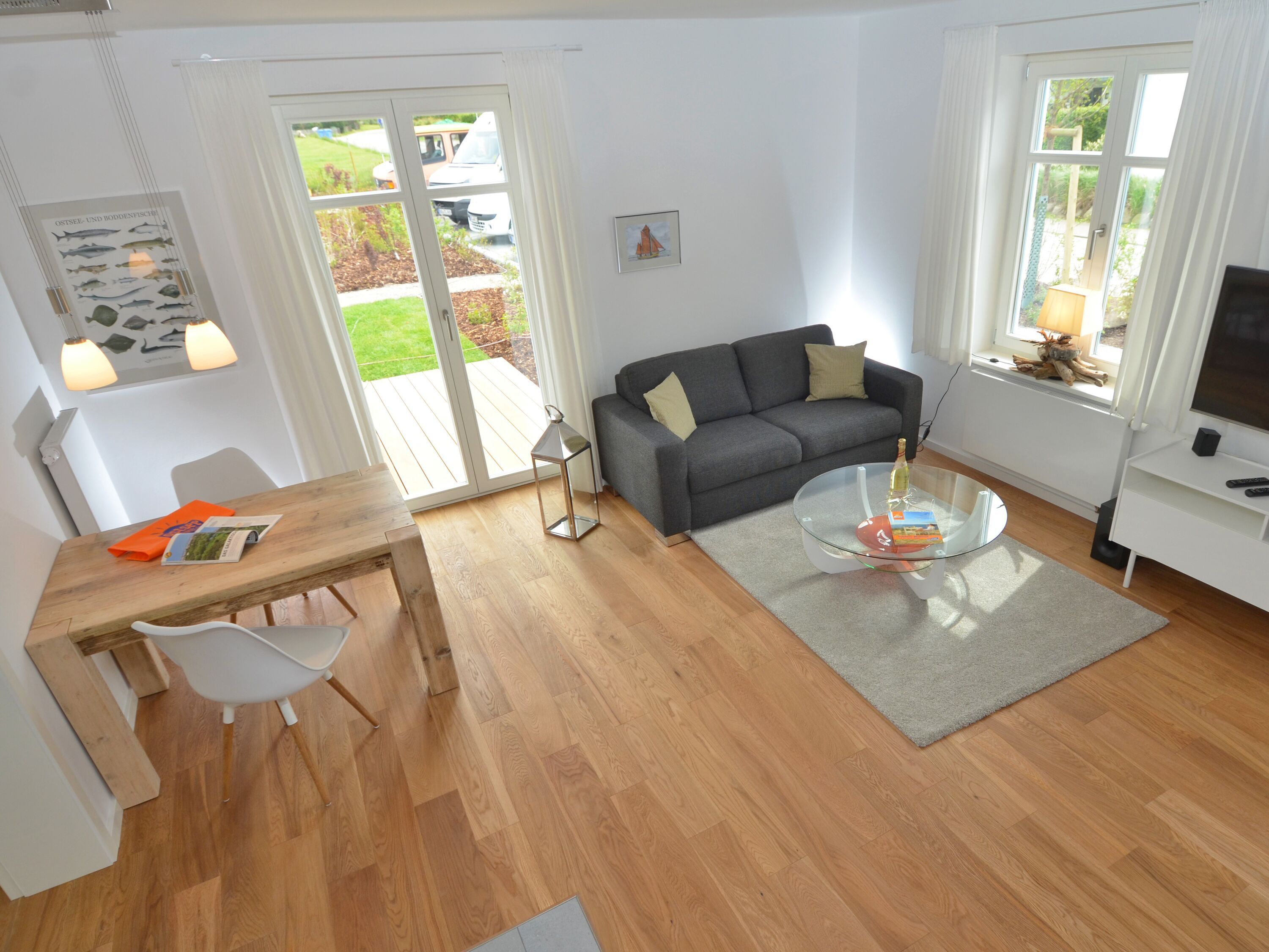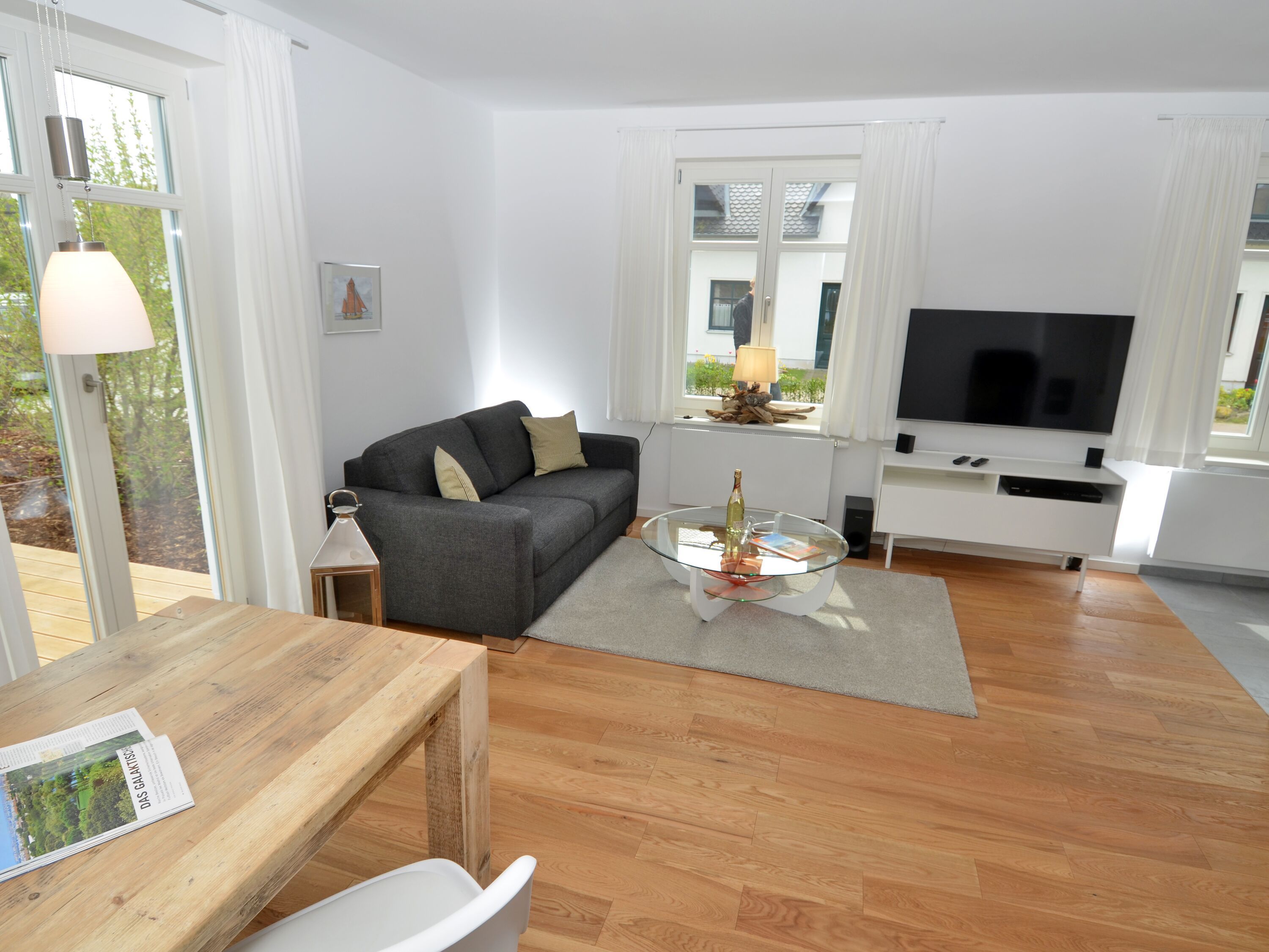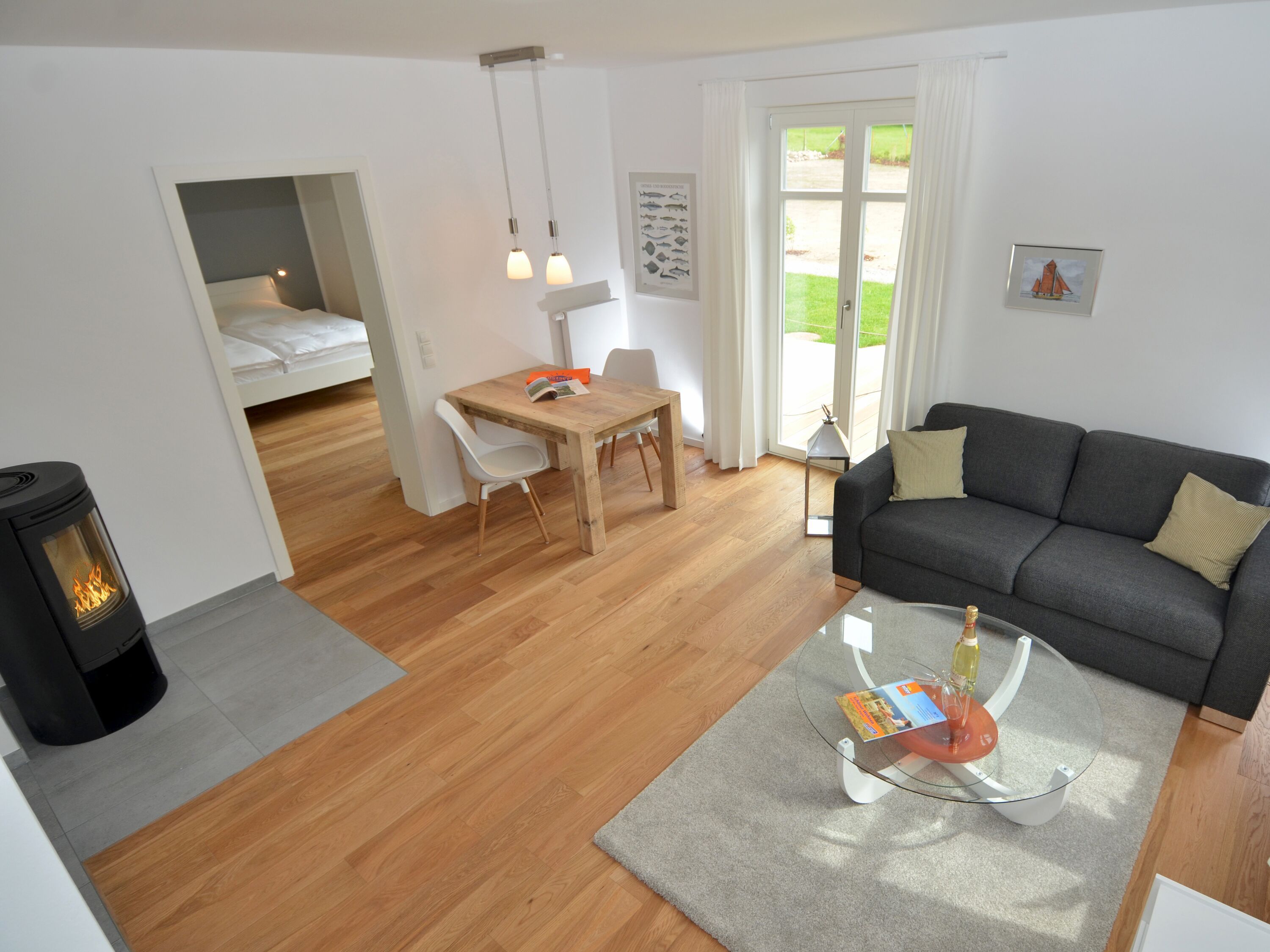 Eine bequeme Couchecke lädt zu gemütlichen Stunden vor dem Kaminofen ein. Zum technischen Equipment gehören u.a. ein QLED-Smart-TV mit riesigen 50 Zoll Bilddiagonale, ein DVD-Player sowie eine Musikanlage mit Radio/CD-Player/Bluetooth-Schnittstelle und USB-Anschluss. Superschnelles W-LAN (Glasfaser-Anschluss mit bis zu 250 Mbit/s) ist kostenfrei verfügbar.