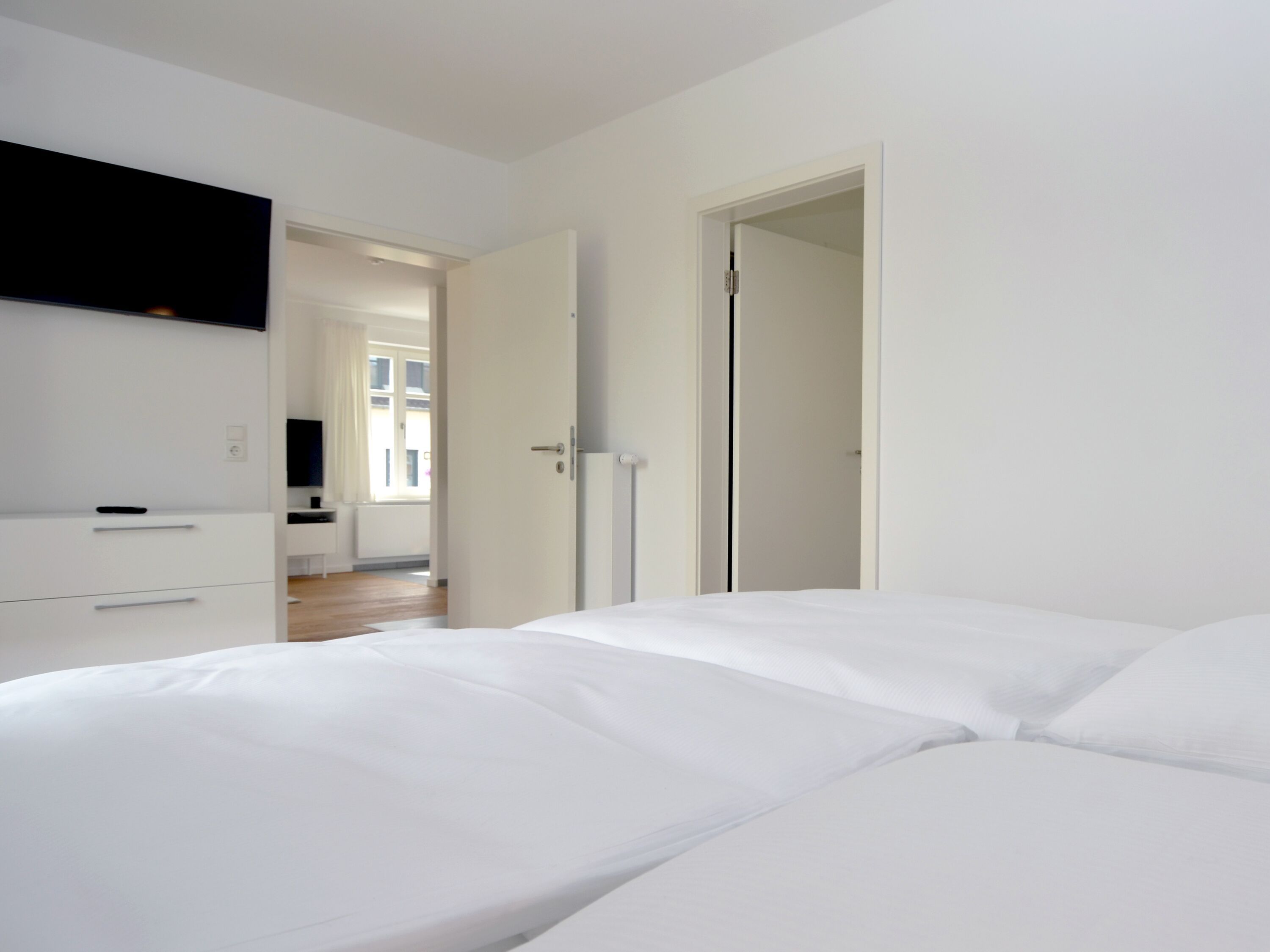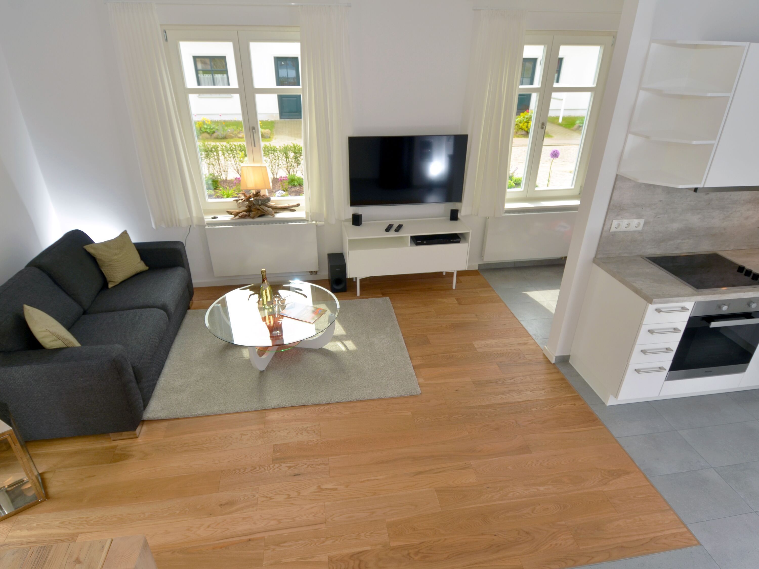 Dieses Appartement begrüßt Sie im Erdgeschoss des Hauses, auf der rechten Seite und verfügt über ca. 50 m² Wohnfläche. Bei der Einrichtung stehen Funktionalität, Exklusivität und Hochwertigkeit im Vordergrund. Die Ausstattung lässt daher keine Wünsche offen. Die Böden sind mit Eichenholz ausgelegt.