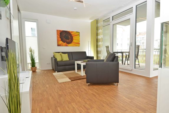 Vom lichtdurchfluteten und freundlich gestalteten Wohnbereich gelangen Sie direkt auf den 8 m² großen, zum Innenhof ausgerichteten, möblierten Süd-Ost-Balkon. Im Wohnbereich steht eine hochwertige Leder-Schlafcouch mit vollwertiger Matratze (1,4m x 2m) zur Verfügung. Flachbildfernseher, eine Stereo-Anlage mit CD-Player, Bluetooth-Verbindung und USB-Anschluss sowie ein Blu-ray/DVD-Player sorgen für Ihre Unterhaltung.
