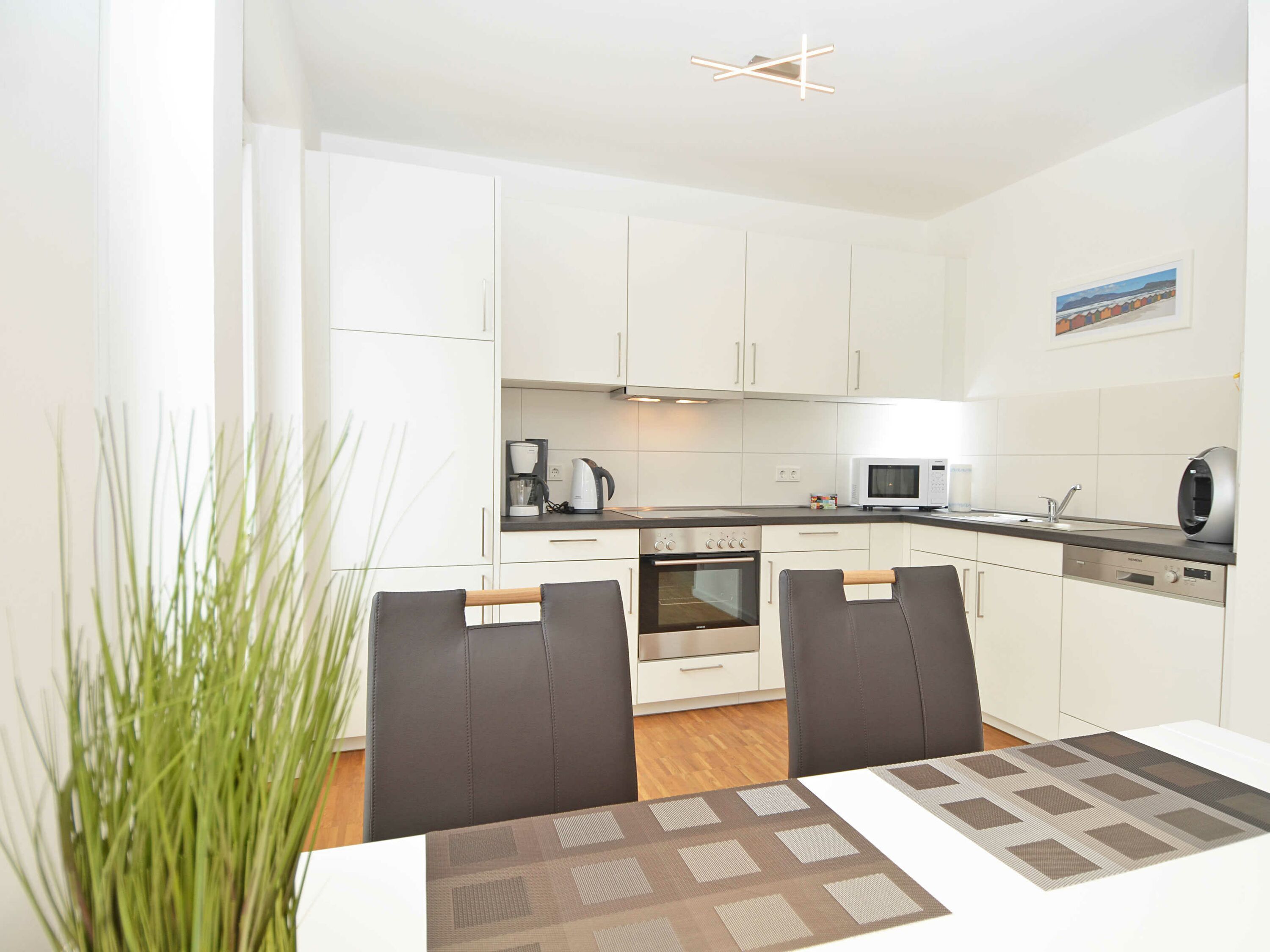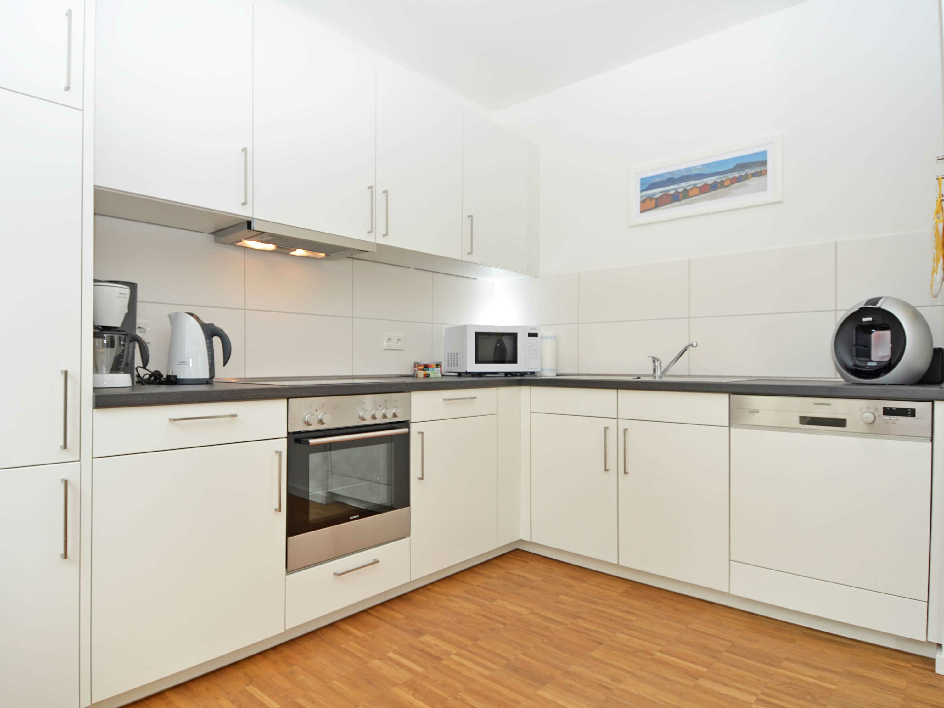 Die Küche ist hochwertig ausgestattet mit einem Kühlschrank mit Gefrierfach, Backofen, 4-Platten-Cerankochfeld, einer Mikrowelle und einer Geschirrspülmaschine. Ein Nescafé Dolce Gusto-Kapselautomat sowie umfangreiche Küchenaccessoires (u.a. Eierkocher, Toaster, Wasserkocher, Kaffeemaschine, Mixer, Pürierstab) komplettieren die tolle Ausstattung.