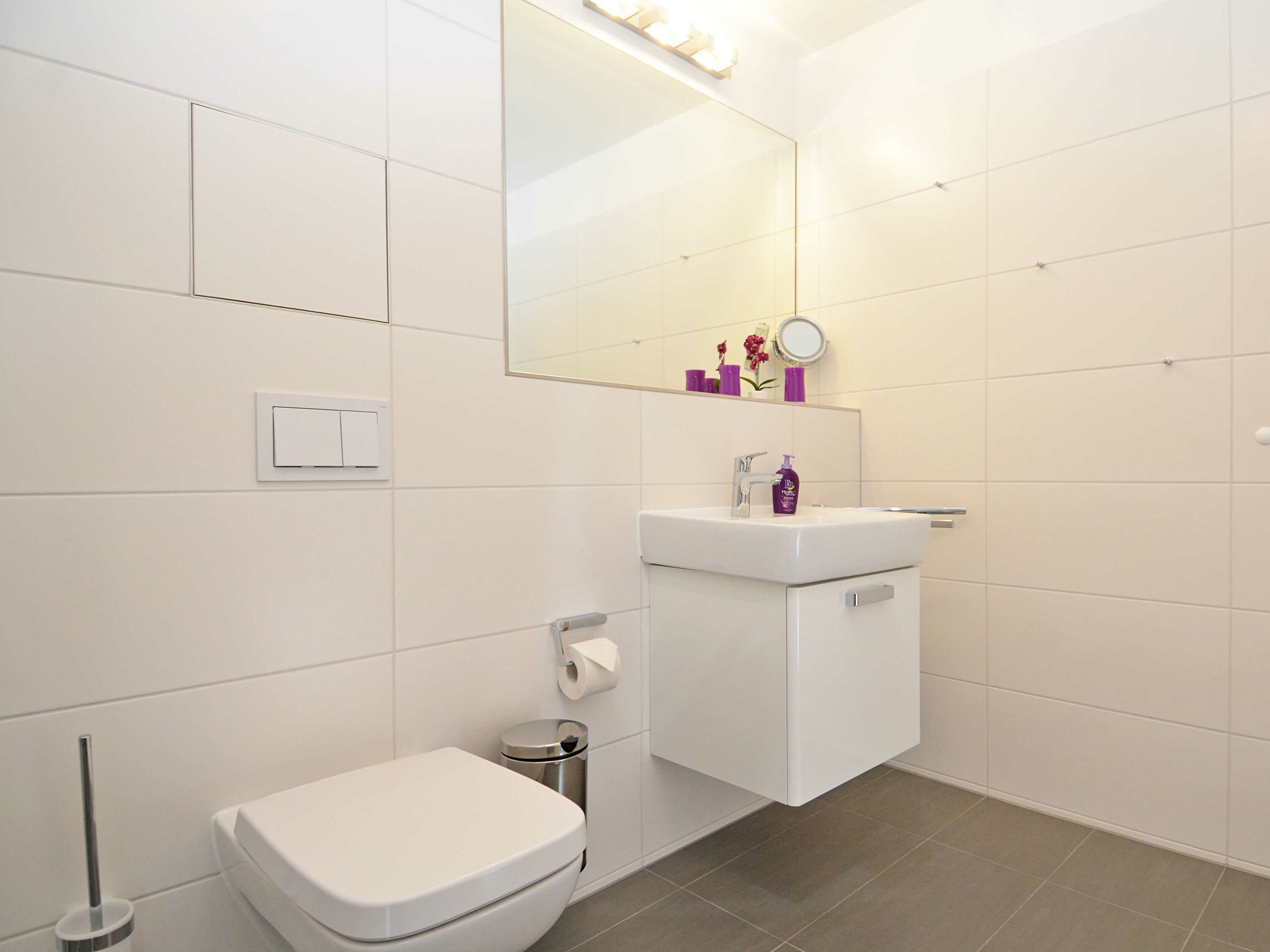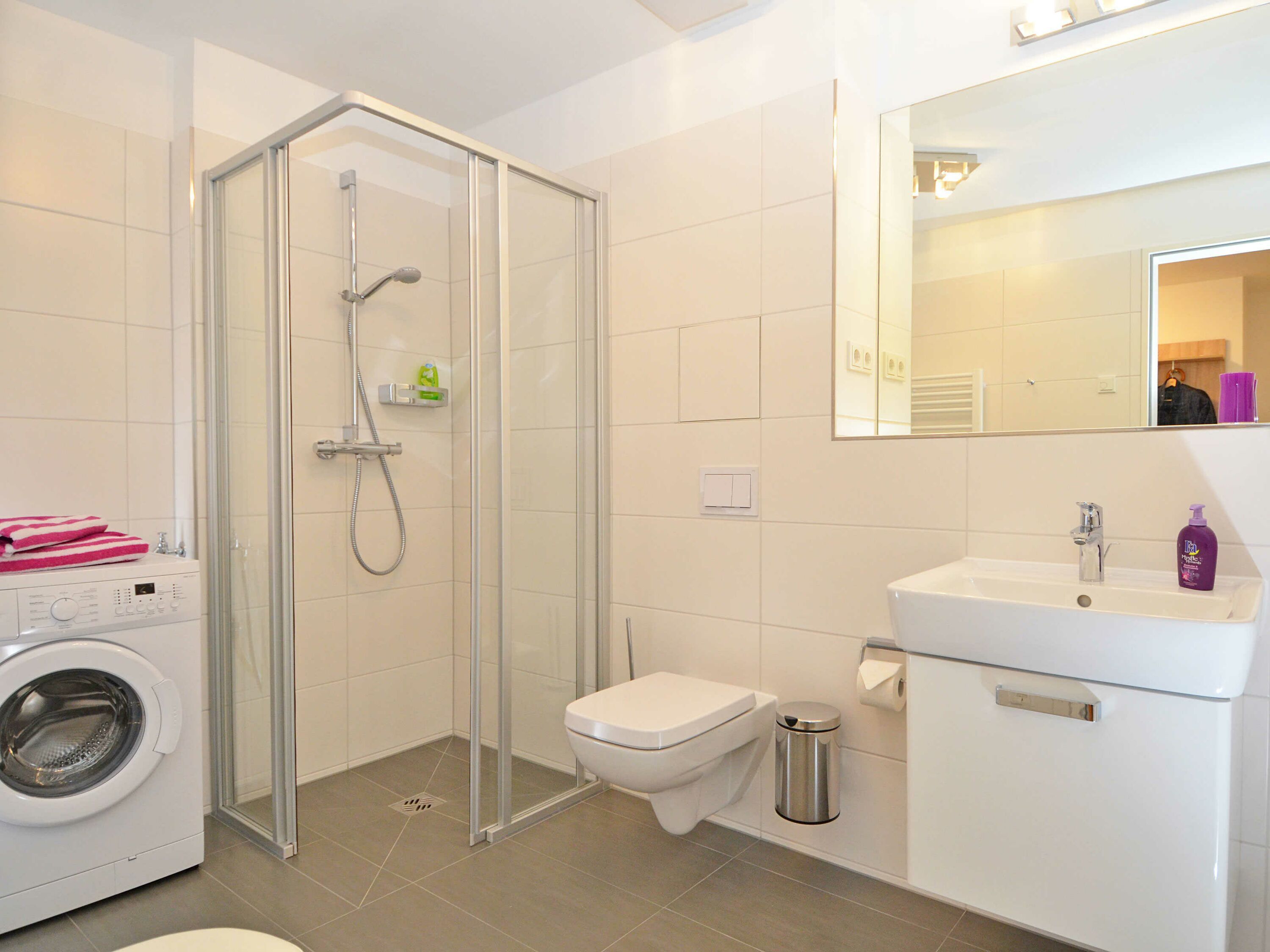 Die Wohnung verfügt über ein modern gefliestes Bad mit bodengleicher Dusche. Neben einem Kosmetikspiegel finden Sie einen Haartrockner und einen elektrischen Handtuchtrockner. Waschmaschine, Bügeleisen und Bügelbrett stehen Ihnen ebenso zu Ihrer Nutzung zur Verfügung.
