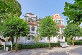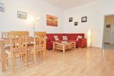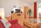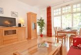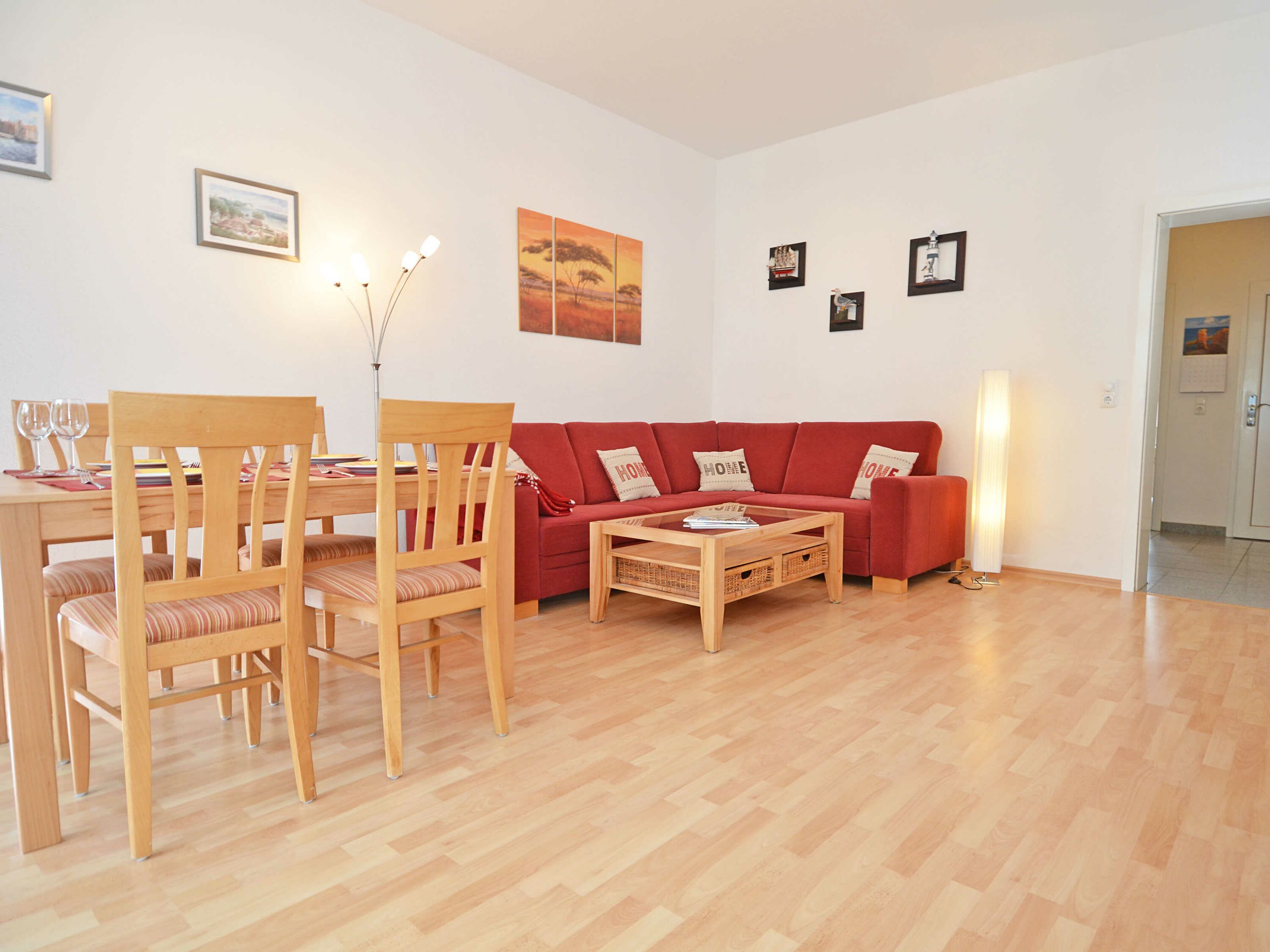 Der helle, freundlich eingerichtete Wohnraum verfügt über einen großen Esstisch für 4 Personen, eine bequeme Schlafcouch, eine Schrankwand mit beleuchteter Vitrine sowie LCD-TV und Radio/CD/DVD-Player. Bücher sowie diverse Spiele für Jung und Alt lassen keine Langeweile aufkommen. Vom Wohnraum aus gelangen Sie auf die große Loggia, die einen spektakulären Blick auf die Ostsee sowie die Strandpromenade bietet.