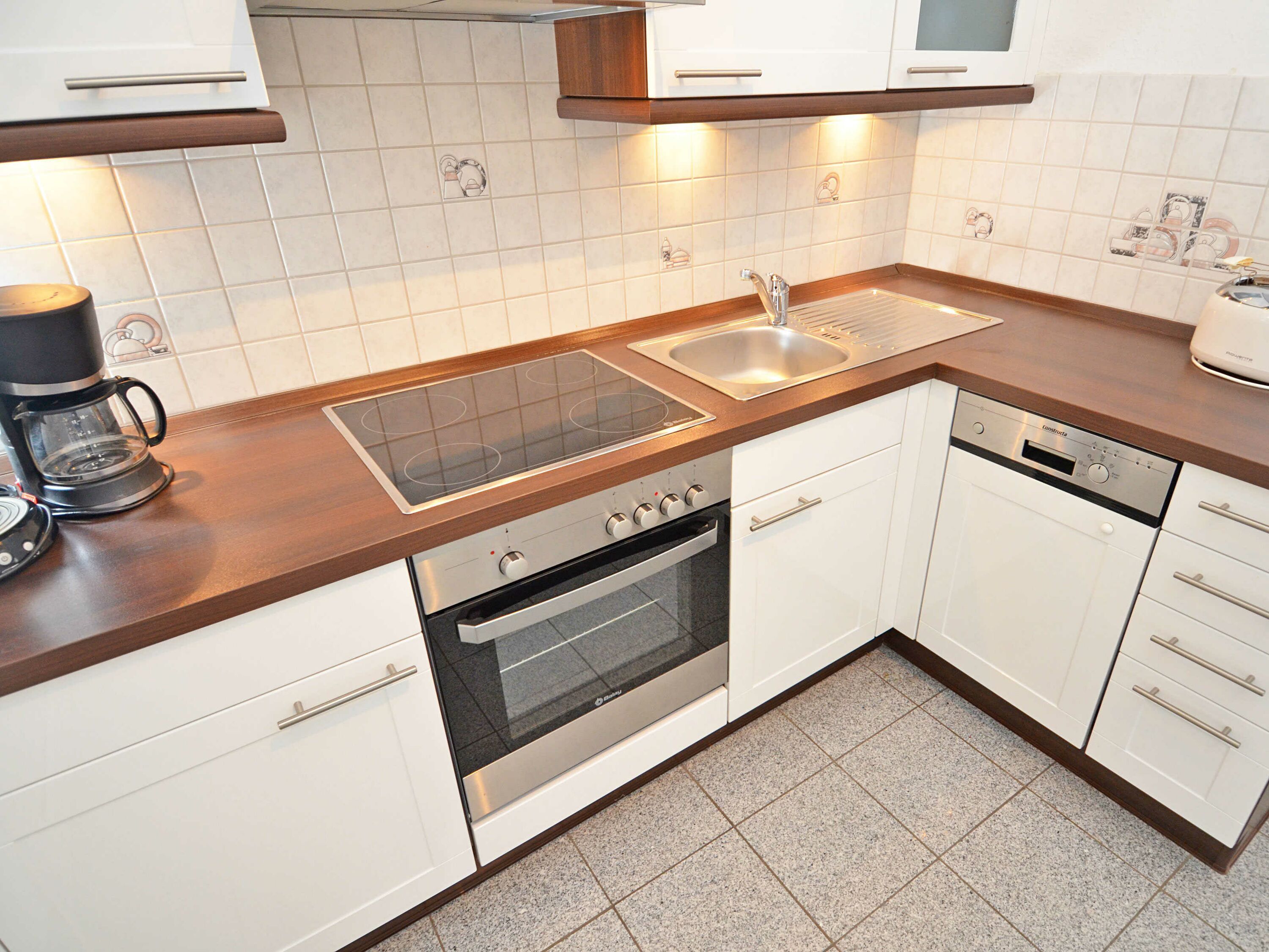 Die im Eingangsbereich harmonisch integrierte, hochwertige Einbauküche ist mit einem Cerankochfeld, einem Backofen, Dunstabzugshaube, Spülmaschine, Kaffeemaschine, Kaffeepadmaschine, Kühlschrank mit Tiefkühlfach, Toaster, Wasserkocher und diversem Kleininventar ausgestattet.