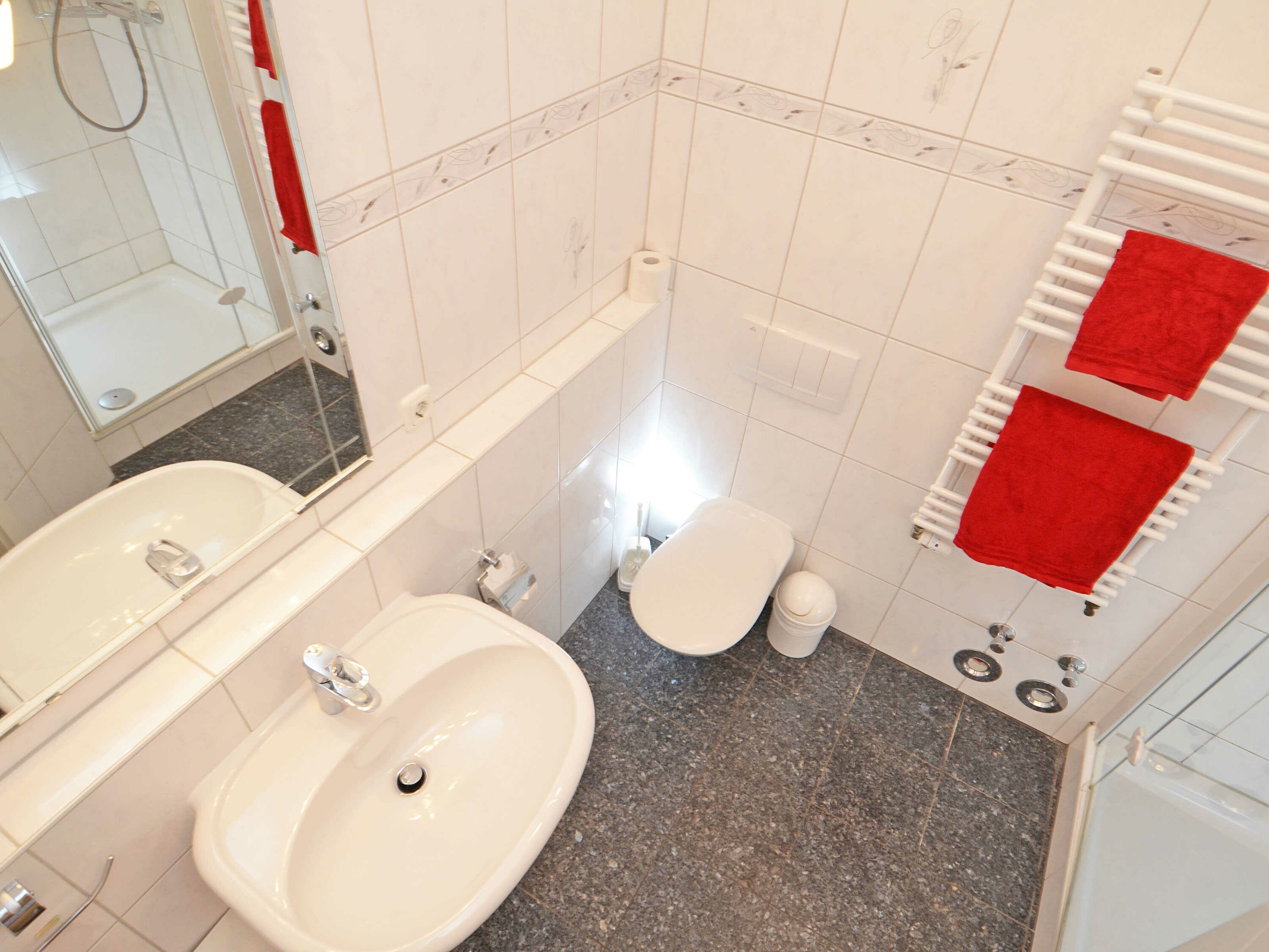 In dem modernen Duschbad finden Sie neben einer großzügigen Dusche mit Glastür auch einen Handtuchwärmer und einen Haartrockner.