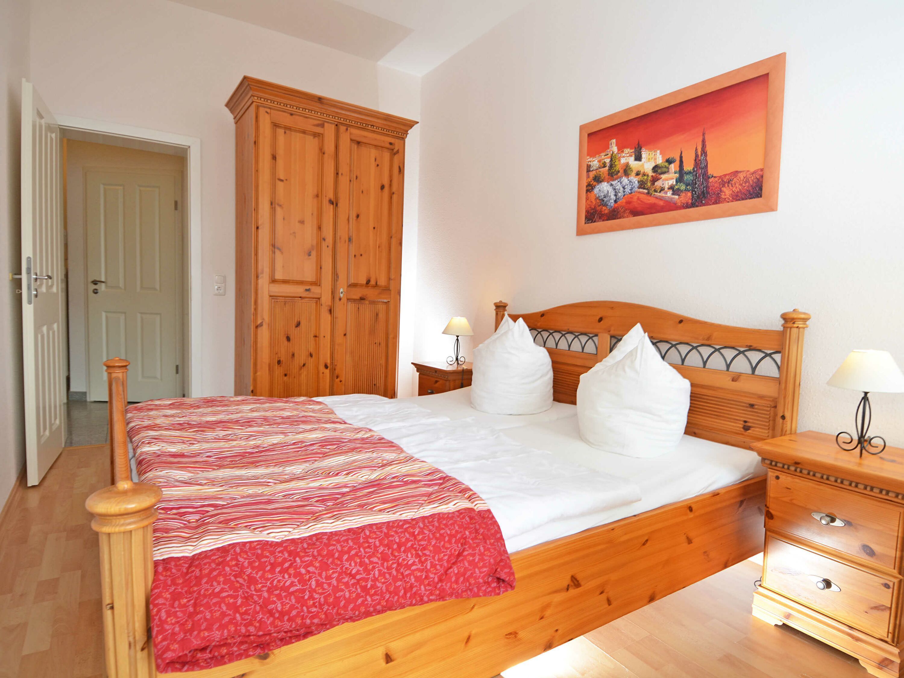 Das moderne, gemütliche Schlafzimmer ist mit einem bequemen Doppelbett (180 x 200 cm), zwei Nachtkommoden sowie einem zweitürigen Kleiderschrank ausgestattet und hat einen direkten Zugang zum Balkon.