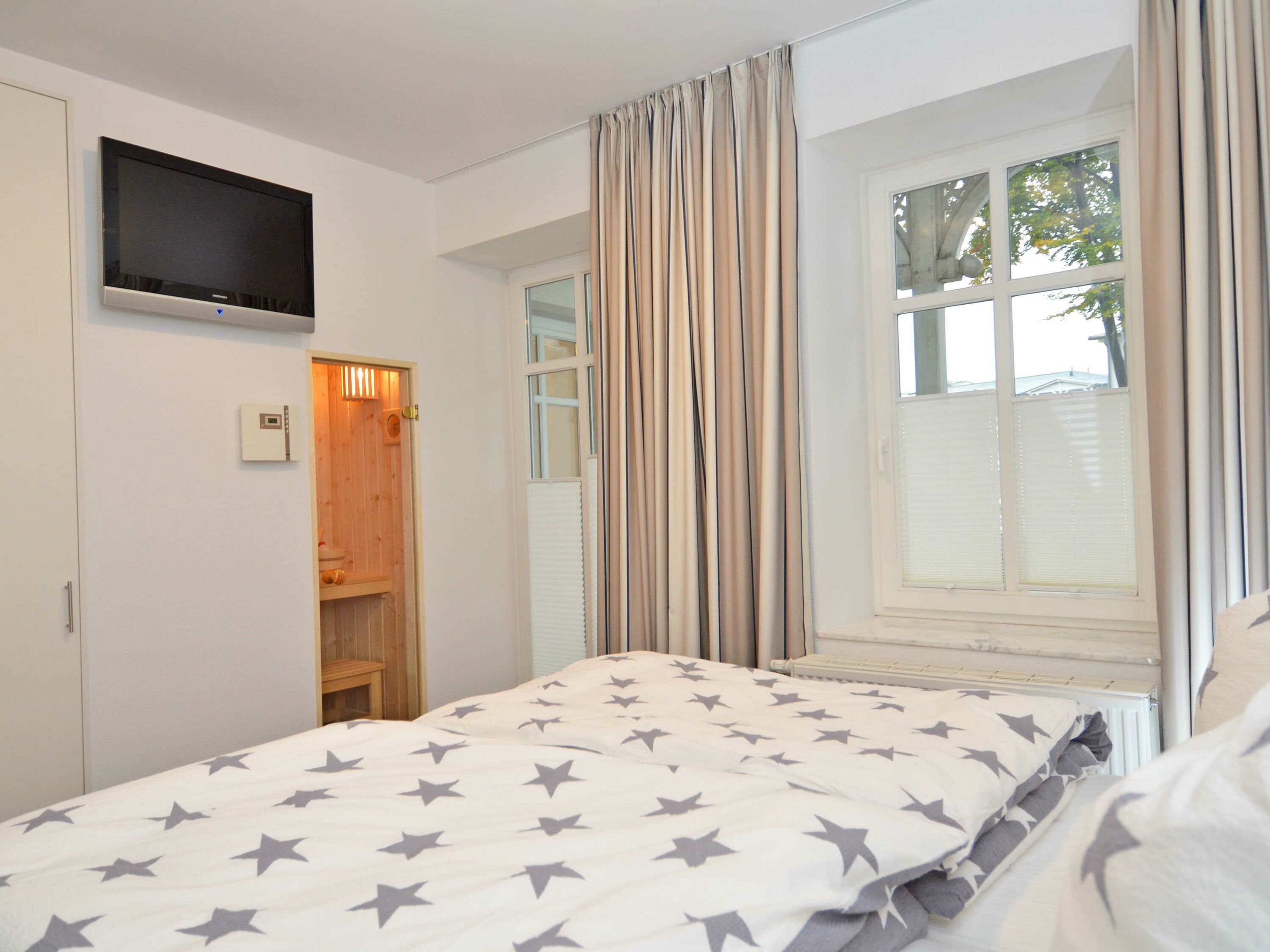 Im größeren Schlafzimmer befinden sich ein bequemes Boxspringbett in der Größe 1,80 x 2,00 m, ein Einbauschrank, ein weiterer Flachbild-TV sowie Verdunklungsrollos. Von hier haben Sie einen direkten Zugang zur wohnungseigenen Sauna und auch zum Balkon.