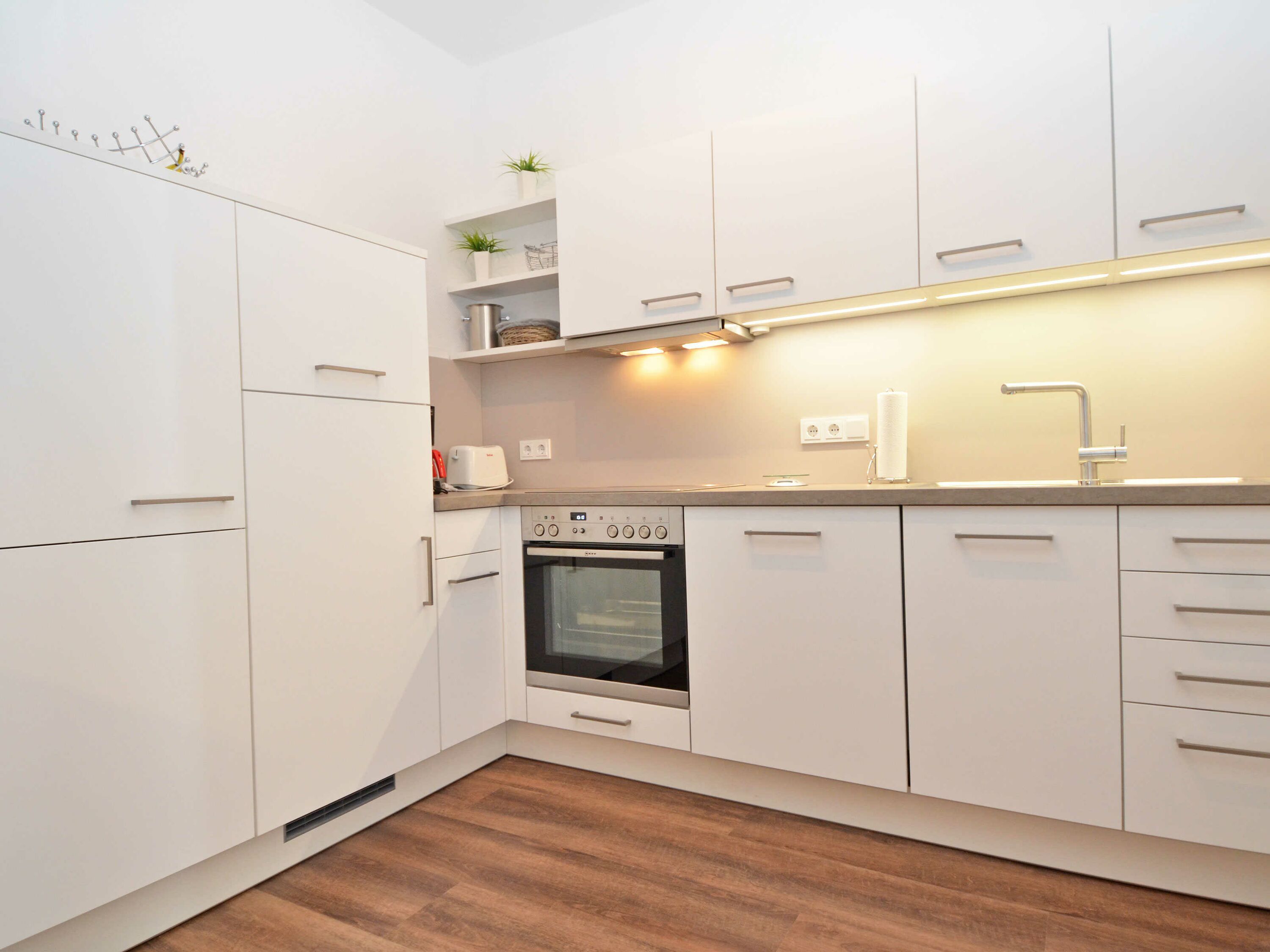 Die hochwertige Küchenzeile wurde harmonisch in den Wohnbereich integriert und ist mit einem Kühlschrank mit Gefrierfach, einem 4 Zonen-Cerankochfeld, einem Backofen, einem Geschirrspüler, einer Kaffeemaschine, Wasserkocher, Toaster, Mikrowelle, einem Raclettegerät, einem Crepe-Maker und diversem Kleininventar ausgestattet.