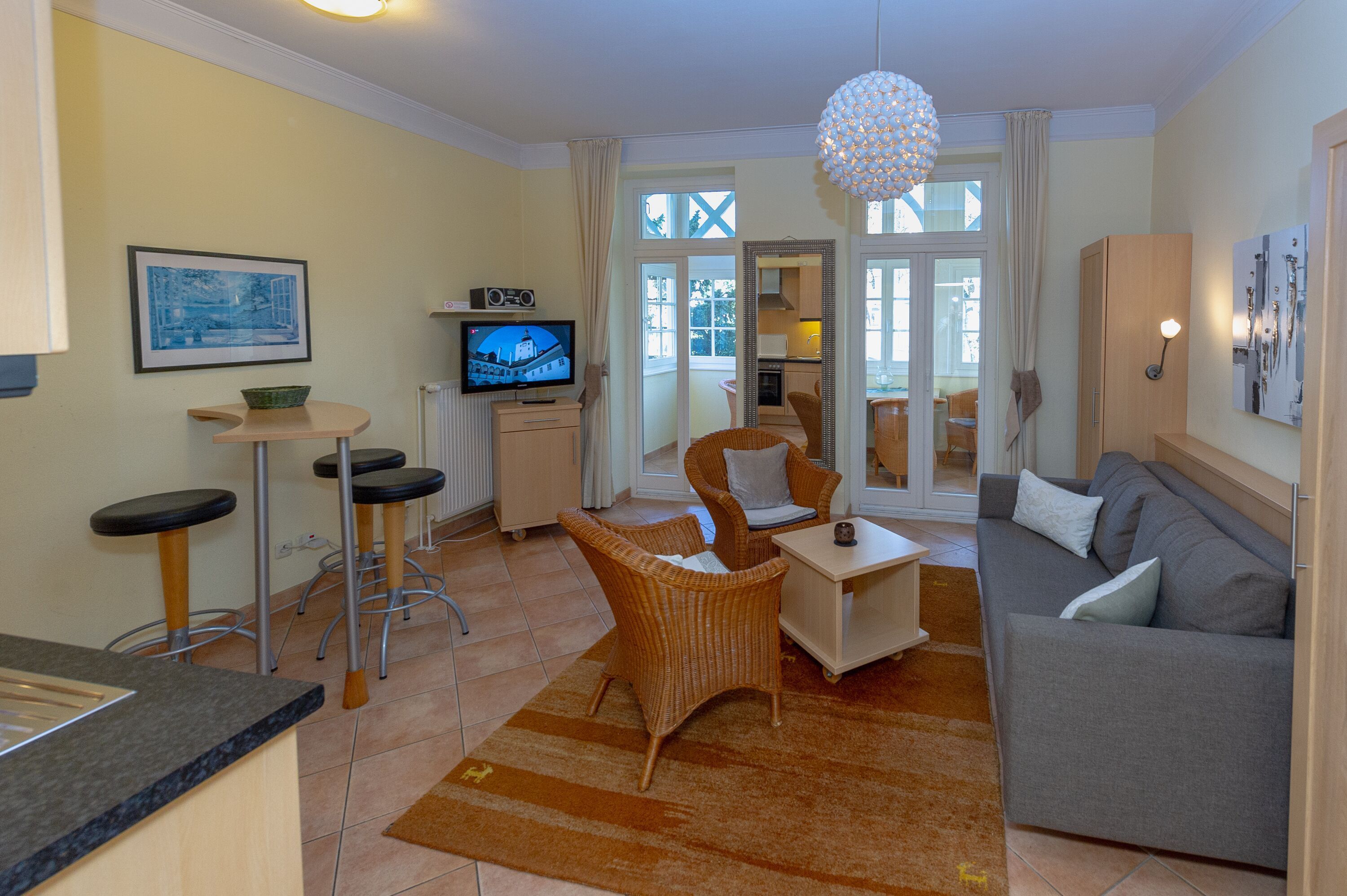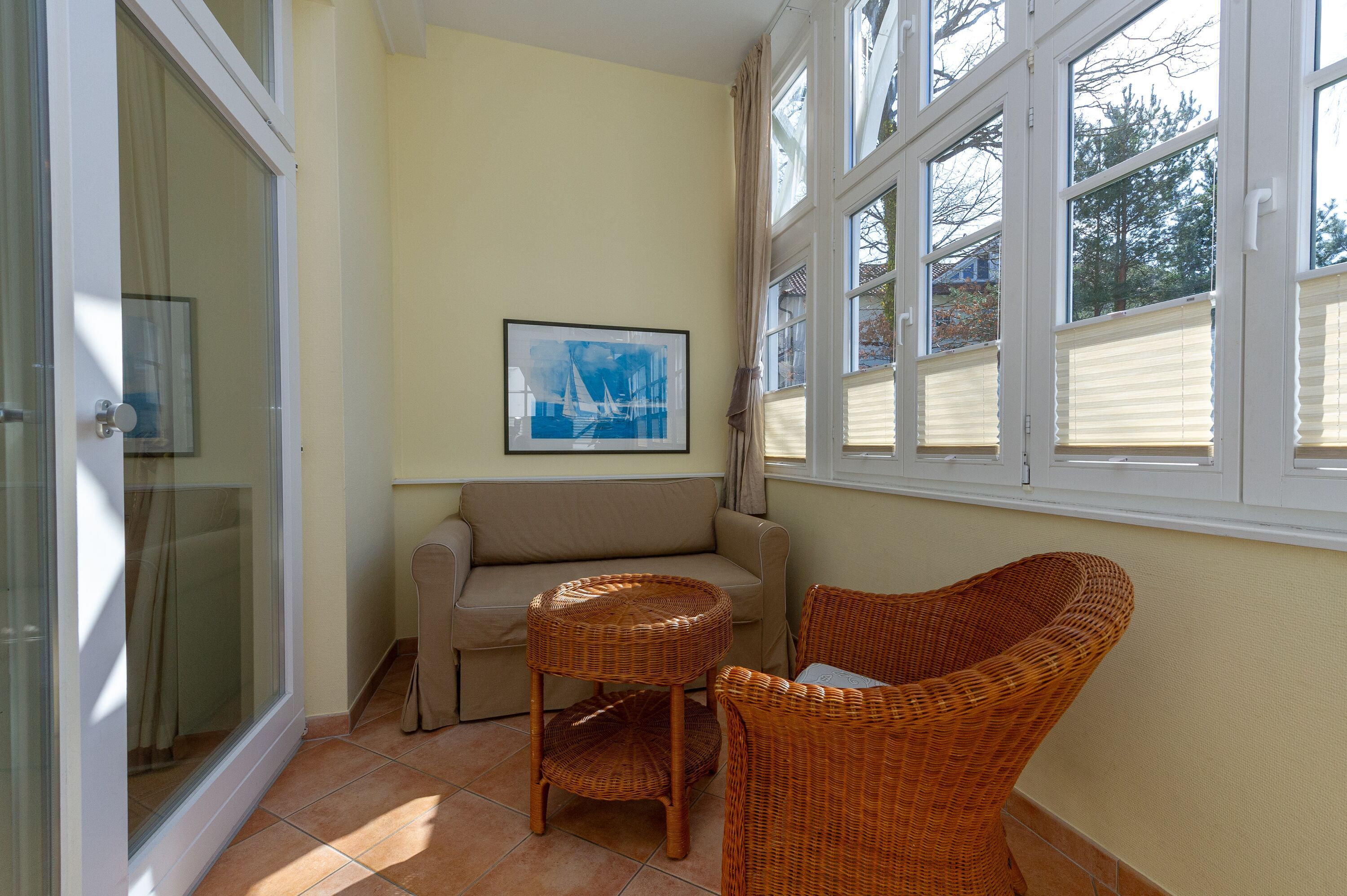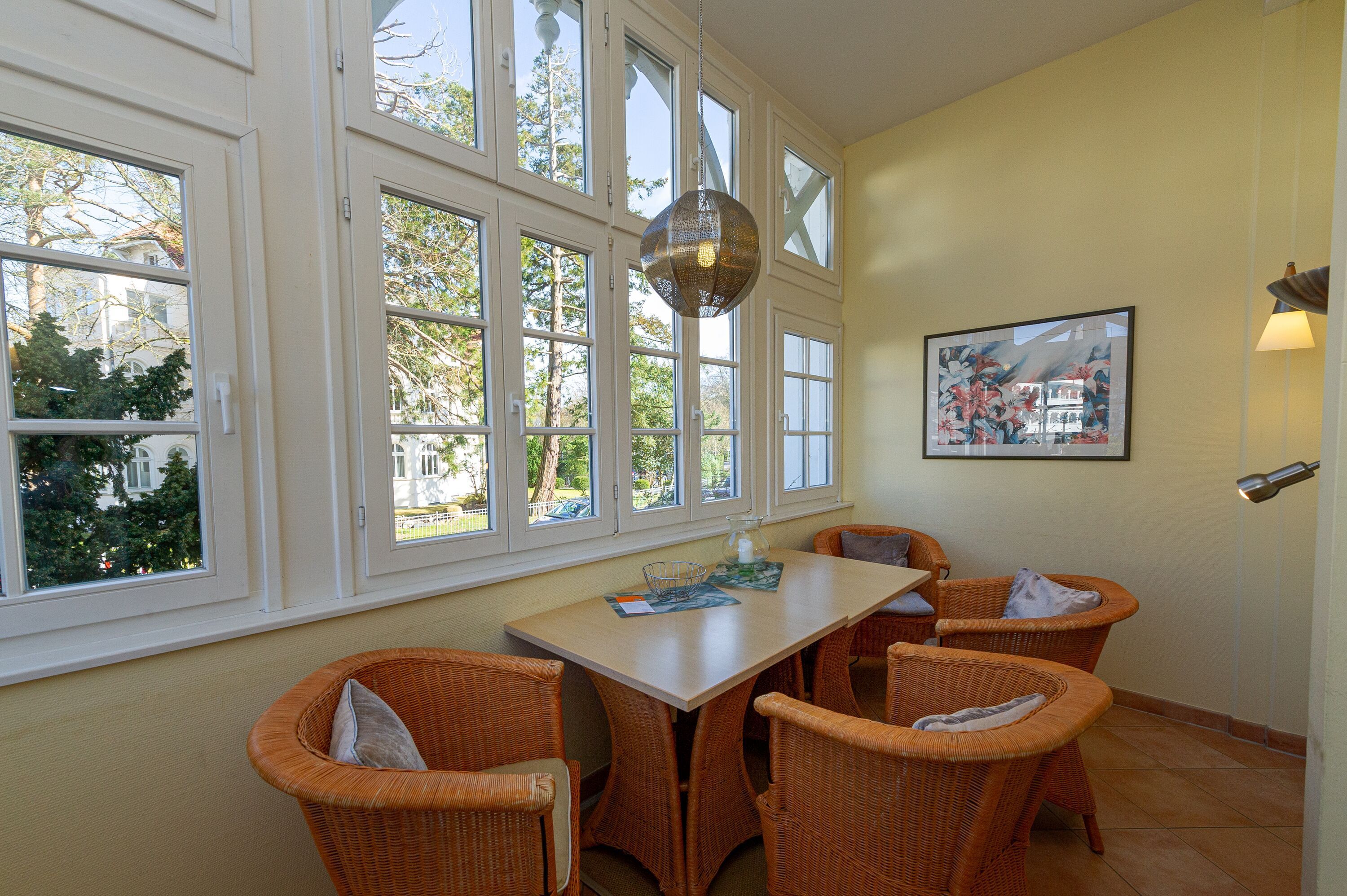 Die Wohnung 03 ist ein rund 56 m² großes 2-Raum Appartement im Erdgeschoss der Villa Malepartus und bezaubert neben ihrer wunderbar zentralen und strandnahen Lage mit gleich zwei verglasten Wintergärten und einer komfortablen Einrichtung.
