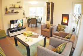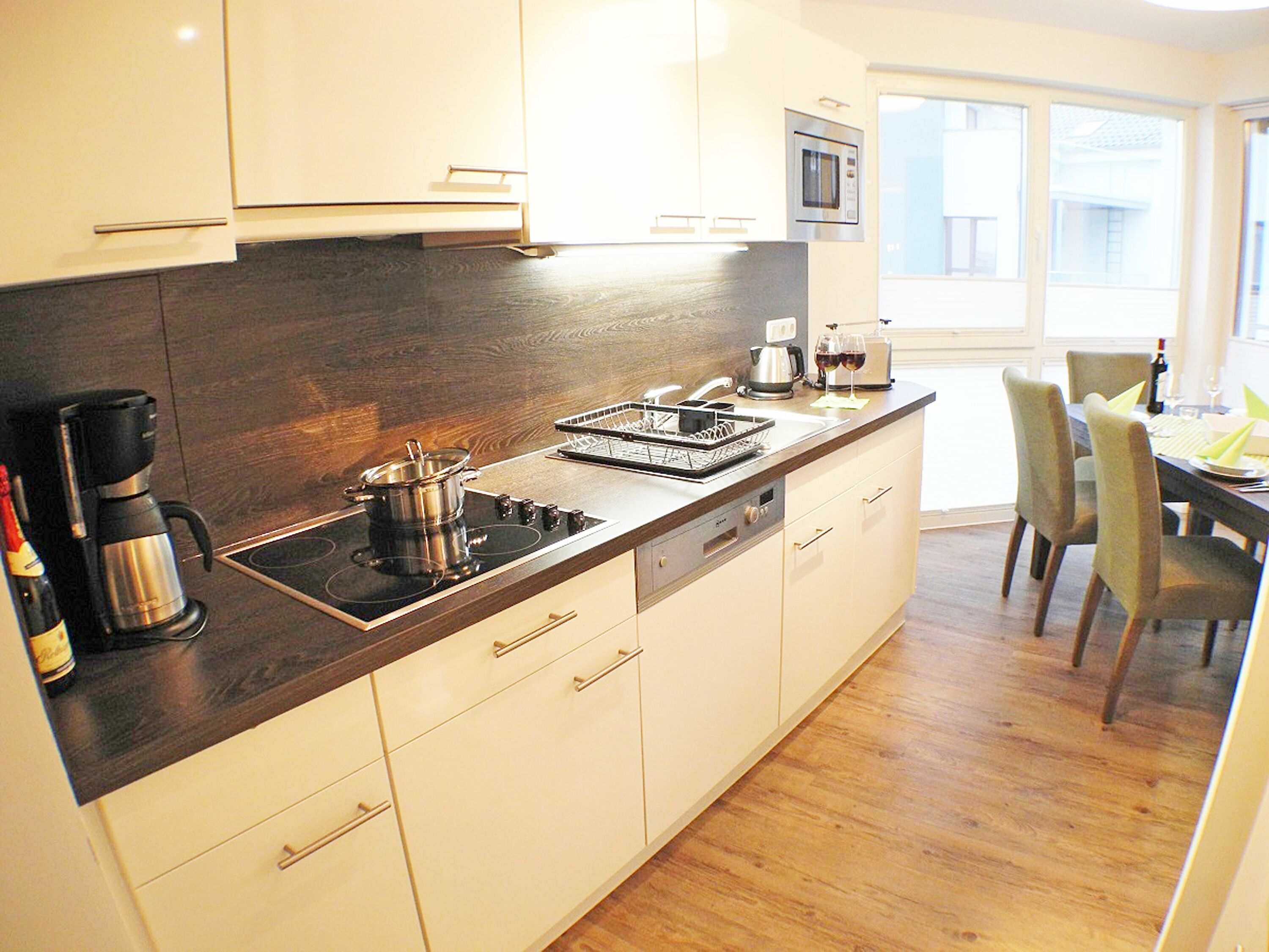Die Wohnung verfügt in der unteren Etage über einen hellen Wohn- und Essbereich, eine offene voll ausgestattete Küche mit Geschirrspüler, Kühlschrank, Backofen, Mikrowelle, Kaffeemaschine, Wasserkocher, Toaster, Stabmixer, Mixer, Waffeleisen und diversem Kleininventar, eine gemütliche Sitzecke mit Kamin und TV, einen kleinen Schlafraum mit zwei Einzelbetten, ein Duschbad mit WC und in der oberen Ebene über zwei weitere Schlafräume (mit jeweils einem Doppelbett) und einem größeren Badezimmer mit Whirlpool, Sauna, separater Dusche und WC.