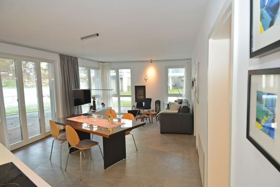 Die moderne Küche mit dem großen Esstisch lädt zum gemeinsamen Kochen auch mit Freunden ein. Zur Ausstattung gehören ein Kühlschrank mit Gefrierfach, Geschirrspüler, Induktionskochfeld, Backofen, Mikrowelle und diverse Kleingeräte.