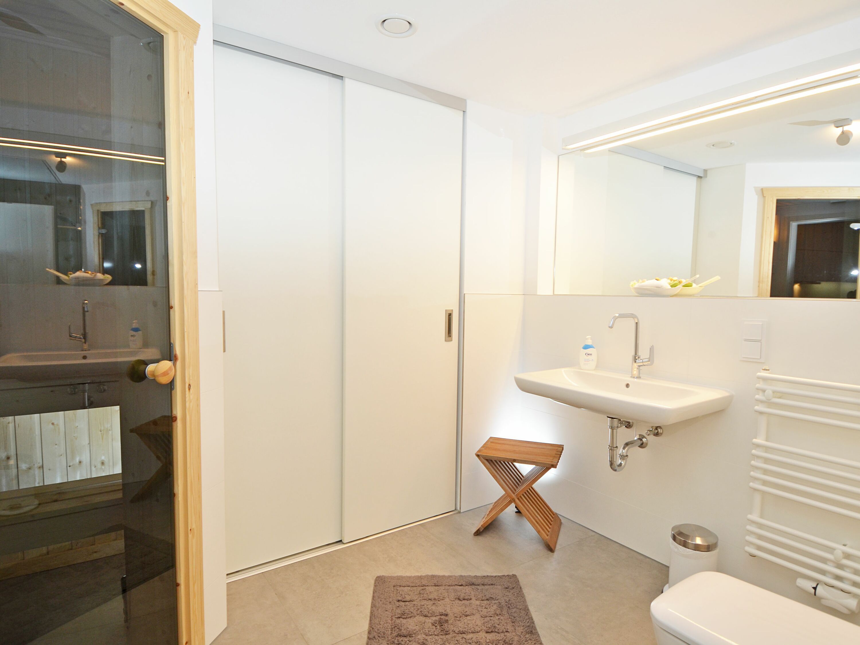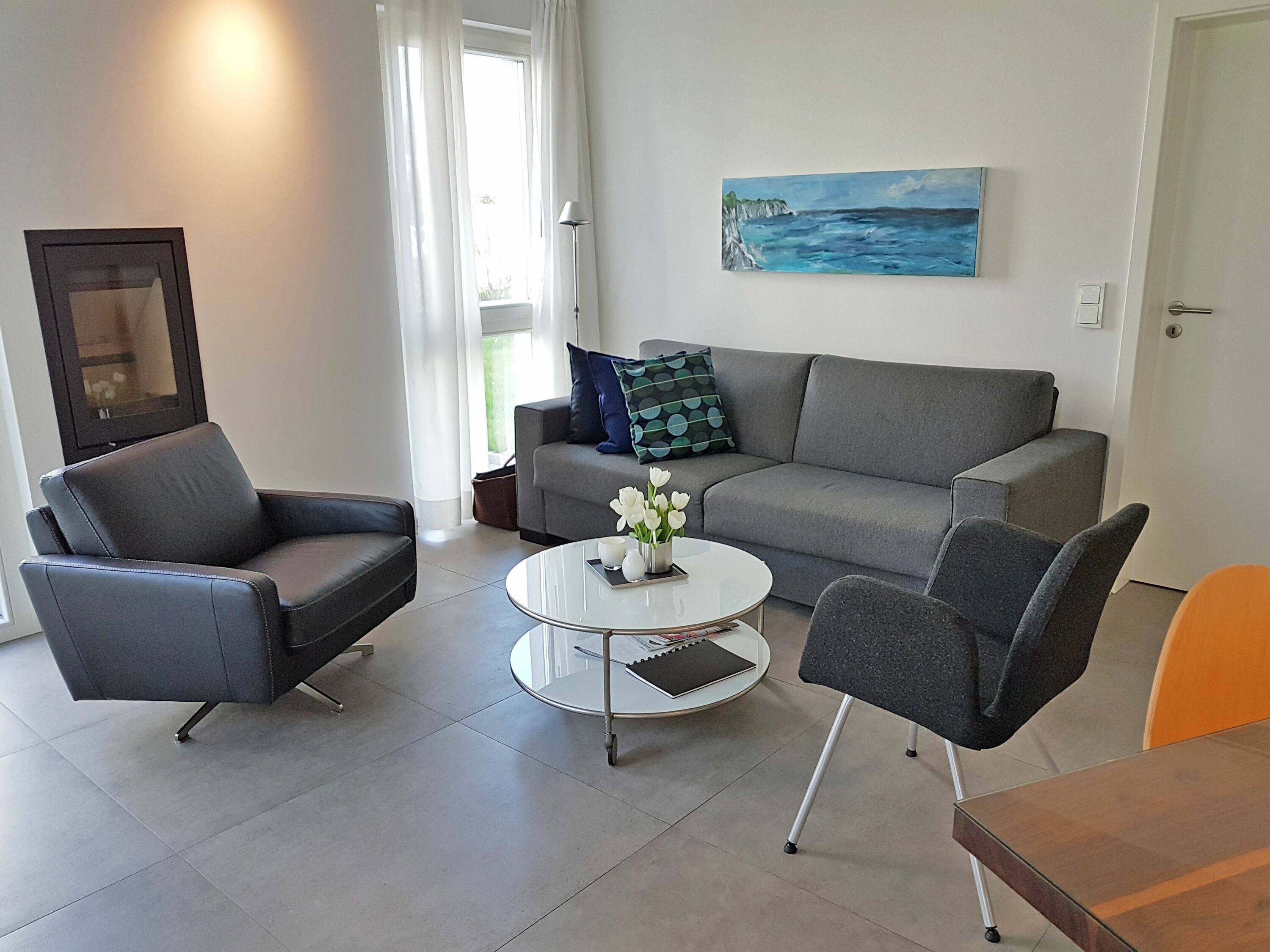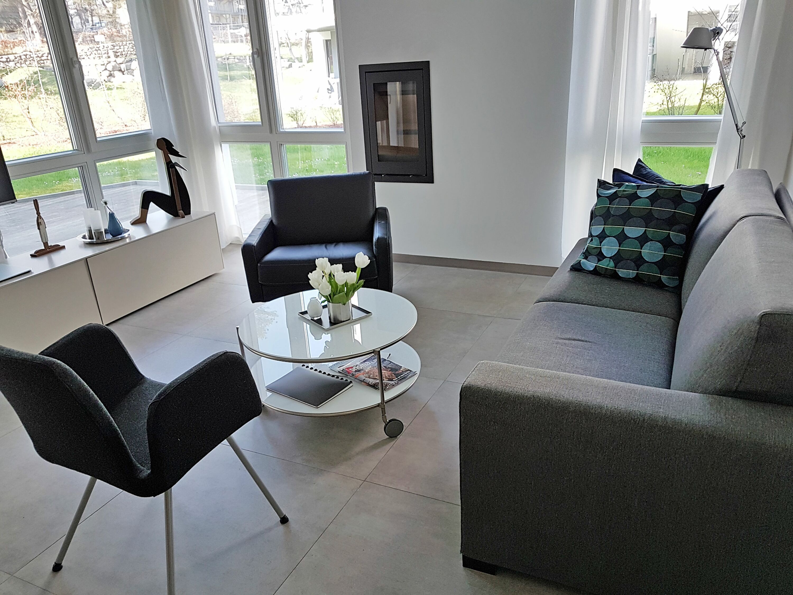 Die Ausstattung mit Sauna und Kamin verleiht dieser großzügig, geradlinig eingerichteten Wohnung auch an kühleren Tagen Gemütlichkeit.