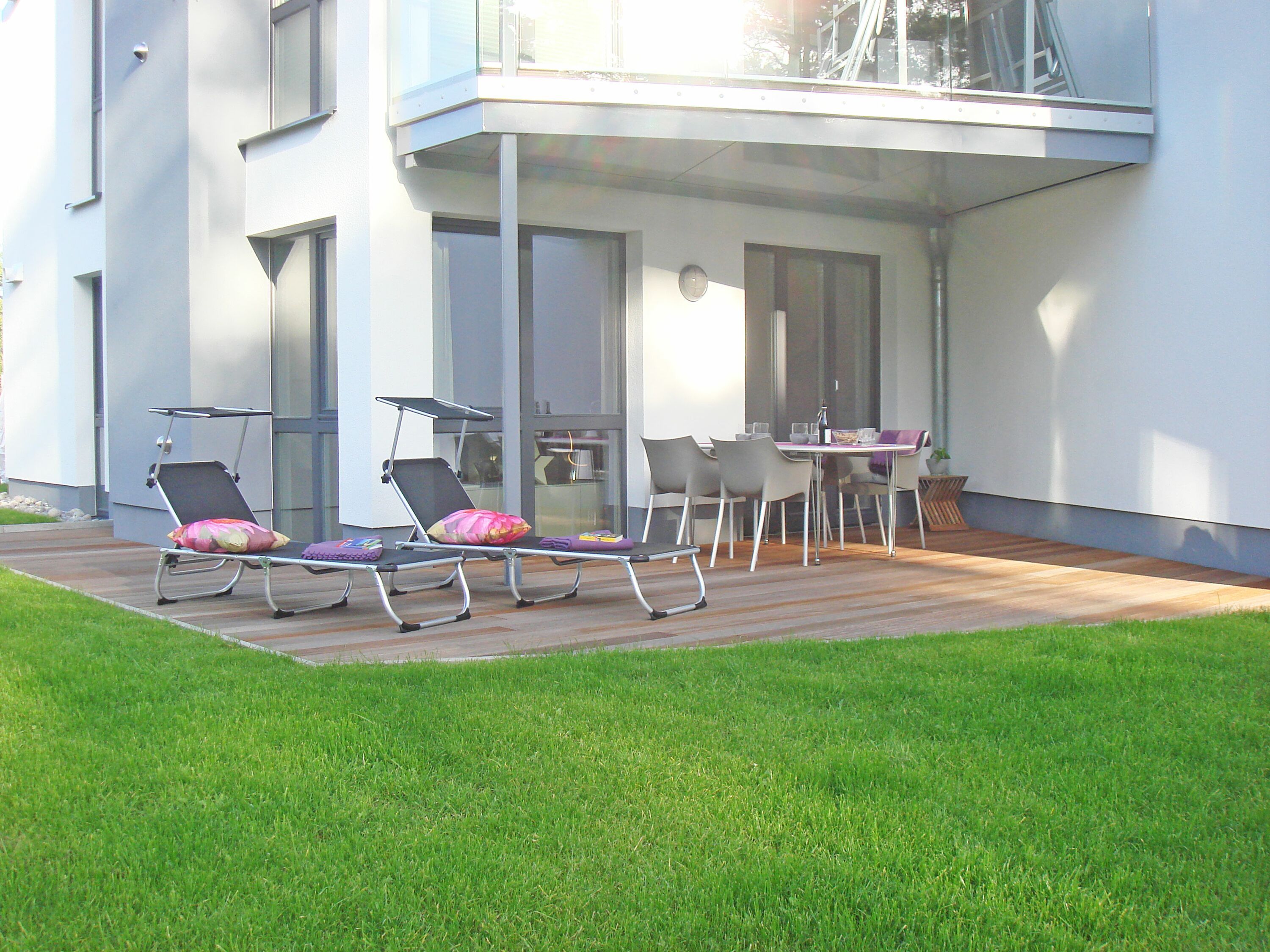 Auch auf der teilweise überdachten Terrasse stehen ein großer Tisch mit Stühlen und zwei Liegen bereit, um in der Abendsonne zu entspannen. Auf dem gärtnerisch großzügig angelegten Grundstück können Sie zwei Grillplätze nutzen.