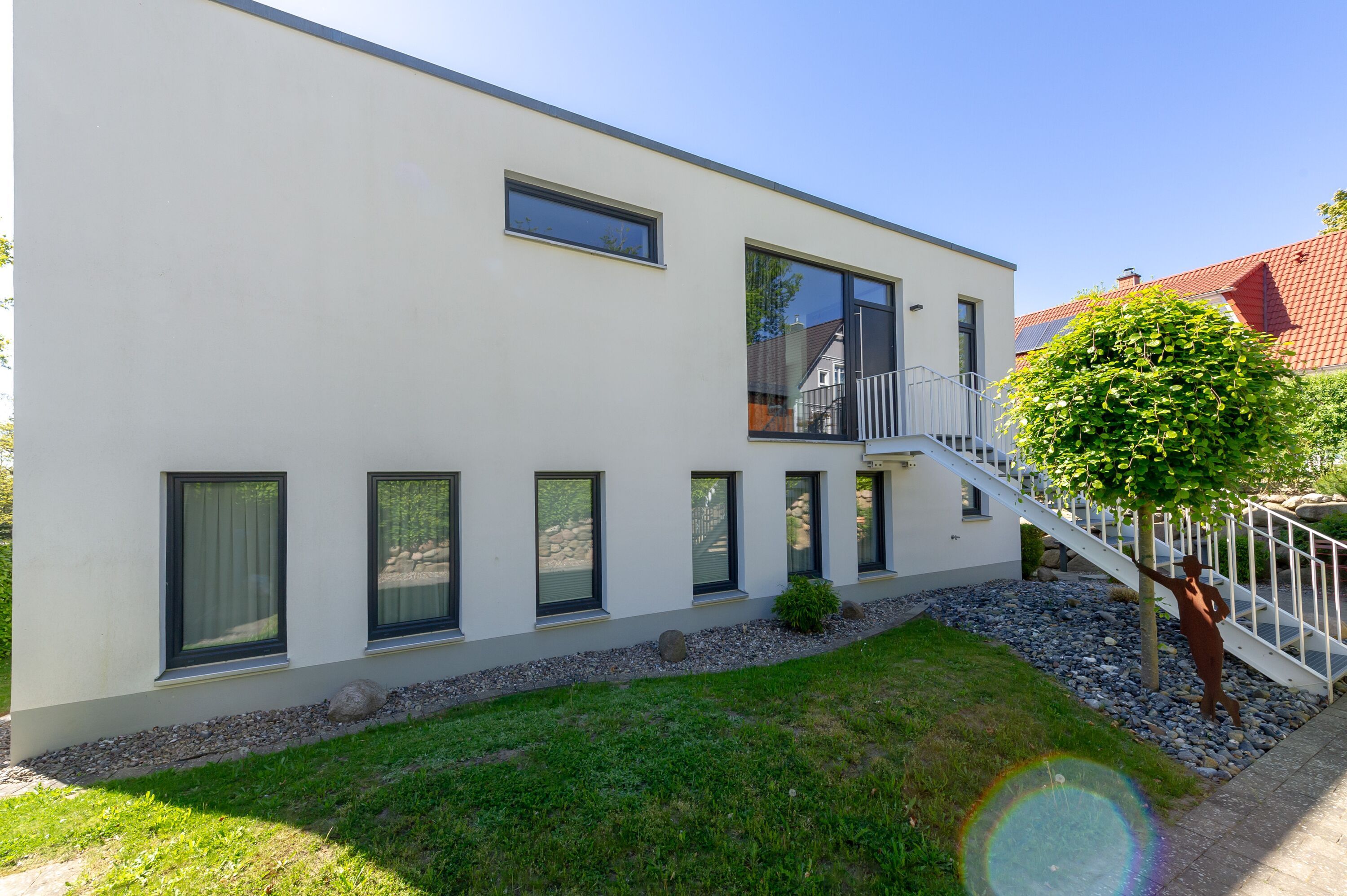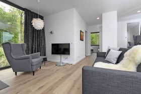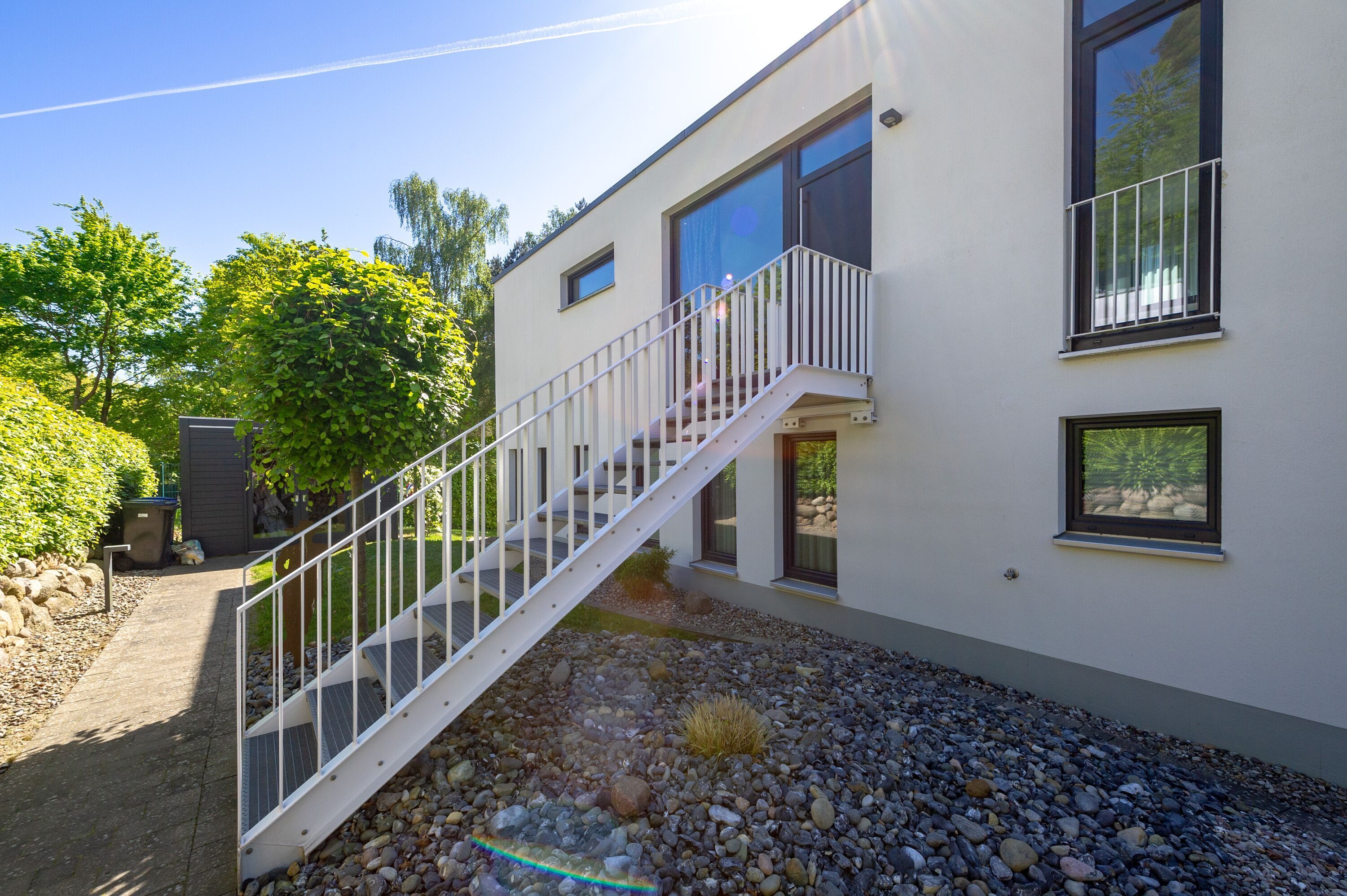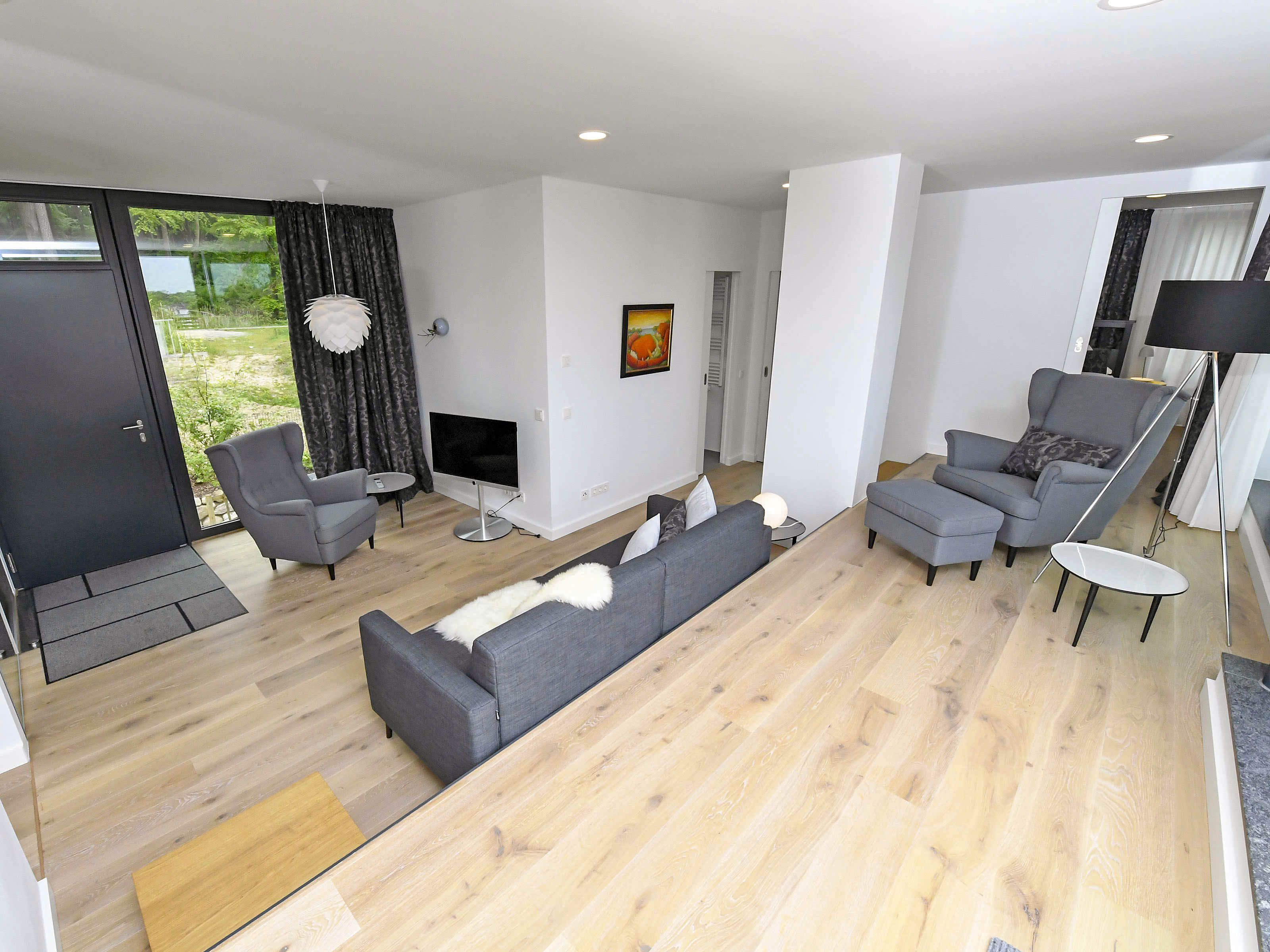 Diese großzügige Wohnung im Obergeschoss mit ca. 76 m² Wohnfläche betreten Sie über eine Außentreppe mit separatem Eingang. Die Eingangsebene verfügt über einen offenen Wohnbereich mit hochwertiger Sitzgruppe und einem großformatigen Plasma-TV. In der angrenzenden voll ausgestatteten und aufwändig gefertigten Einbauküche sind ein Kühlschrank, eine Geschirrspülmaschine, ein 4-Zonen-Cerankochfeld mit Backofen, eine Waschmaschine, ein Nespresso-Automat, eine Filterkaffeemaschine sowie Wasserkocher, Toaster und diverses Kleininventar vorhanden.