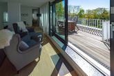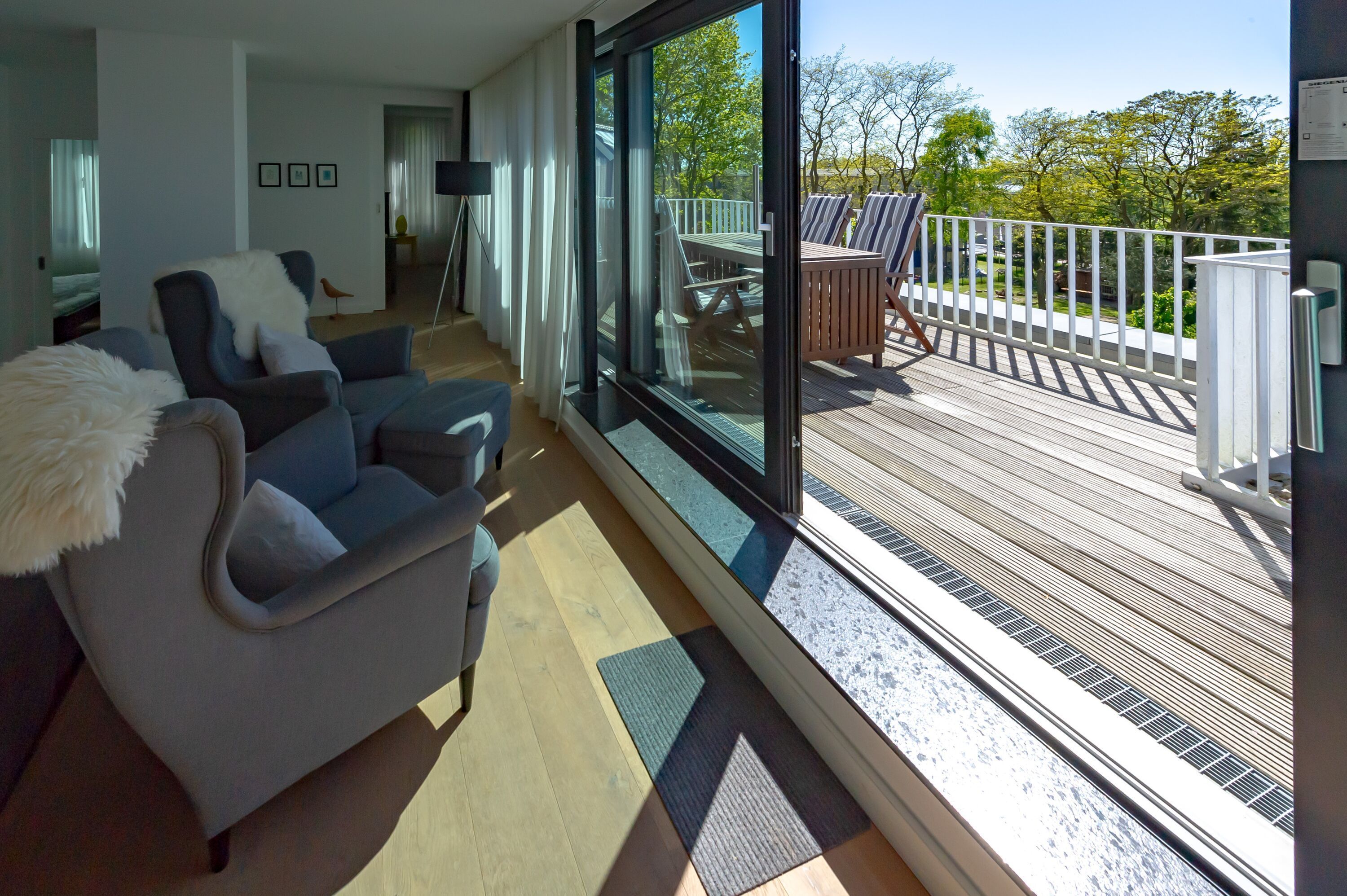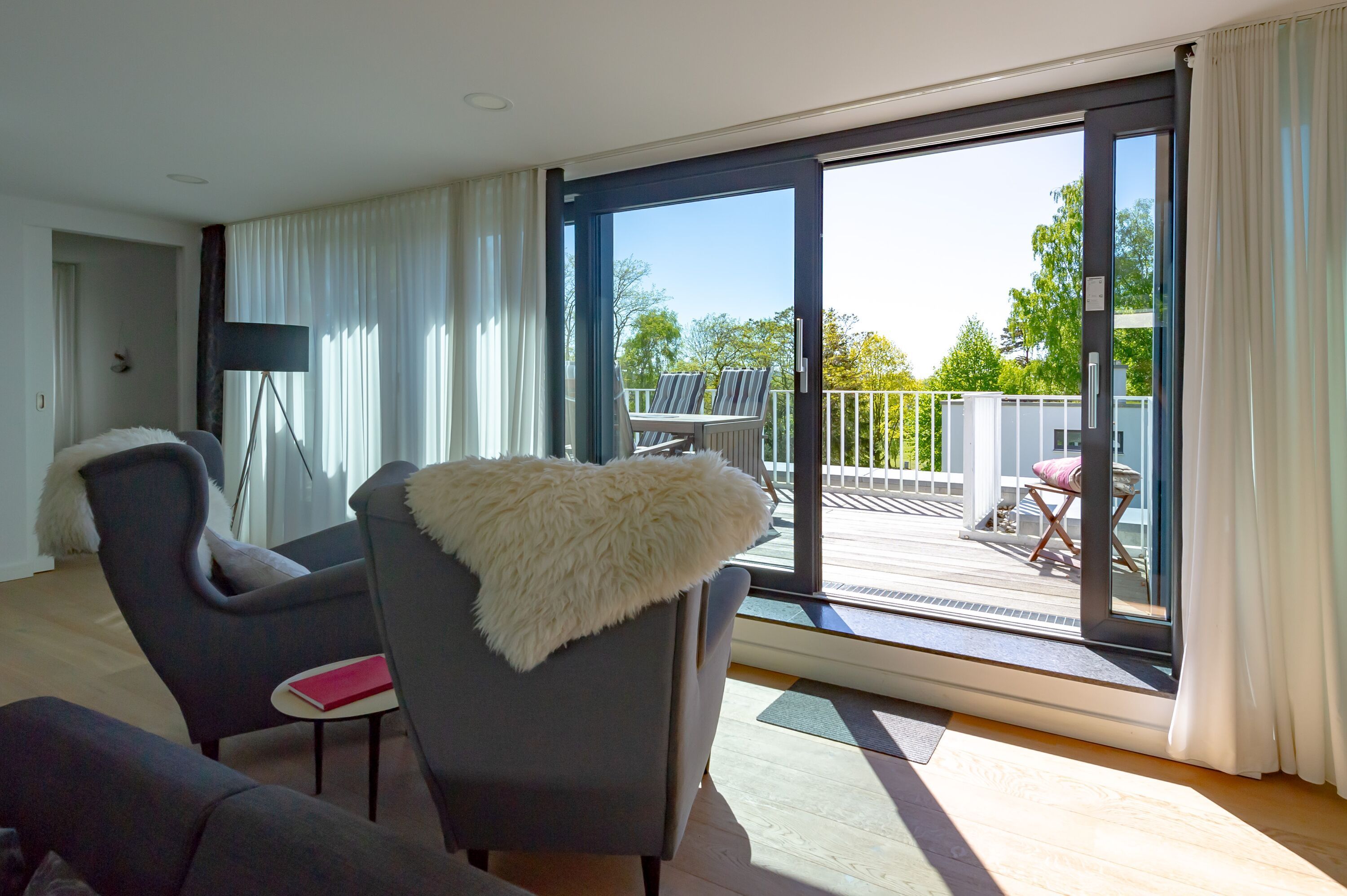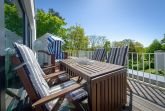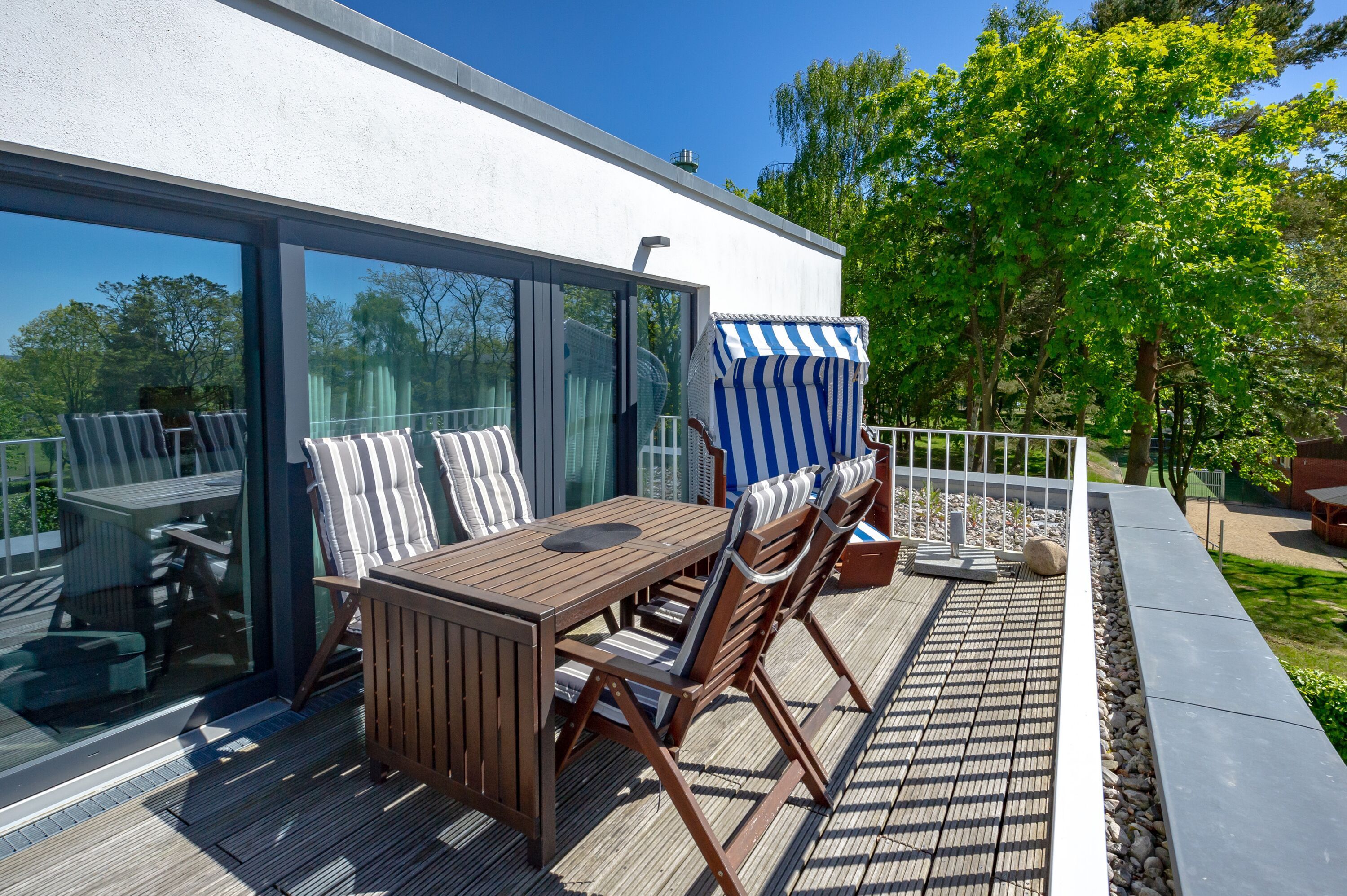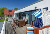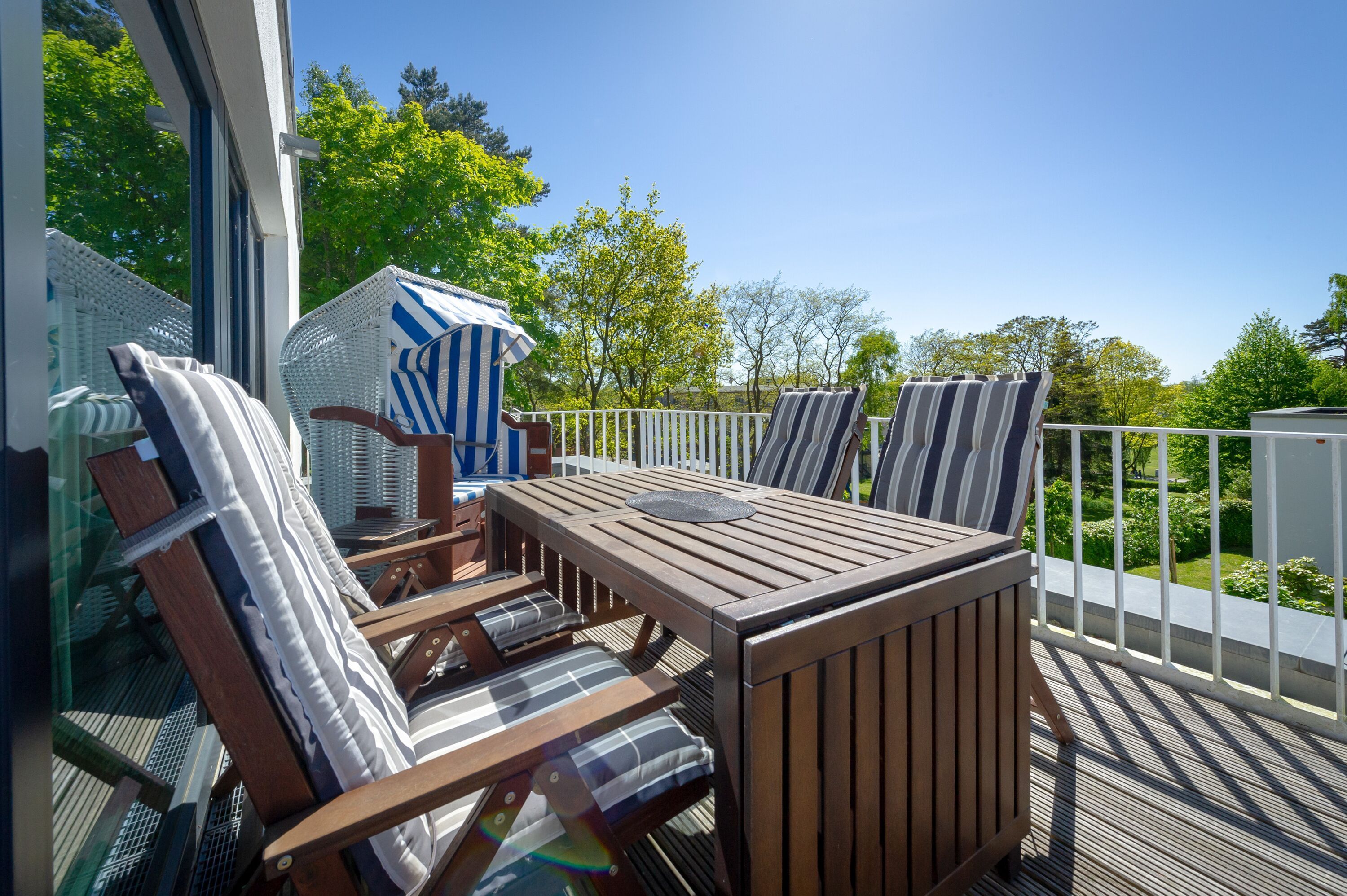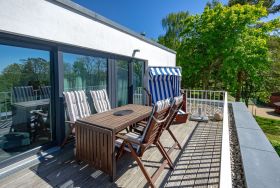 Die vom Wohnbereich zu erreichende Halbebene verfügt über einen Essbereich mit Esstisch sowie einen Lesebereich mit zwei Sesseln. Auf der Dachterrasse mit Südwestausrichtung und Strandkorb genießen Sie den wunderschönen Ausblick über Sellin. Die Balkon- bzw. Terrassenmöbel stehen saisonal - in der Regel von Mai bis Ende September - zur Verfügung.