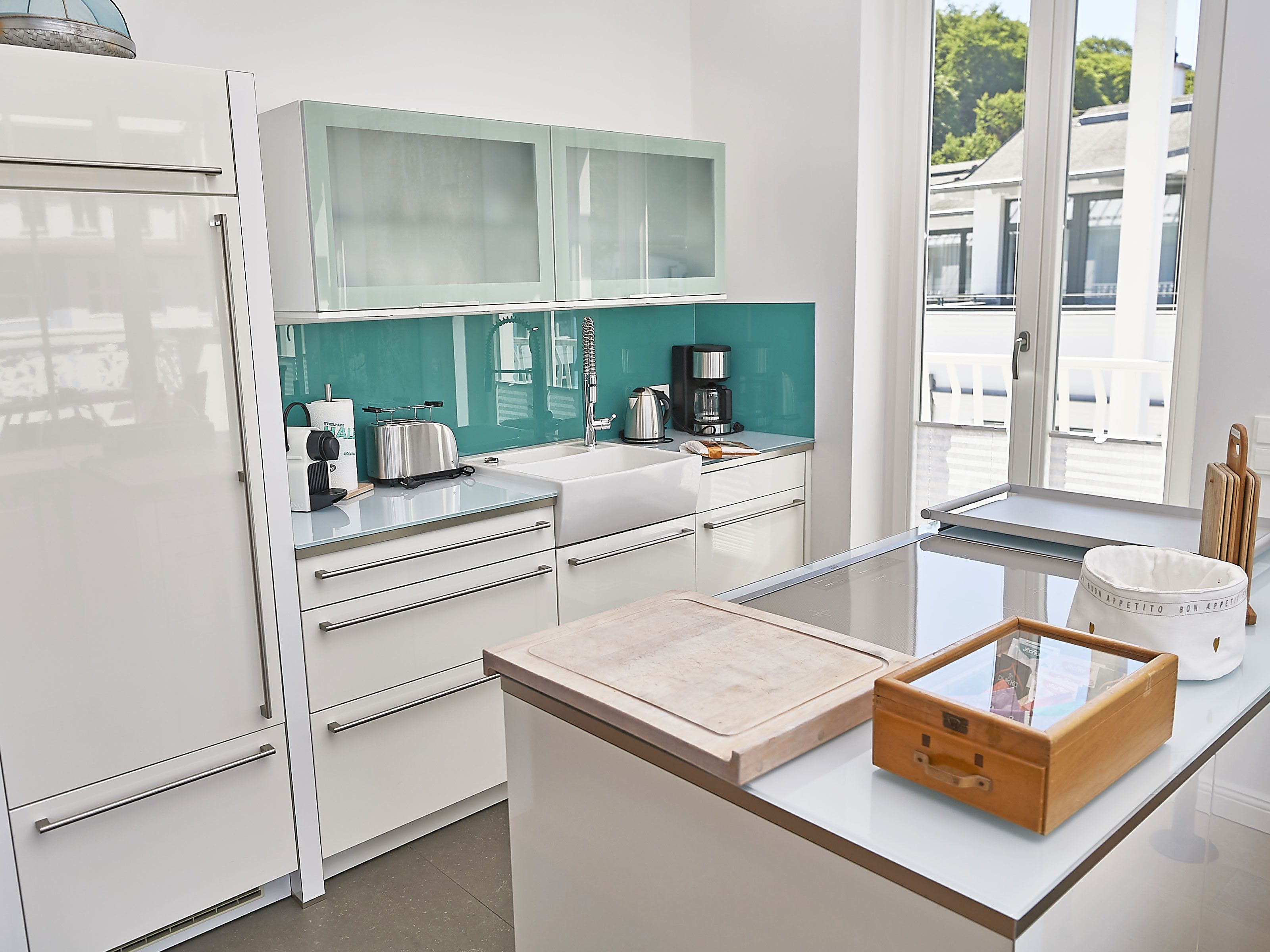 Die mit hochwertigen AEG- und Siemensgeräten ausgestattete Einbauküche mit hochwertigem Geschirr und Lambertbesteck sind nur ein Exempel Ihrer Möglichkeiten, sich hier bedingungslos wohlzufühlen.